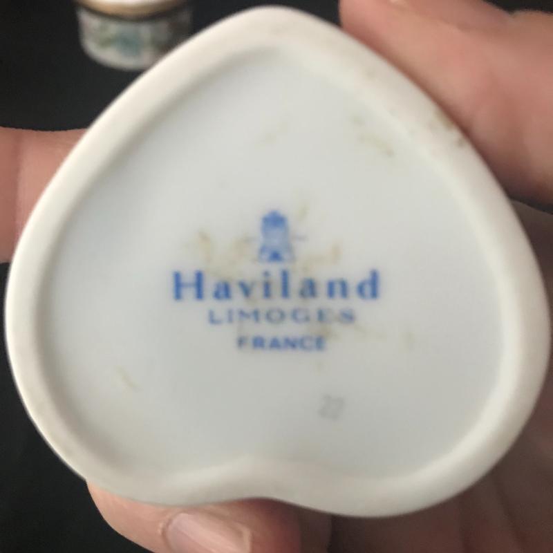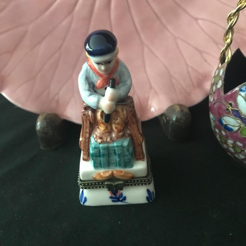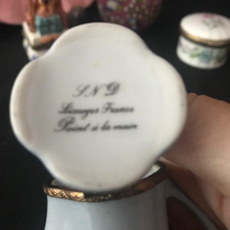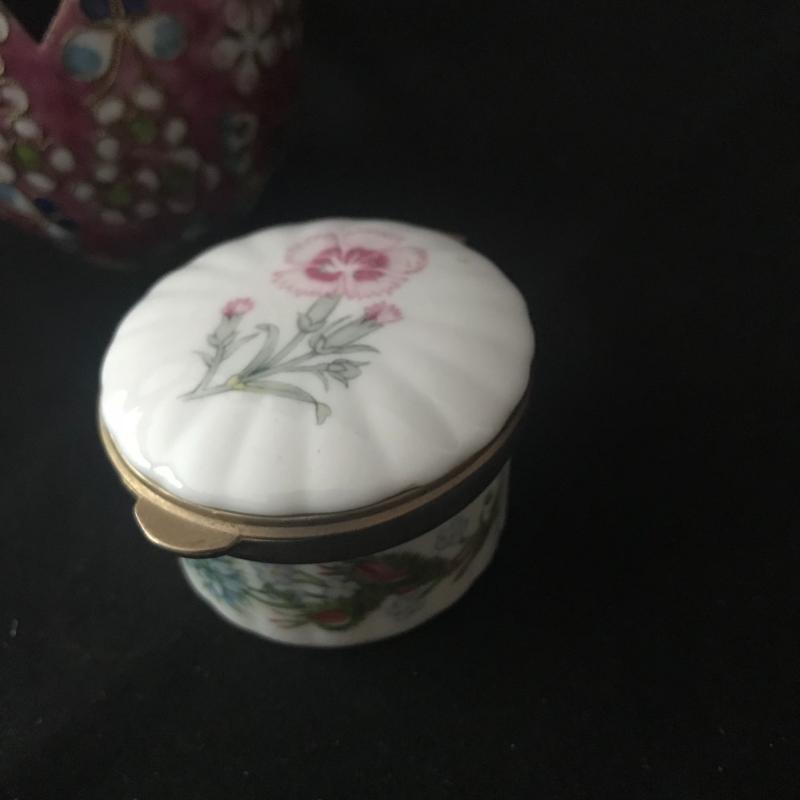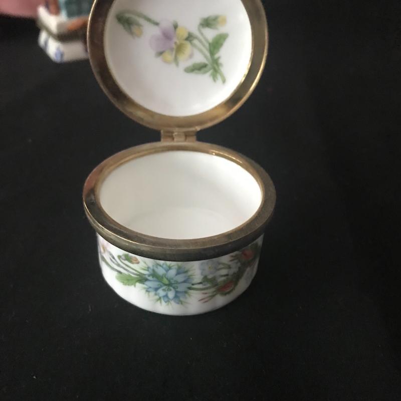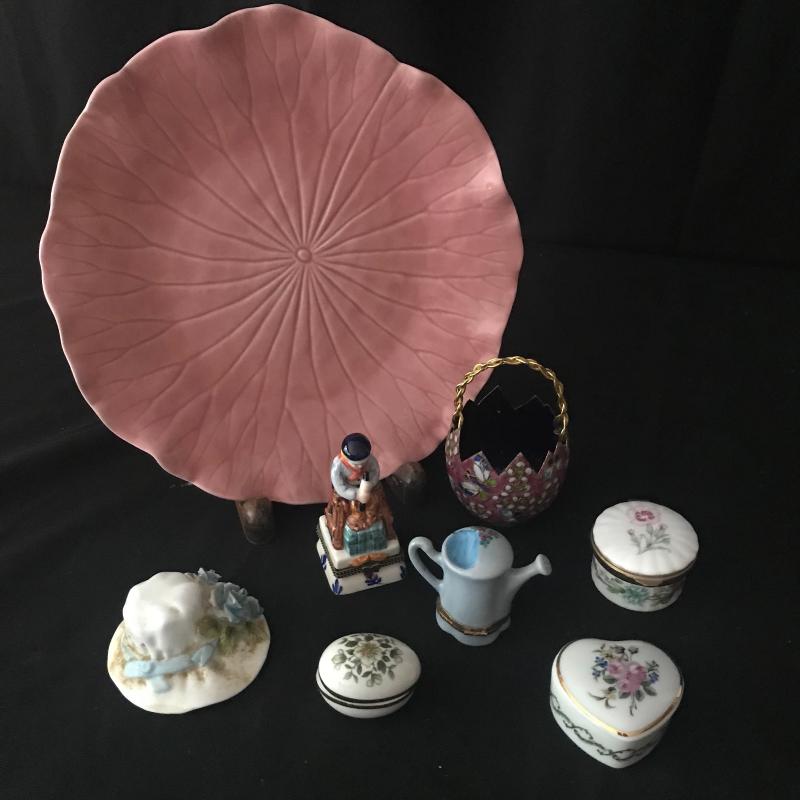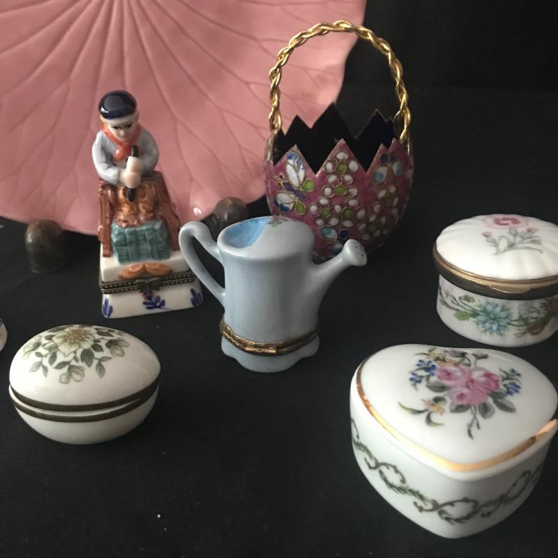 Three Limoges pill boxes and two English ones. A small metal and enamel basket and a leaflike plate. Shipping available.