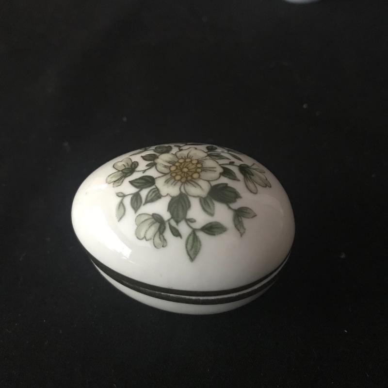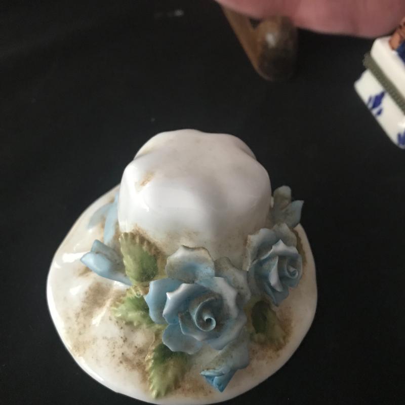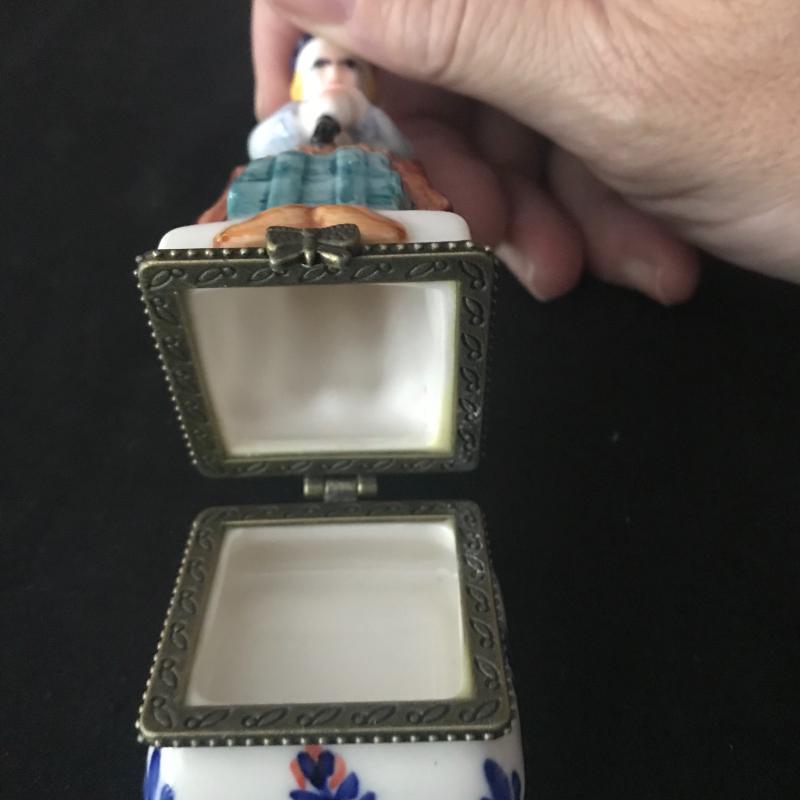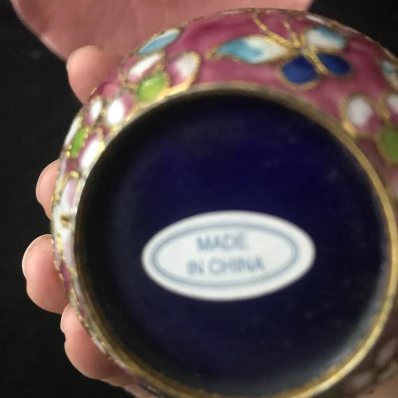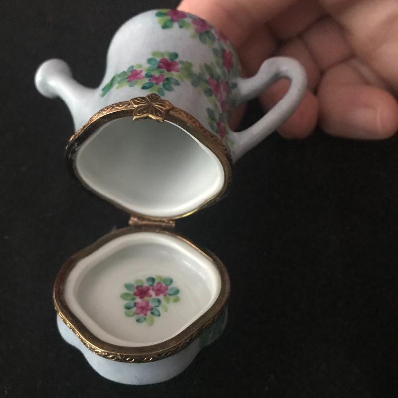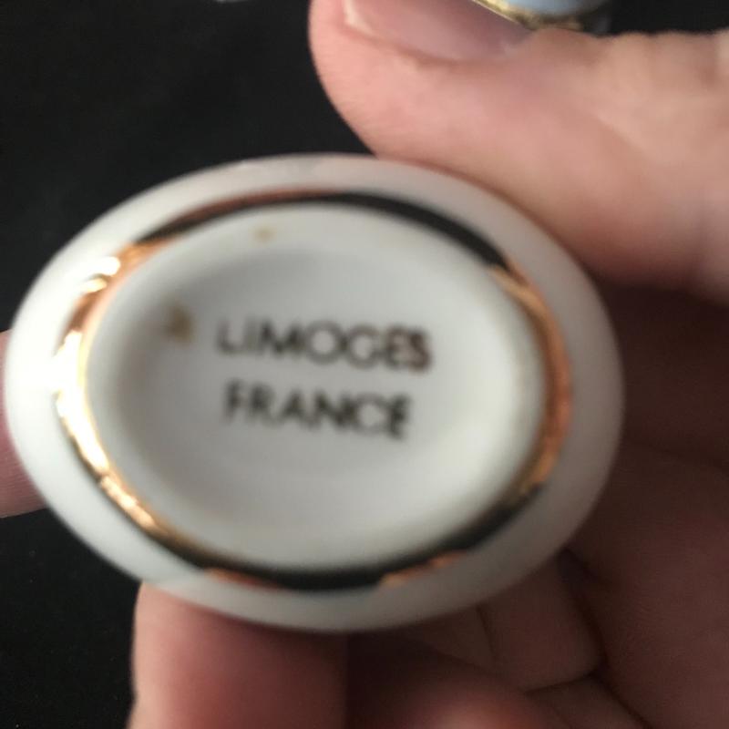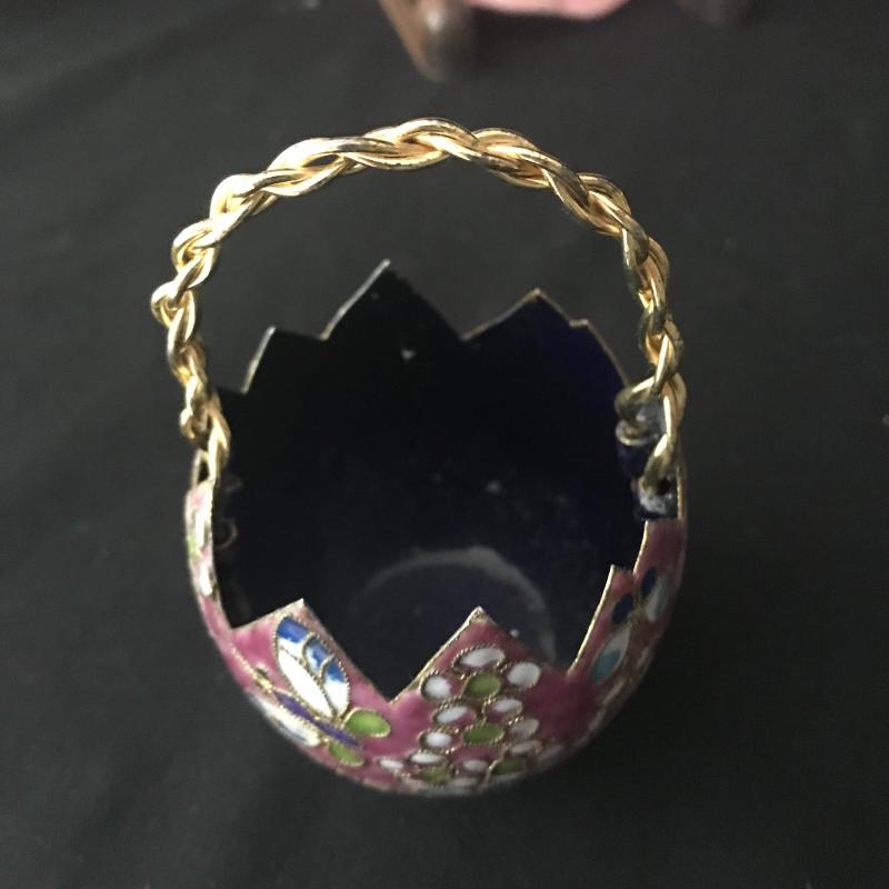 Three Limoges pill boxes and two English ones. A small metal and enamel basket and a leaflike plate. Shipping available.