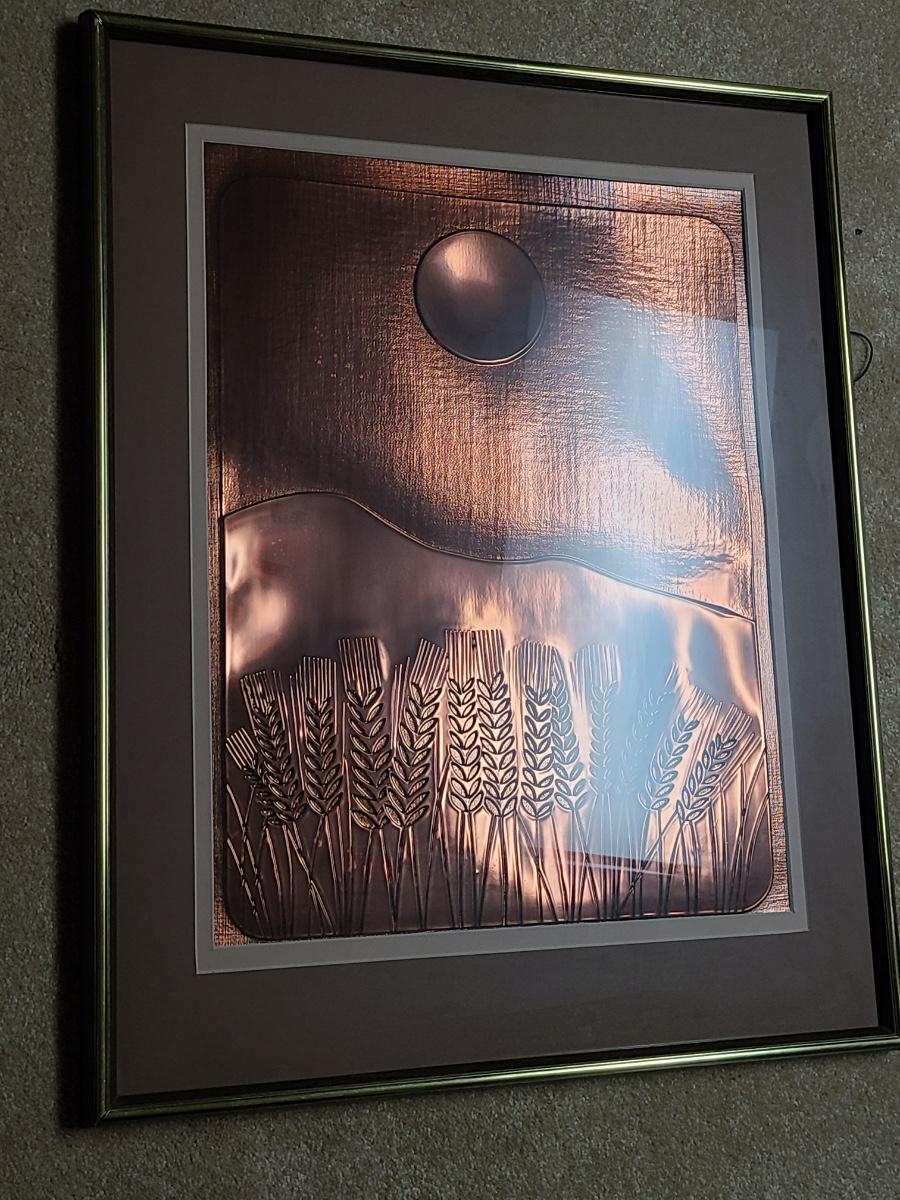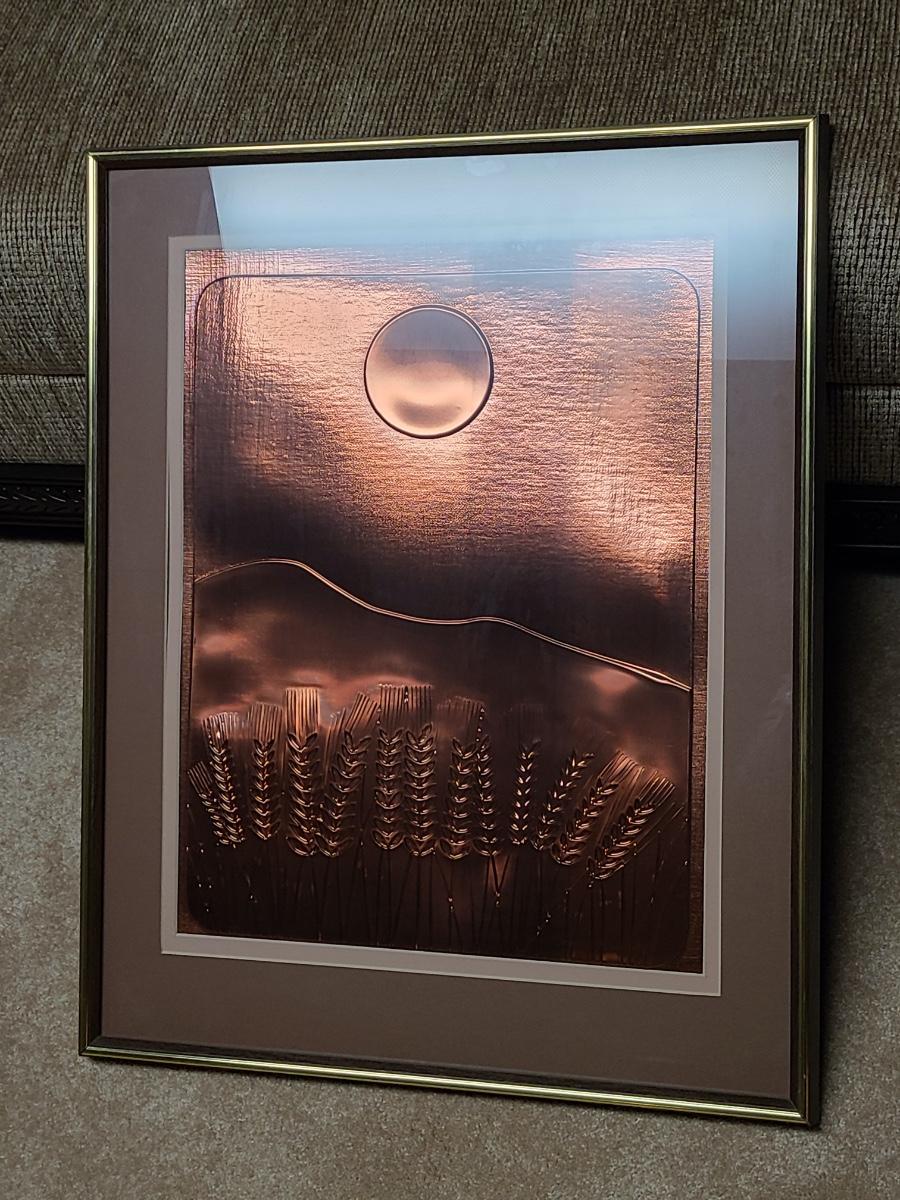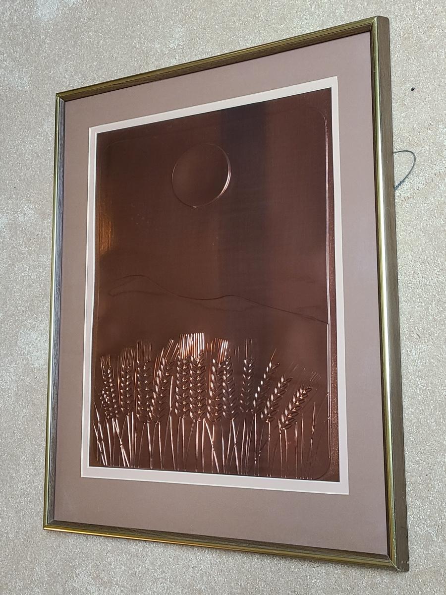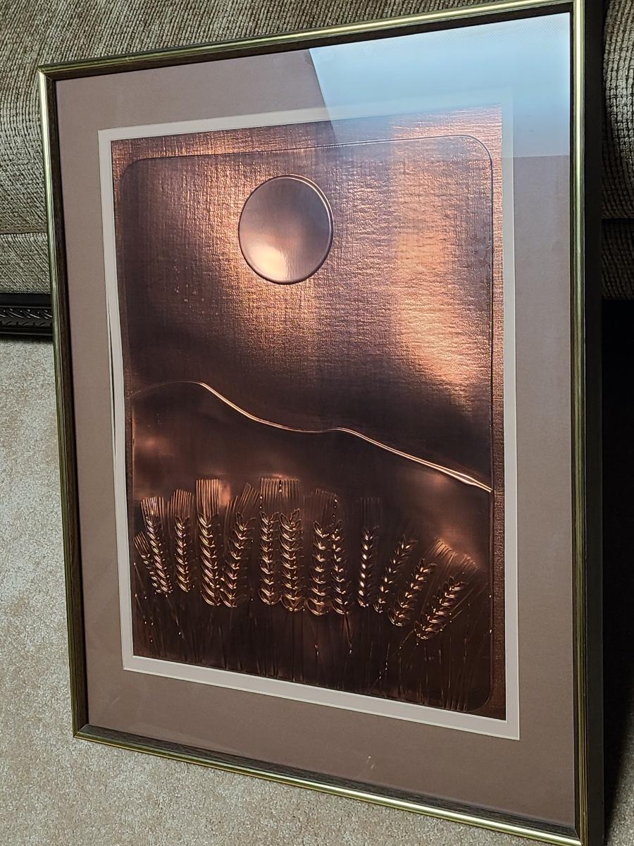 This vintage artwork "glows" in certain lights. The artwork is copper in color and looks like metal, but is cardboard/cardstock most likely. It is matted with a light weight frame and under glass. The back shows some wear, but has the original information on back. Photos taken at different angles to show the piece. Please see all pictures as they are the best representation of the items. The pictures show condition, measurements if taken, and what is included in the lot. Due to the large amount that we photograph and the time frame, we are not always able to take measurements. All items unless noted, are pre-owned and have been used. If you purchased furniture, you must bring help. We do not allow one person to carry large furniture out on their own. Bring help, tools and a truck for the safety of our client’s homes, and your personal safety. Company policy. Thank you.
