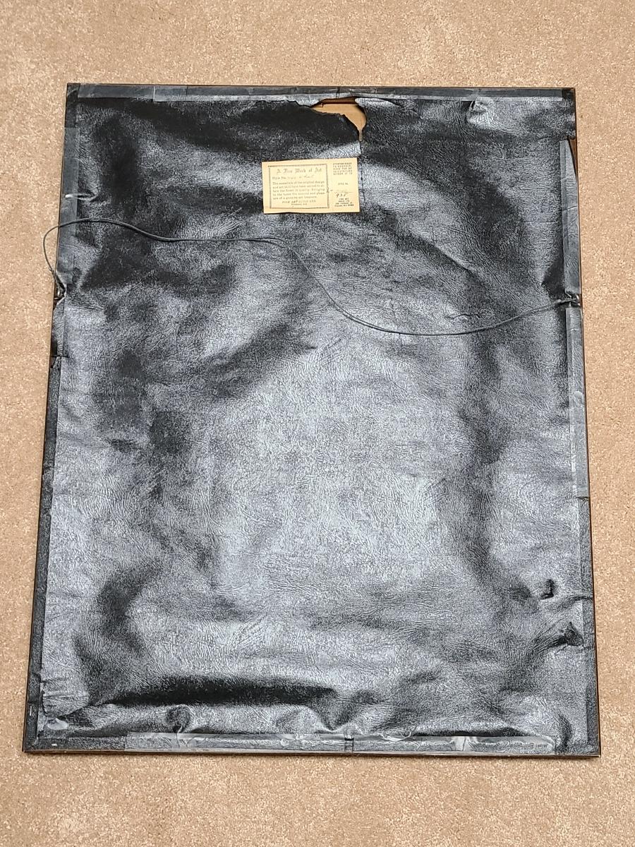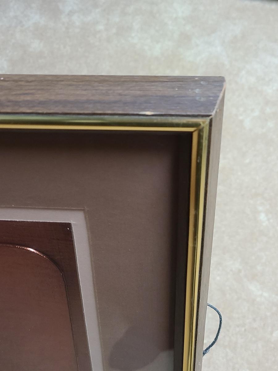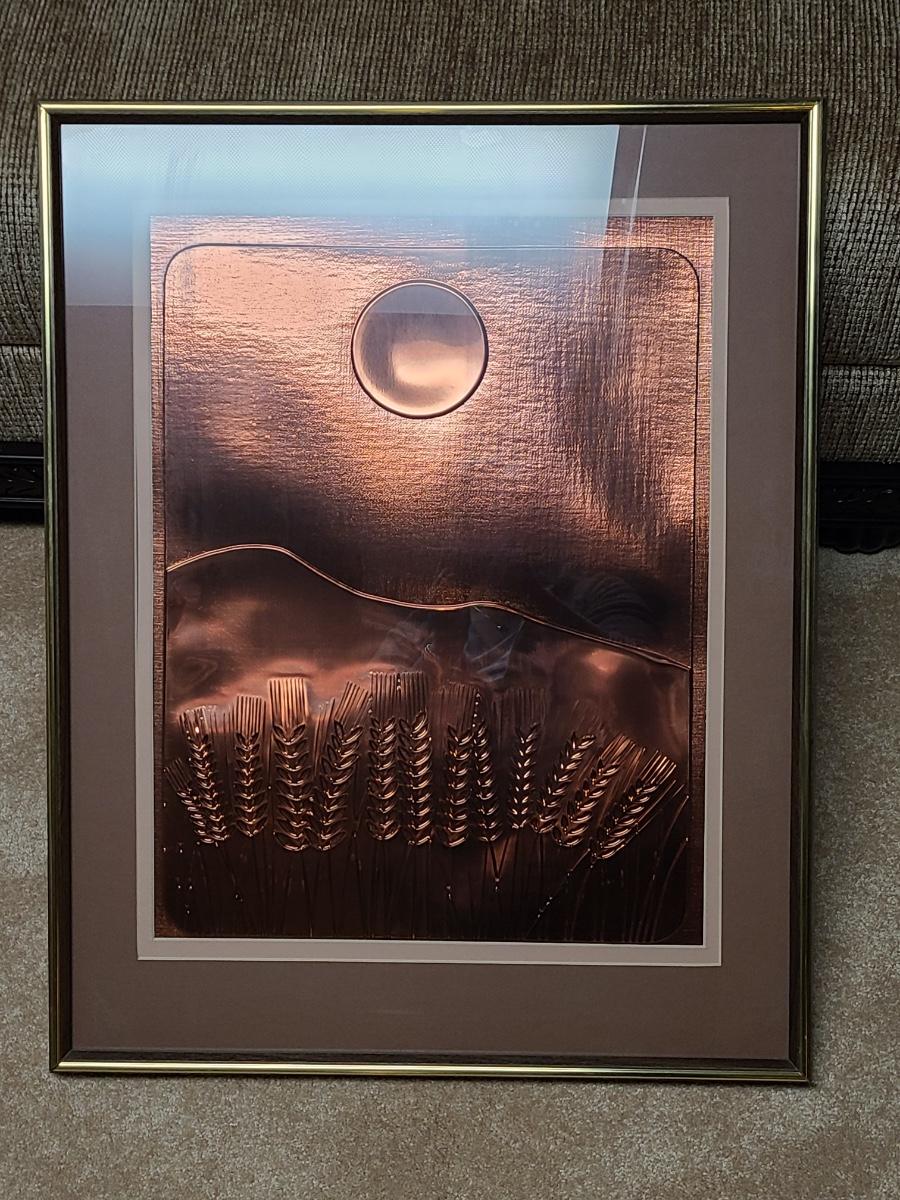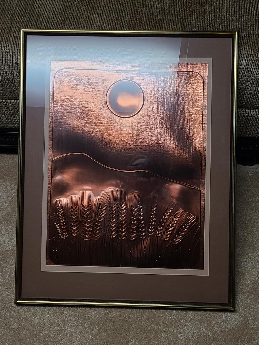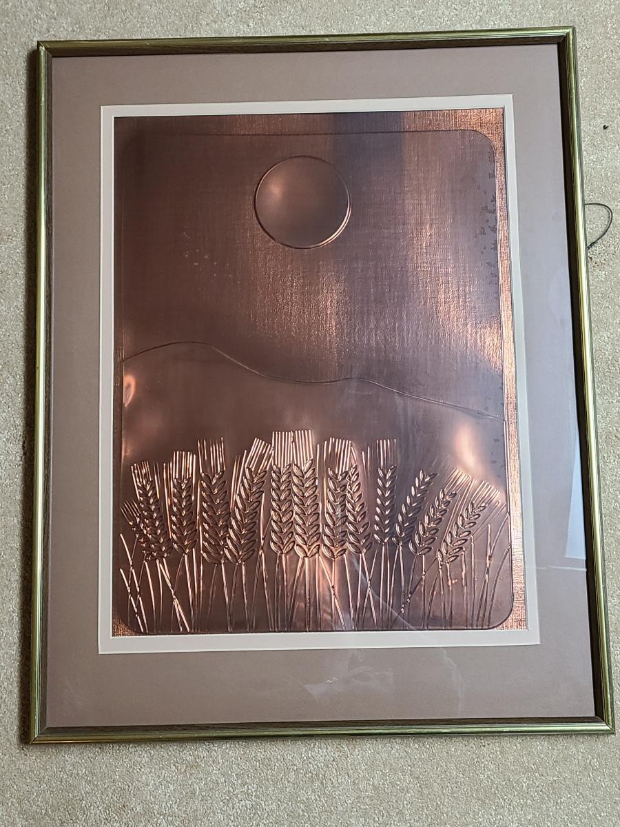 This vintage artwork "glows" in certain lights. The artwork is copper in color and looks like metal, but is cardboard/cardstock most likely. It is matted with a light weight frame and under glass. The back shows some wear, but has the original information on back. Photos taken at different angles to show the piece. Please see all pictures as they are the best representation of the items. The pictures show condition, measurements if taken, and what is included in the lot. Due to the large amount that we photograph and the time frame, we are not always able to take measurements. All items unless noted, are pre-owned and have been used. If you purchased furniture, you must bring help. We do not allow one person to carry large furniture out on their own. Bring help, tools and a truck for the safety of our client’s homes, and your personal safety. Company policy. Thank you.