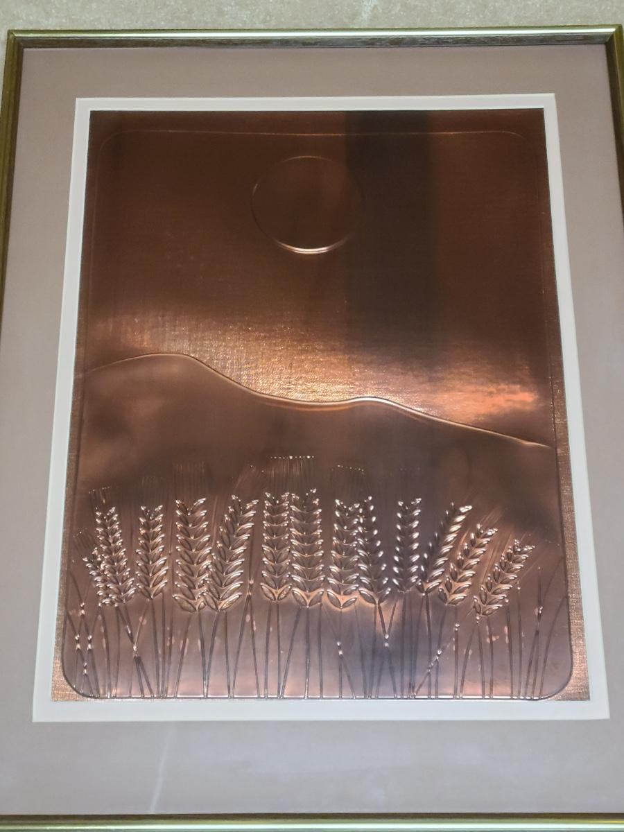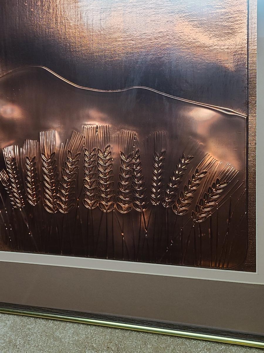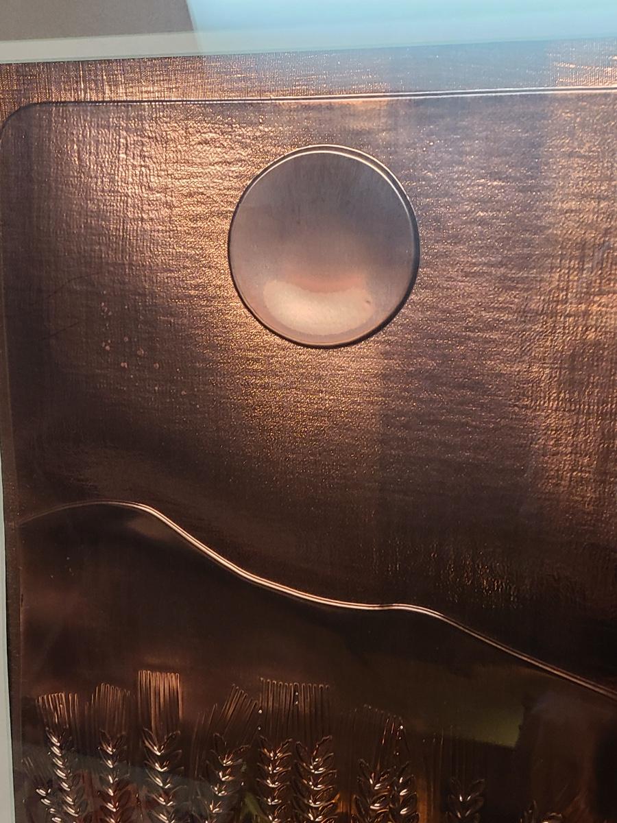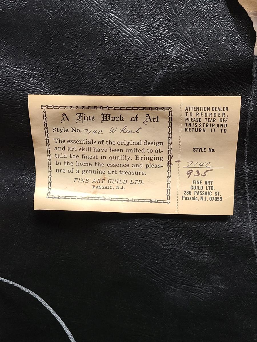 This vintage artwork "glows" in certain lights. The artwork is copper in color and looks like metal, but is cardboard/cardstock most likely. It is matted with a light weight frame and under glass. The back shows some wear, but has the original information on back. Photos taken at different angles to show the piece. Please see all pictures as they are the best representation of the items. The pictures show condition, measurements if taken, and what is included in the lot. Due to the large amount that we photograph and the time frame, we are not always able to take measurements. All items unless noted, are pre-owned and have been used. If you purchased furniture, you must bring help. We do not allow one person to carry large furniture out on their own. Bring help, tools and a truck for the safety of our client’s homes, and your personal safety. Company policy. Thank you.