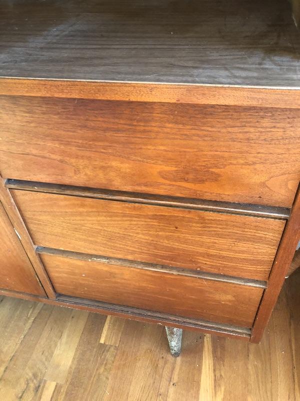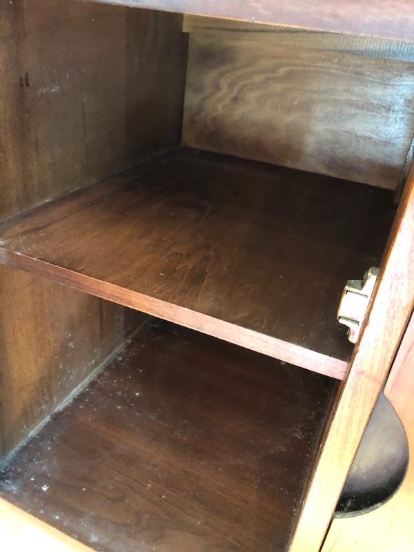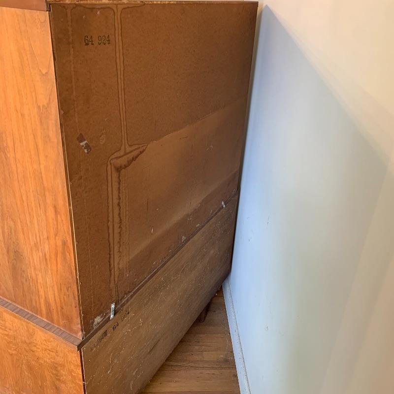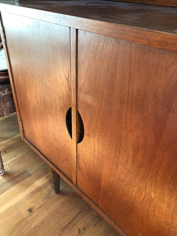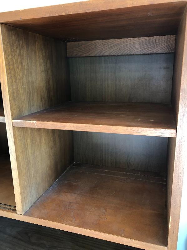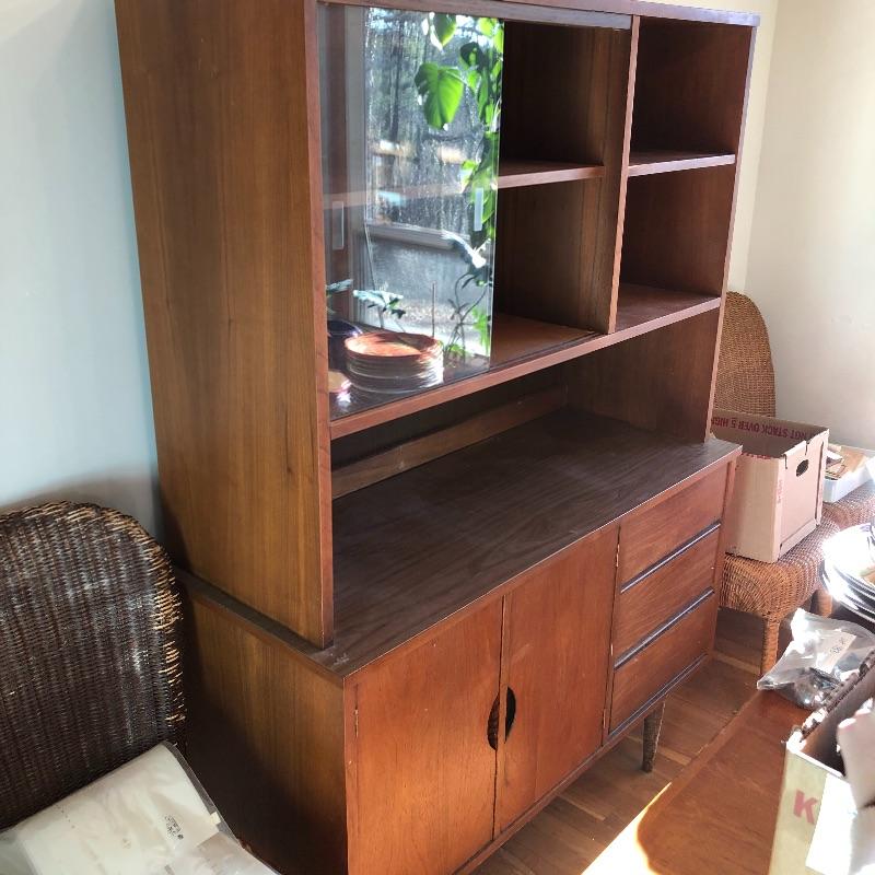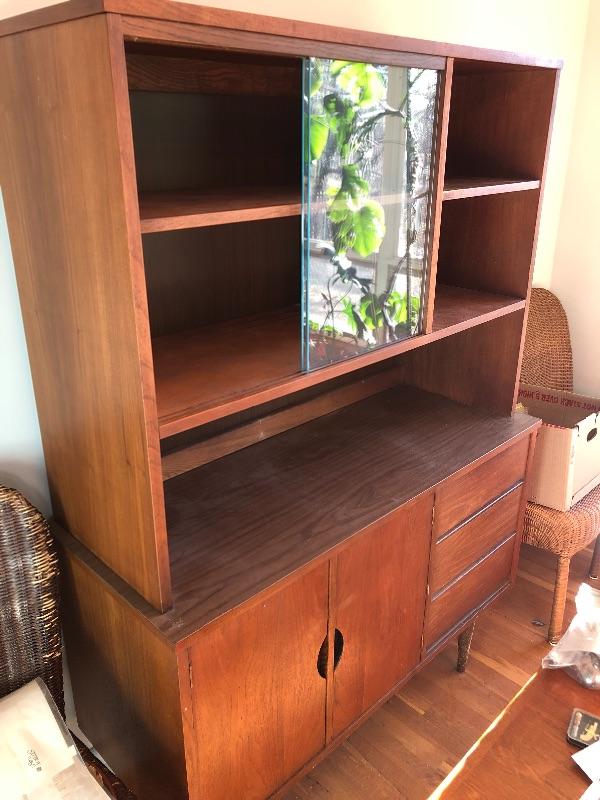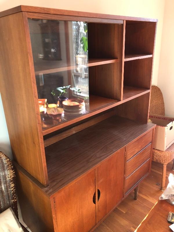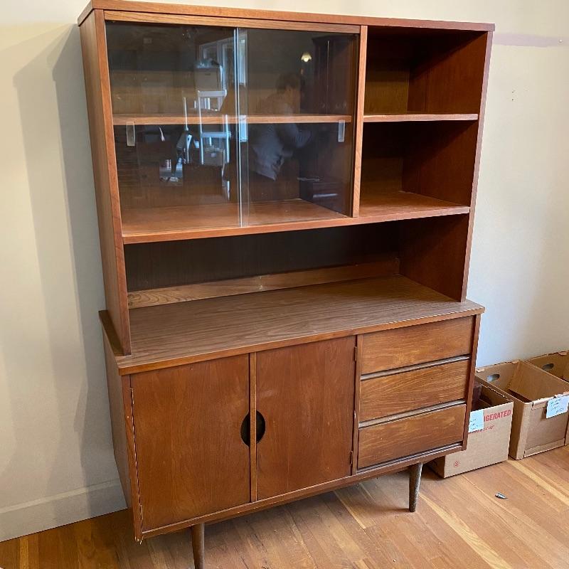 This lot contains a beautiful wooden China cabinet made by Stanley. The top section (44” x 15” x 35”) has a sliding glass door as well as a desk-type area and several small shelves for multiple different uses. The bottom section (46” x 18” x 30”) has three pull-out dovetailed drawers for small items or silverware, as well as two opening cabinets with adequate storage space. This cabinet is in amazing condition and would look amazing in any home! Two pieces with top piece attached to bottom with brackets. See photos. Local pickup only.