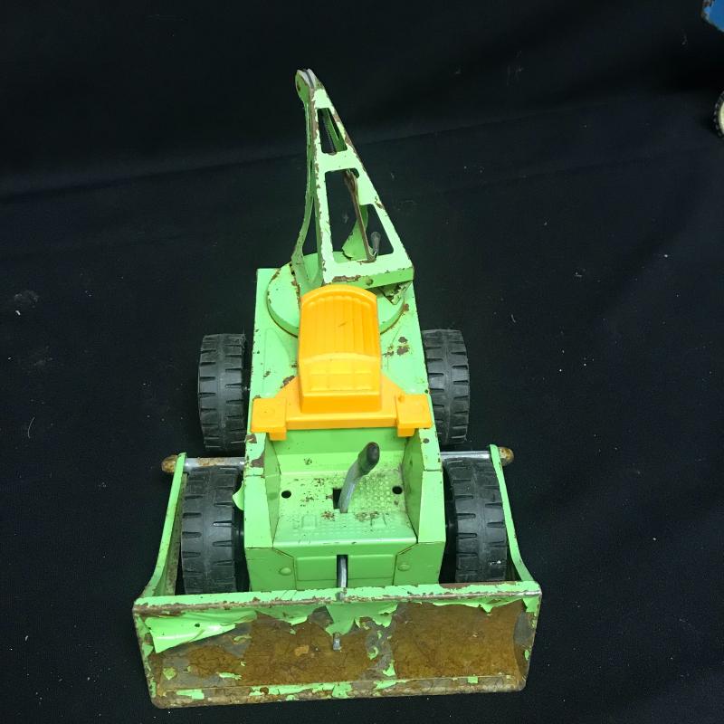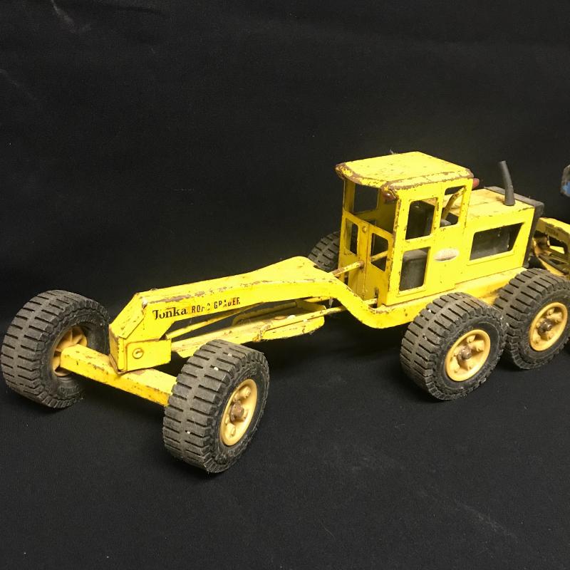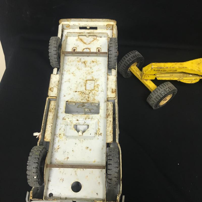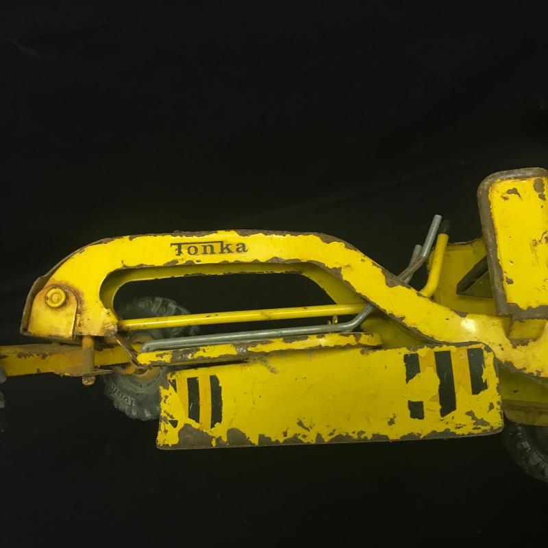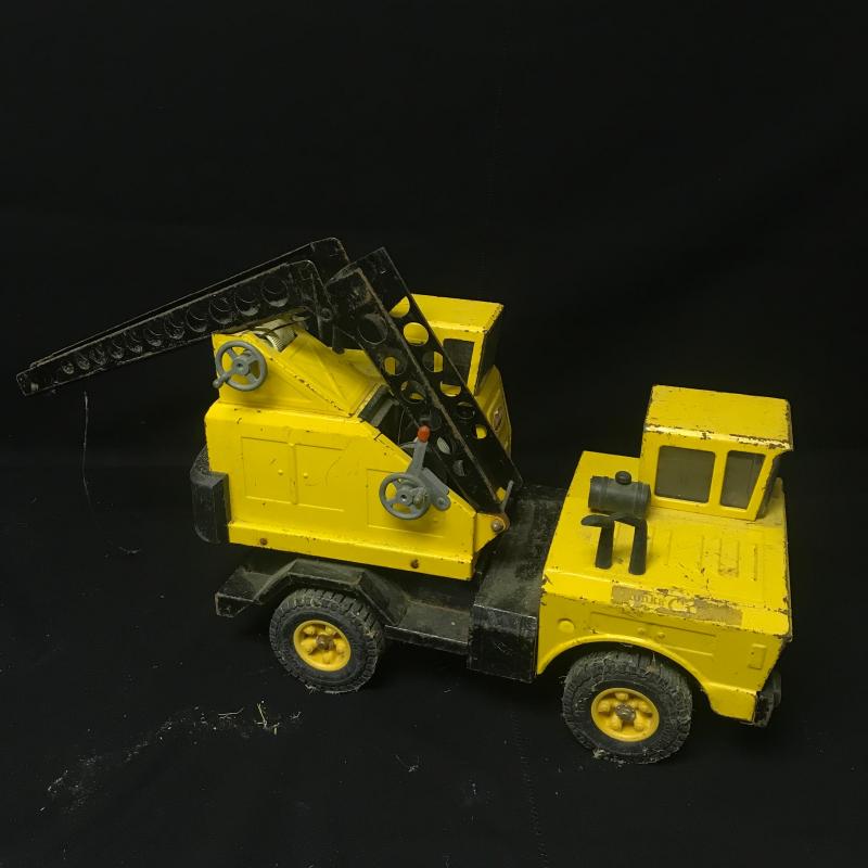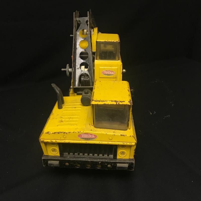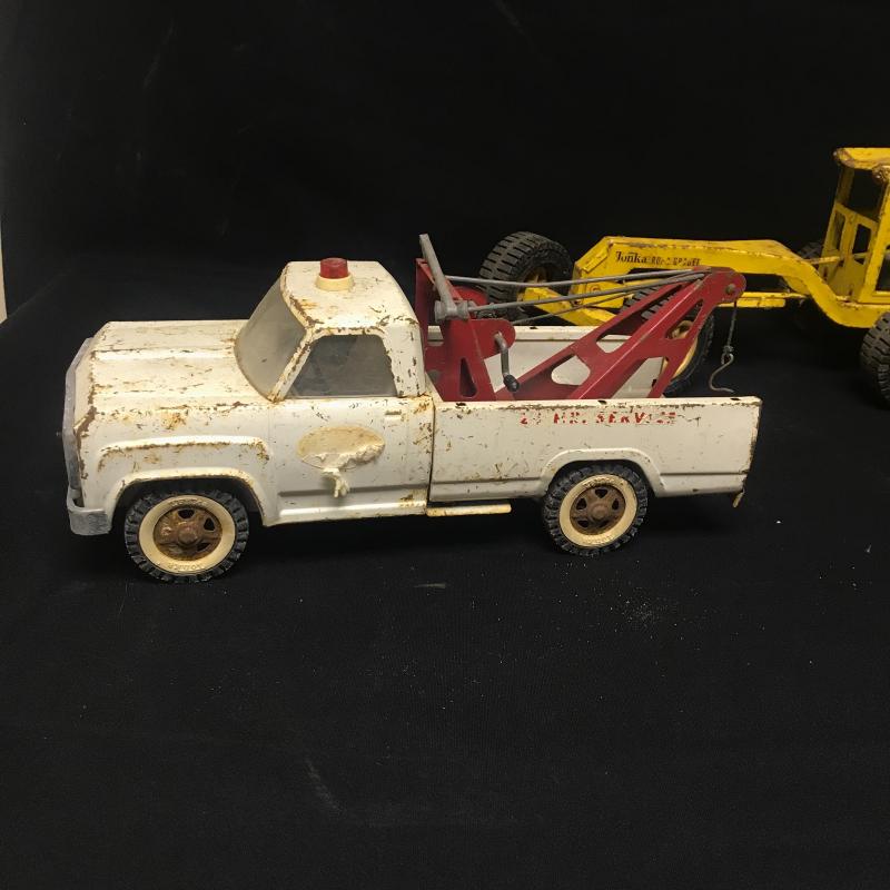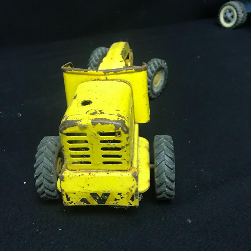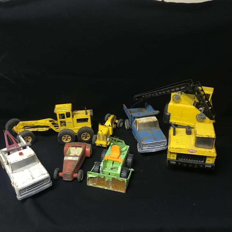7 total metal trucks with three being yellow Tonka brand. One dump truck, a tow truck, bulldozer and sports car also in this lot. Overall condition of the items are rusty but some moving pieces still in good working order. These have clearly been played with and fun has been had. Local puck up only.
