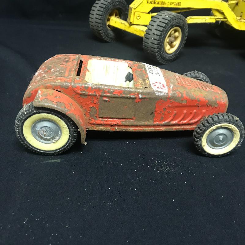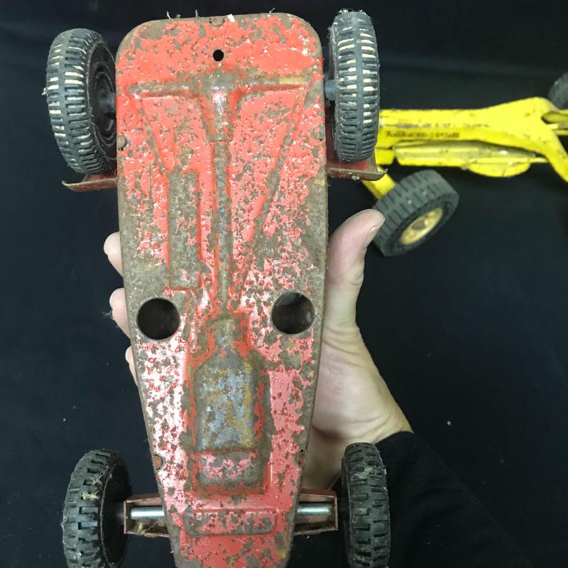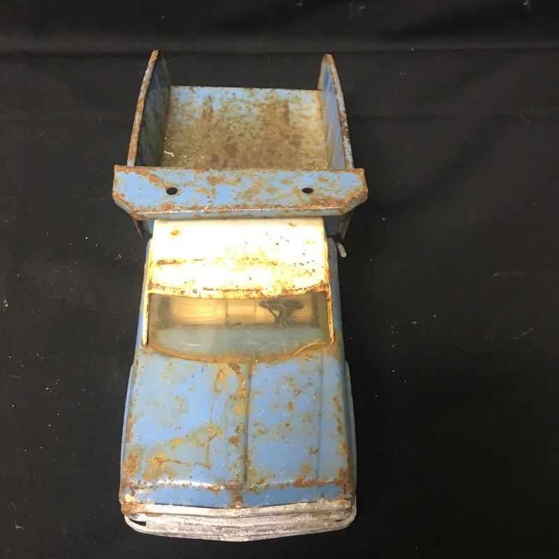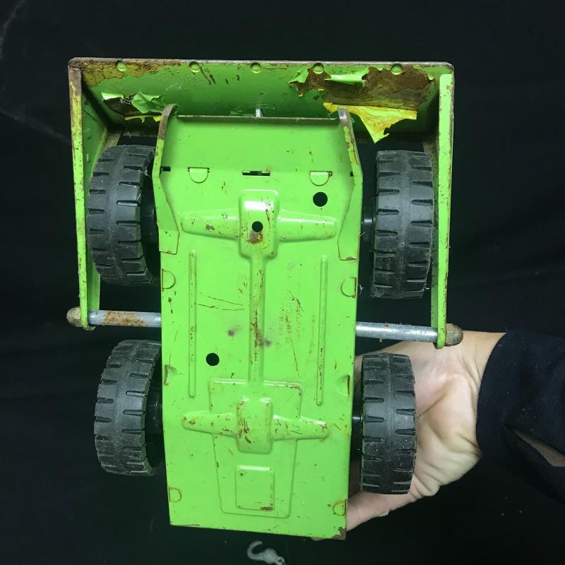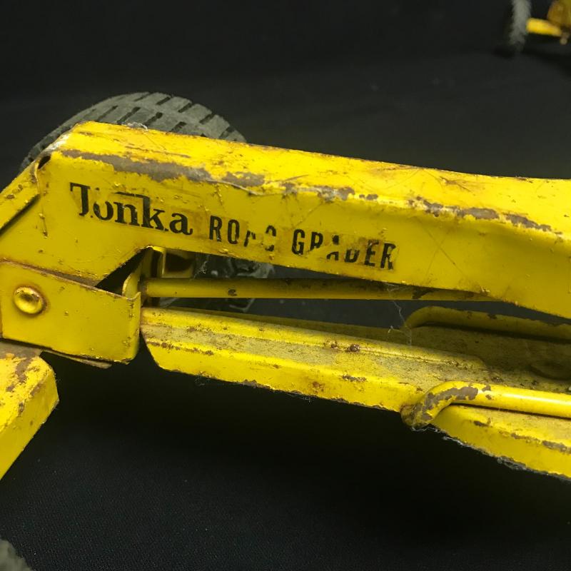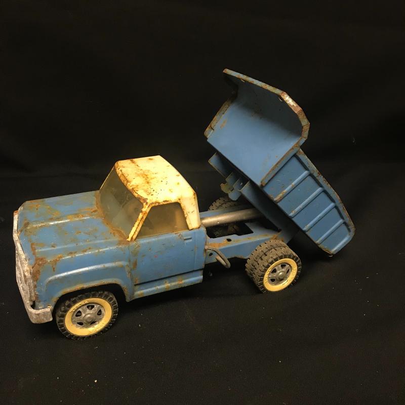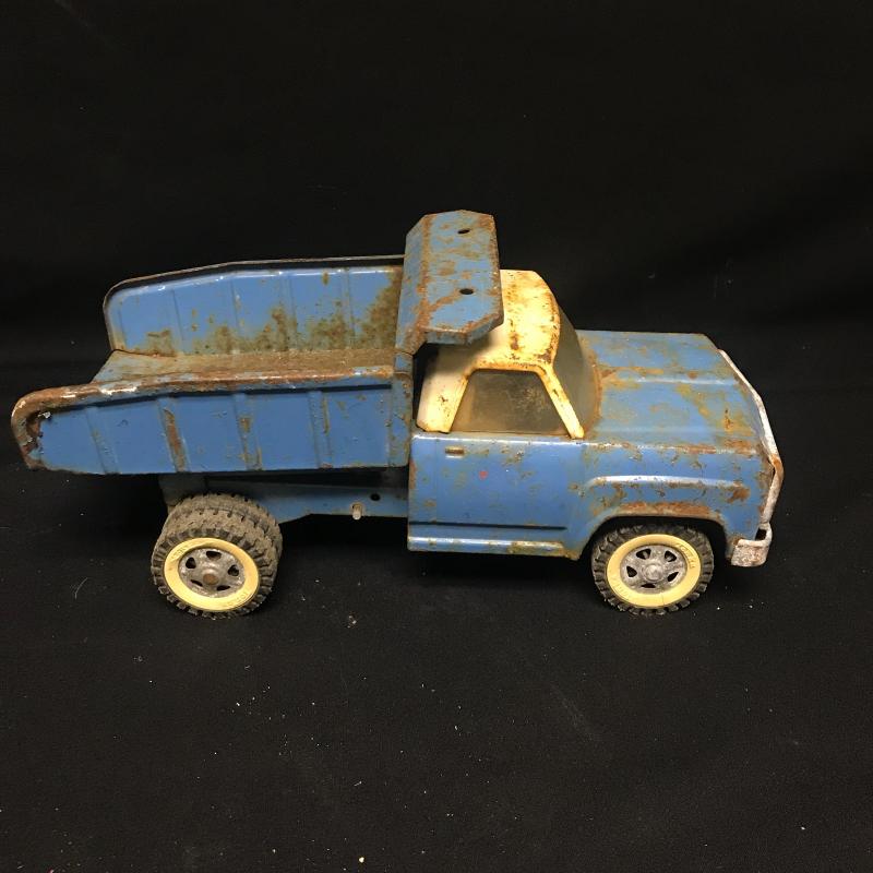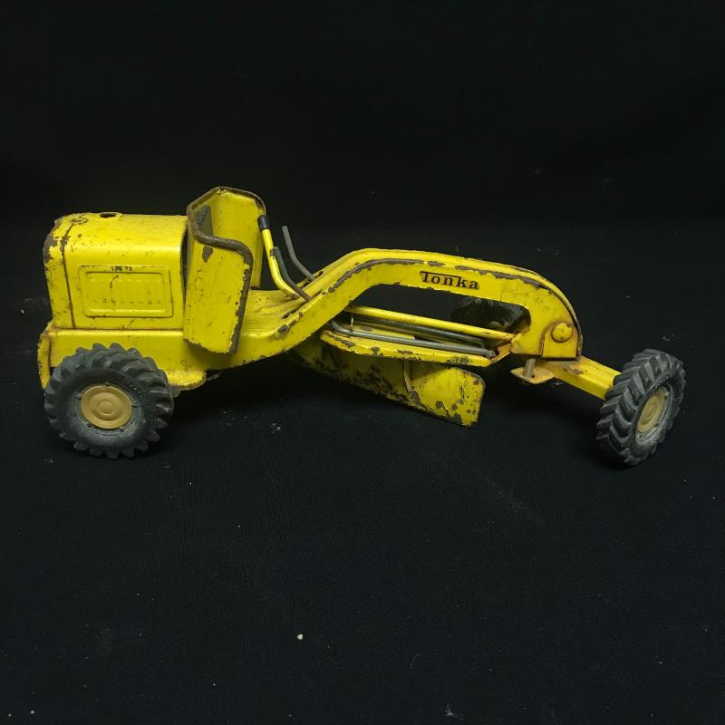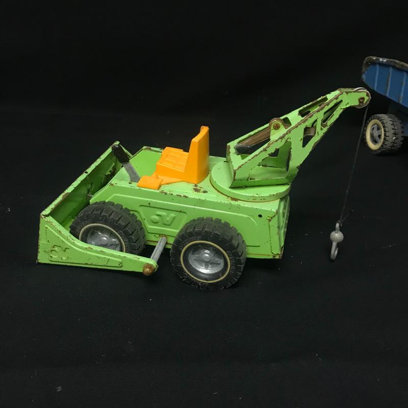 7 total metal trucks with three being yellow Tonka brand. One dump truck, a tow truck, bulldozer and sports car also in this lot. Overall condition of the items are rusty but some moving pieces still in good working order. These have clearly been played with and fun has been had. Local puck up only.