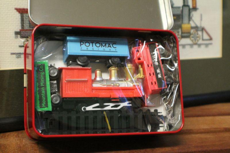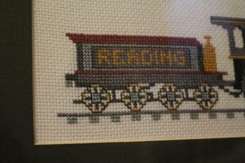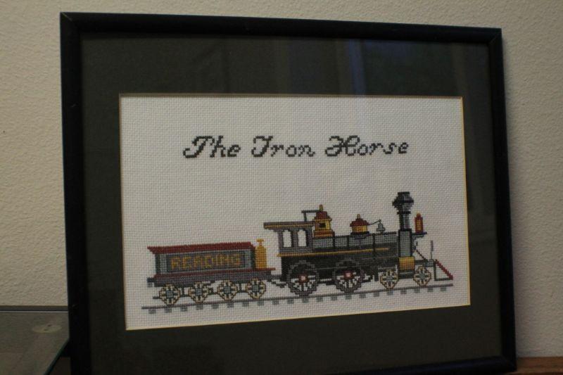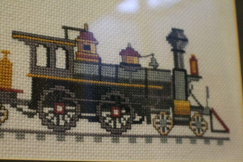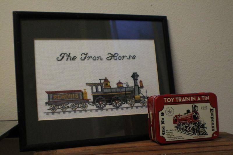 Lot 178: "The Iron Horse" Needlepoint Train Art Framed w/ Train in a Box Toy