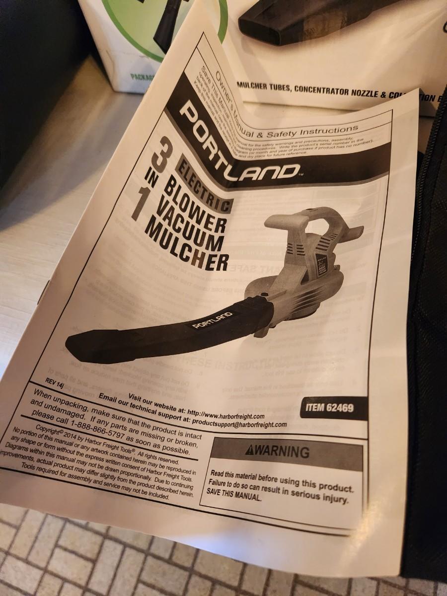 It's all there and has never been used. Book/storage bag included. Box was opened that that's it. PORTLAND 3 in 1 Electric Blower/Vacuum/Mulcher. 2 speed, 12 HP