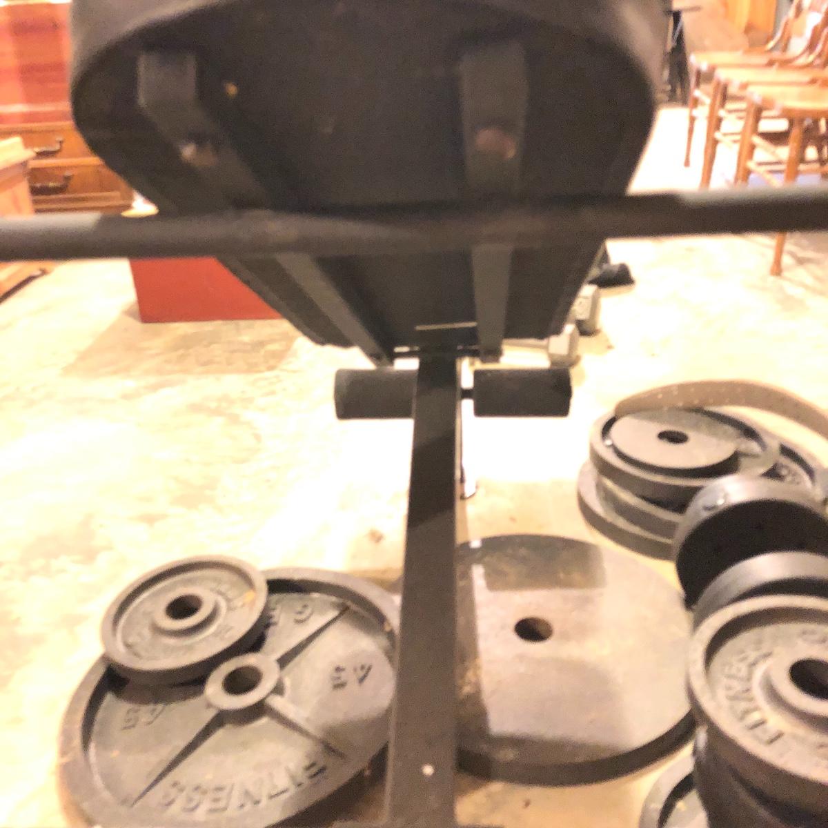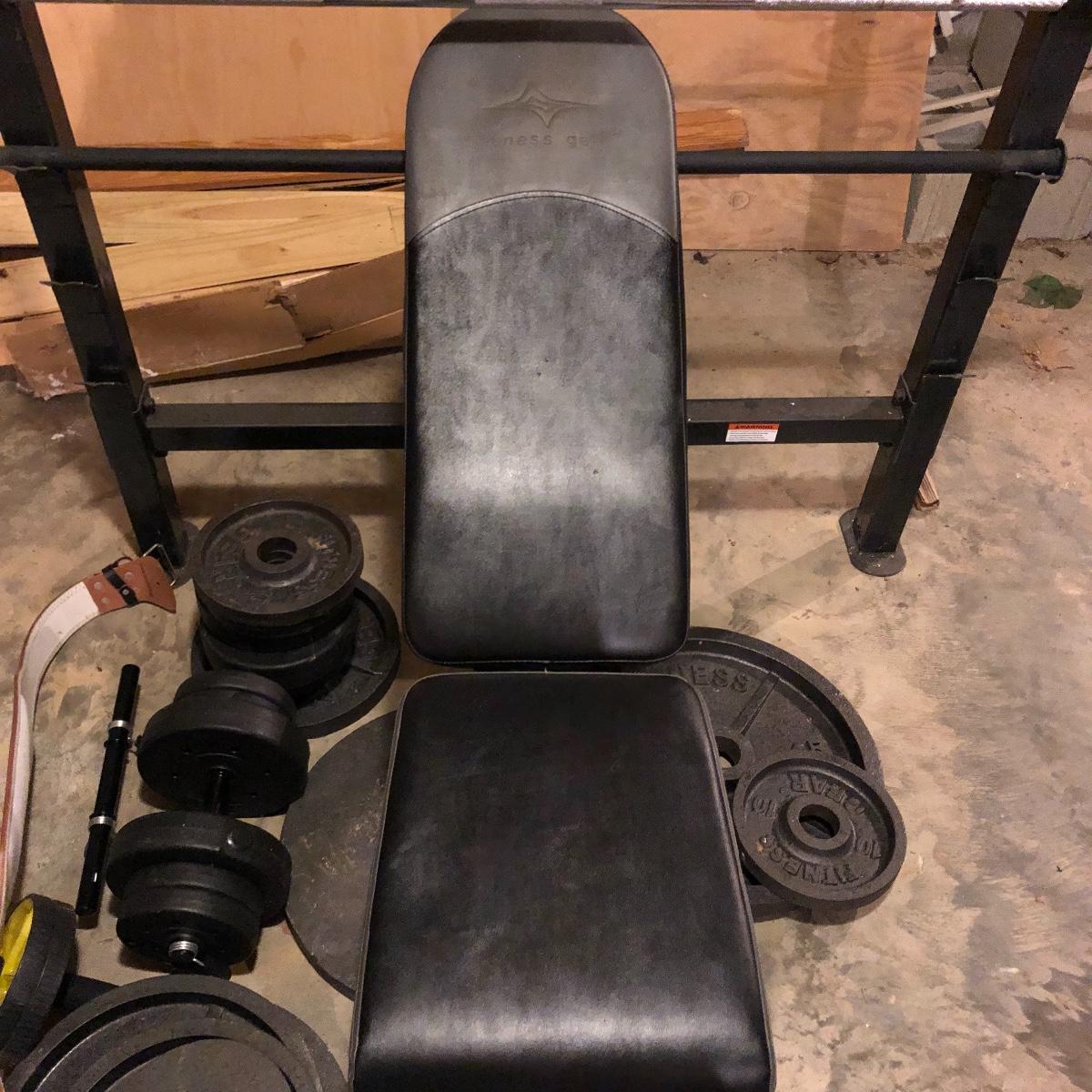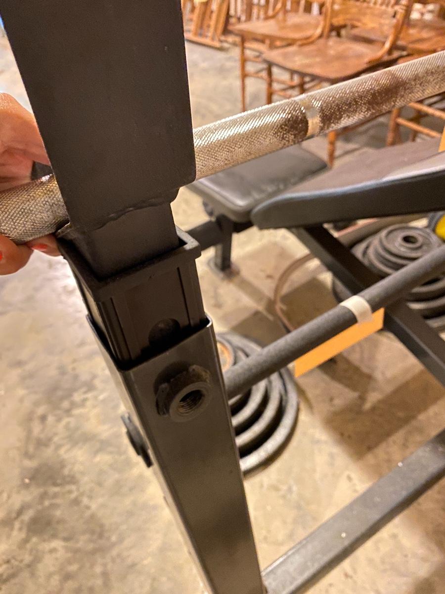 Get in shape this summer with this Fitness Gear Olympic sized weight bench. Bench has adjustable incline and adjustable height , but is missing bolts for the height adjustment, see pictures at end to see missing bolt and what bolts look like. Should be easy to find at a hardware store. Weights and barbell are not included, but available in lot 179. Bench measures 48” x 46” x 42”. Bring help item is substantial and will have to be walked around back of house.