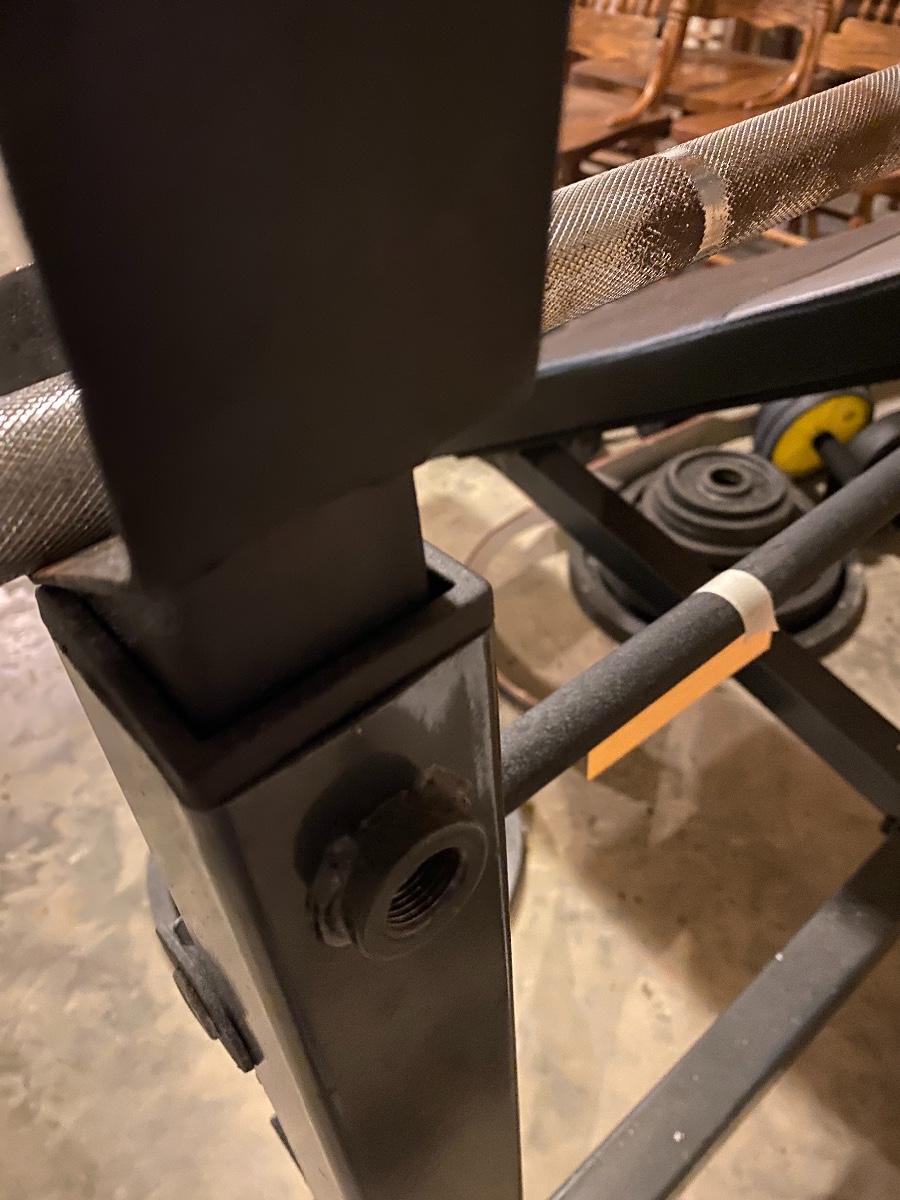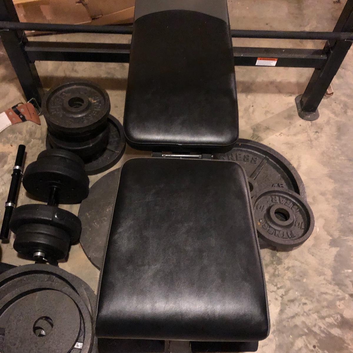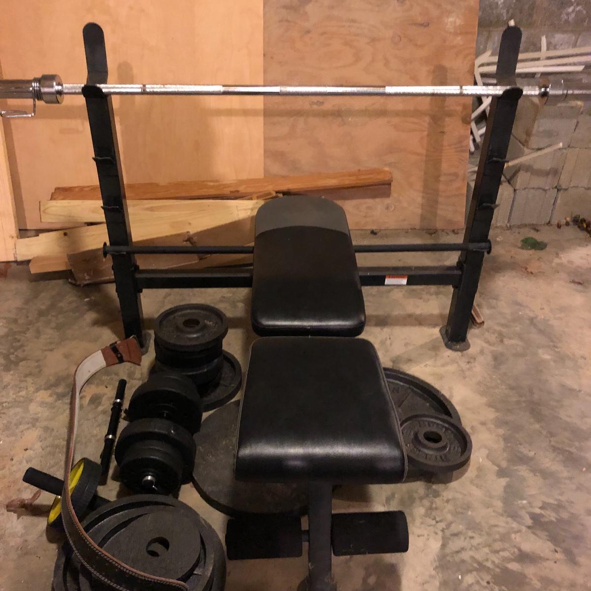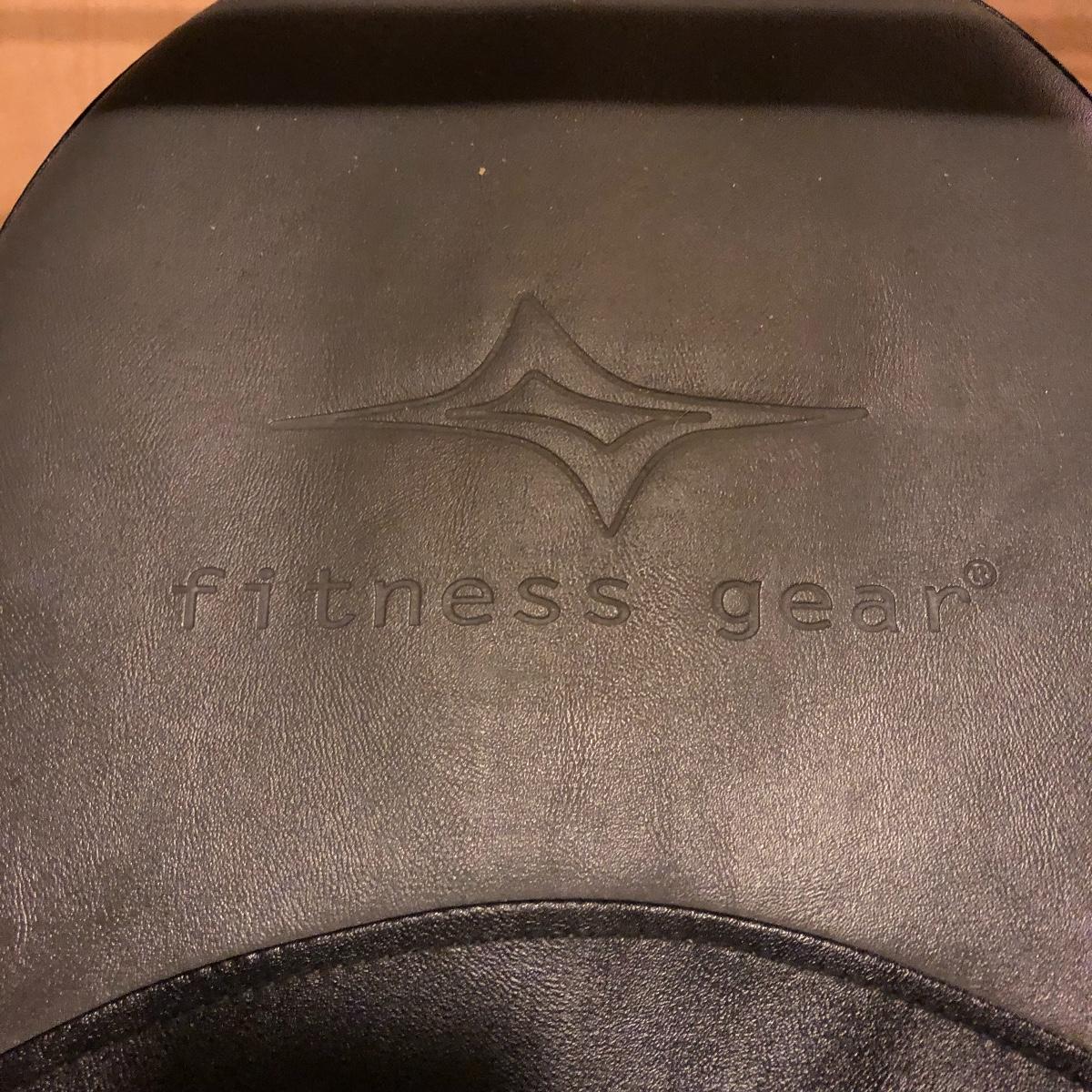 Get in shape this summer with this Fitness Gear Olympic sized weight bench. Bench has adjustable incline and adjustable height , but is missing bolts for the height adjustment, see pictures at end to see missing bolt and what bolts look like. Should be easy to find at a hardware store. Weights and barbell are not included, but available in lot 179. Bench measures 48” x 46” x 42”. Bring help item is substantial and will have to be walked around back of house.