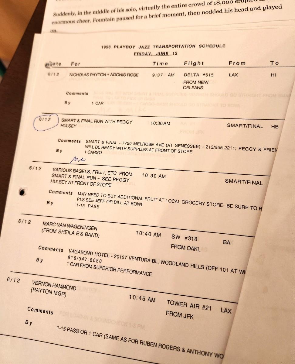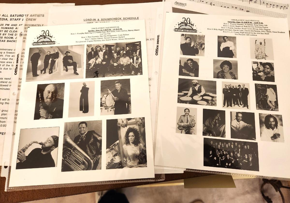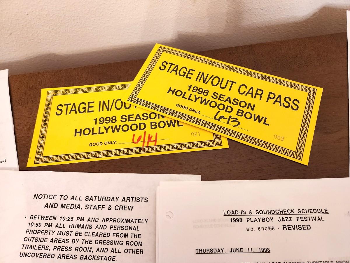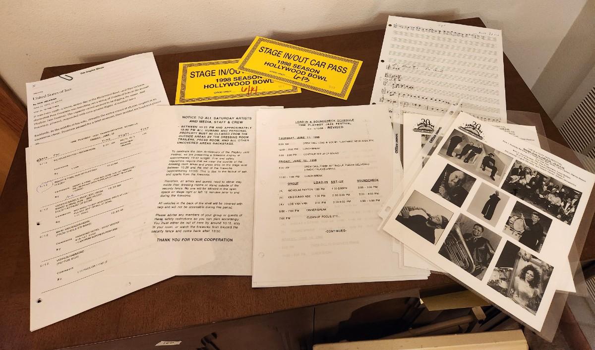 Nice lot of ephemera from Playboy Jazz Fest (1998) - artist photos, parking passes, crew-directed behind the scenes pickup/rehearsal schedules and a page of musical doodles by jazz great Miles Davis, who was one of the headliners. Pete also performed at this festival.