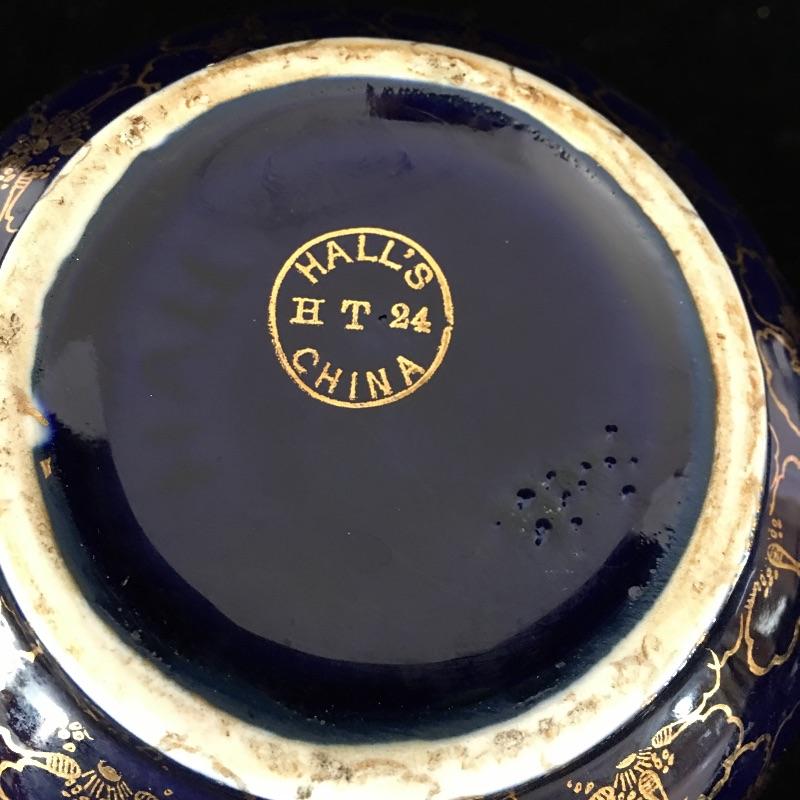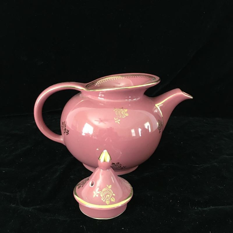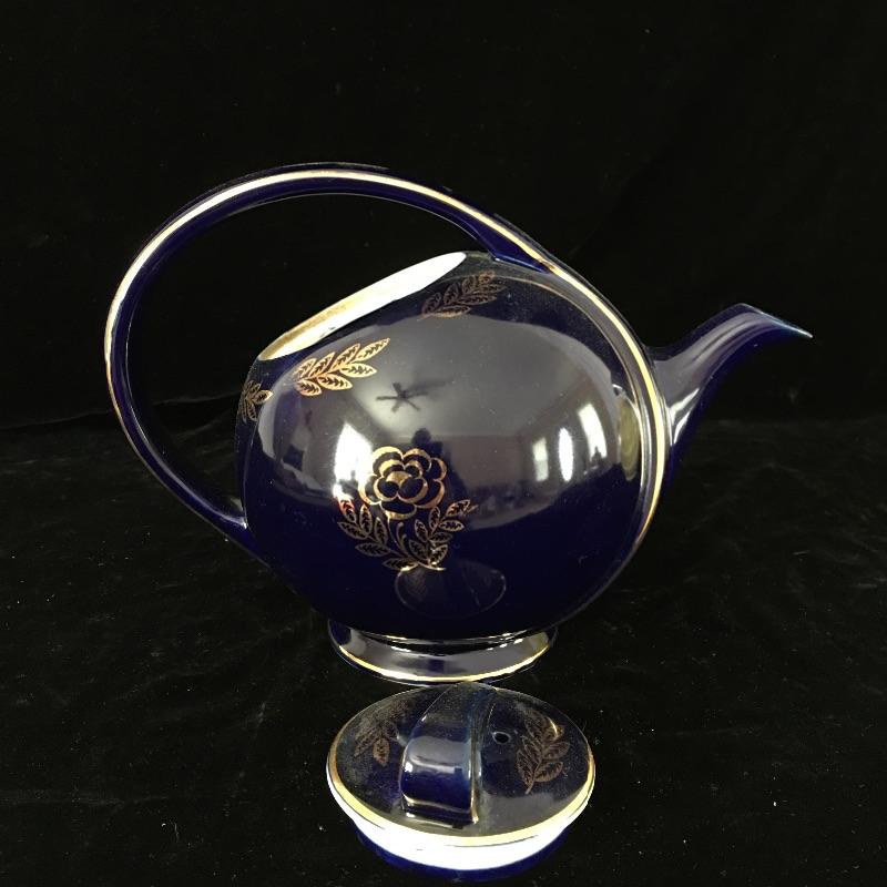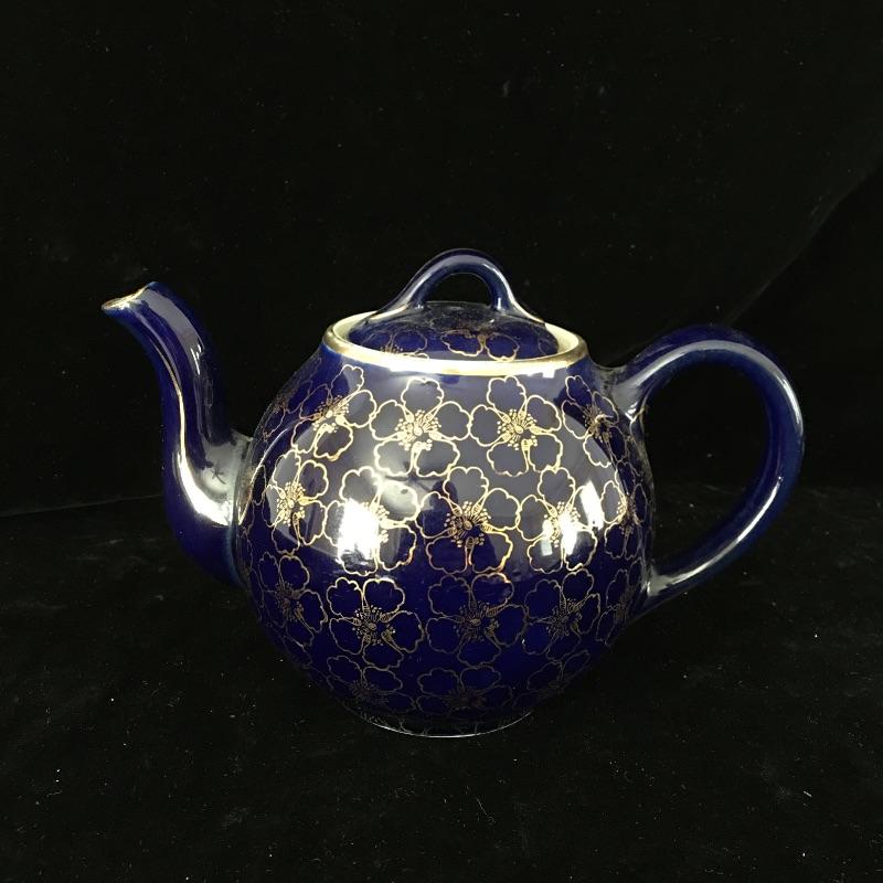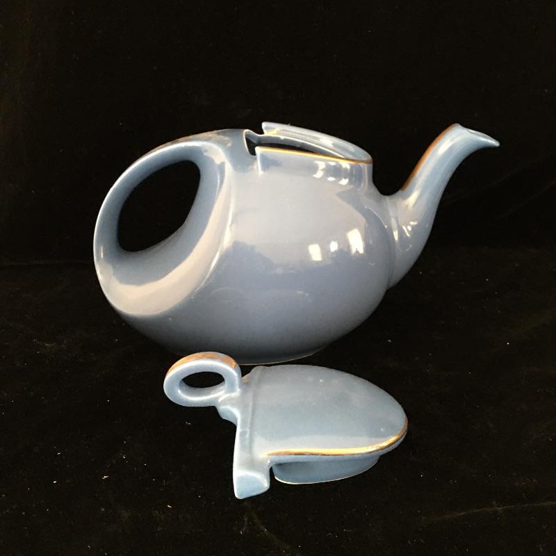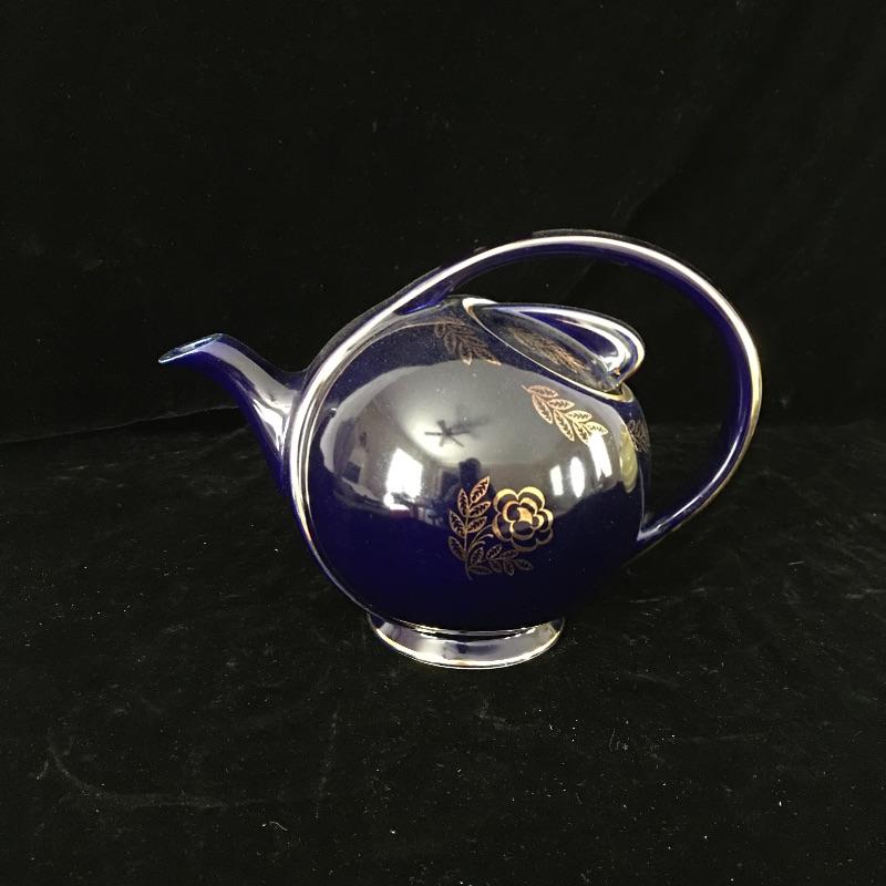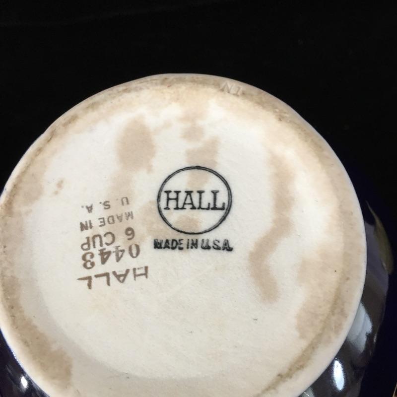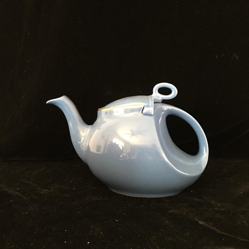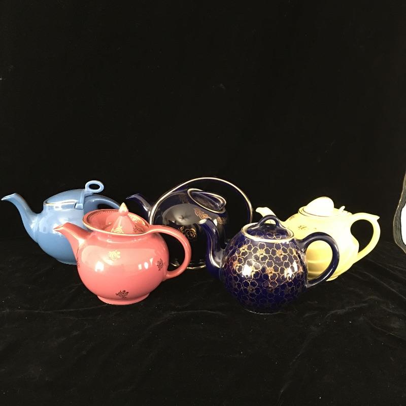 Quintuple of Hall teapots includes five teapots in a glorious variety of shapes, styles and colors. Which one will you choose for your first cuppa? Largest teapot measures 5.5” x 10” x 7”. The cornflower blue pot has a small crack in the rim, see photos.