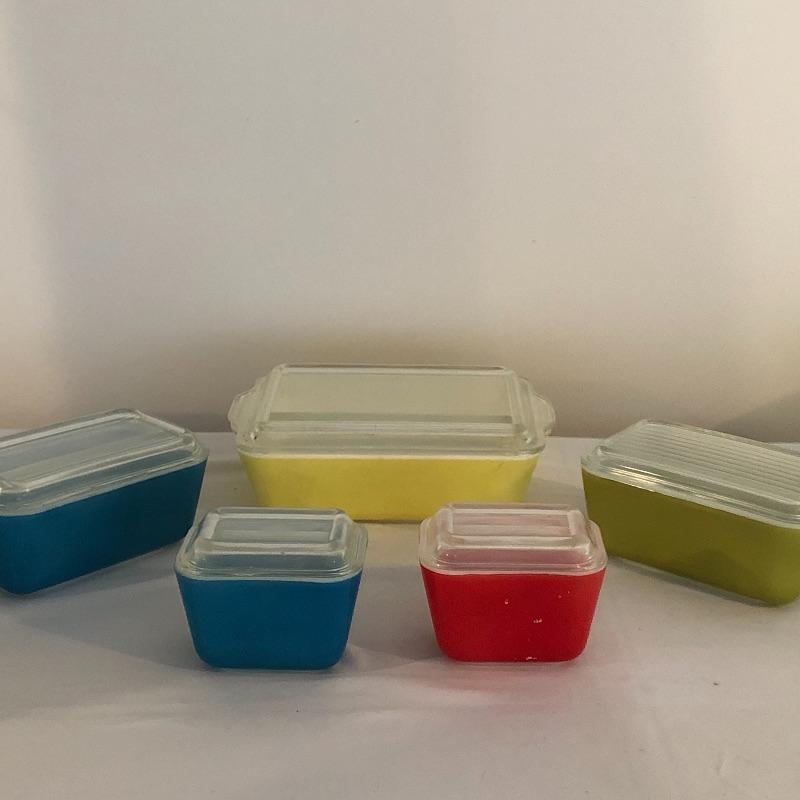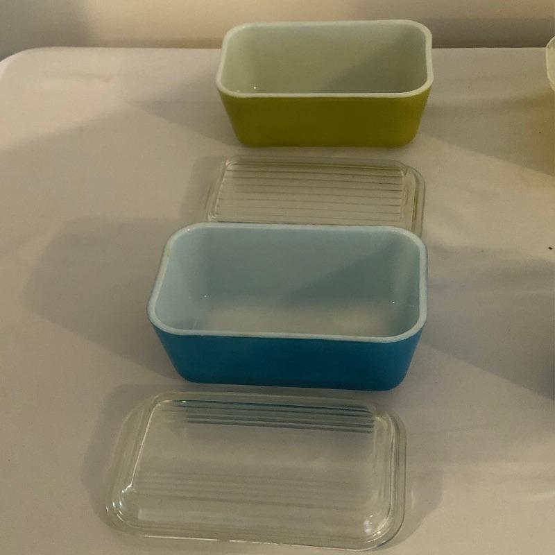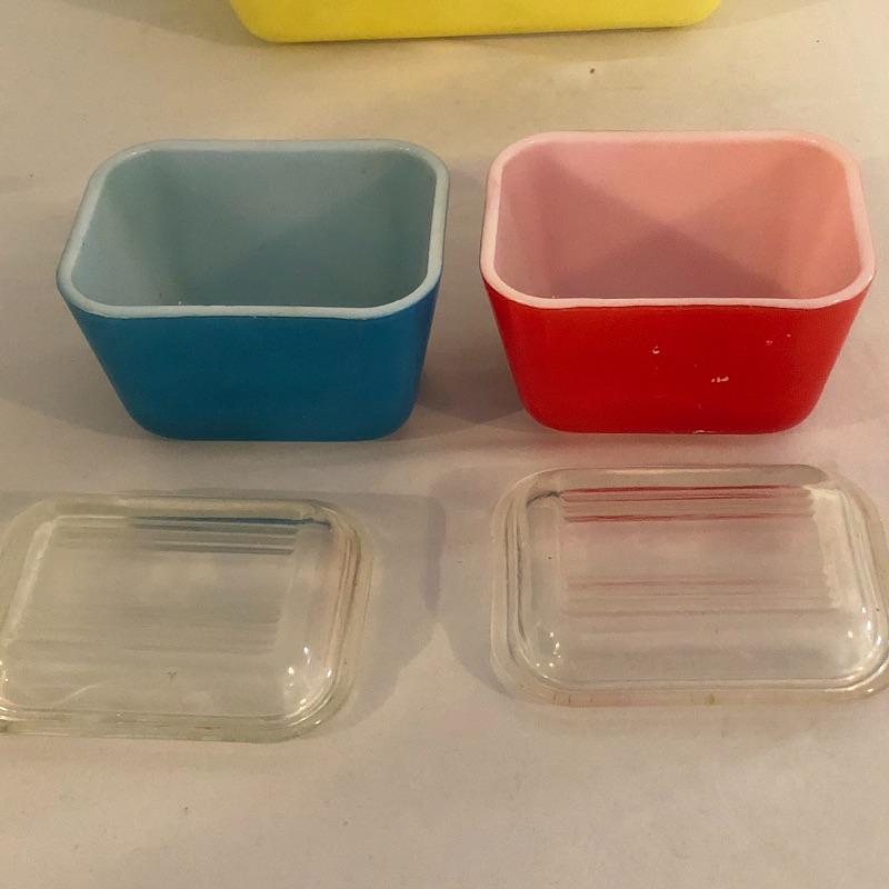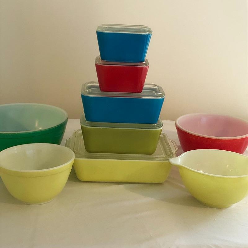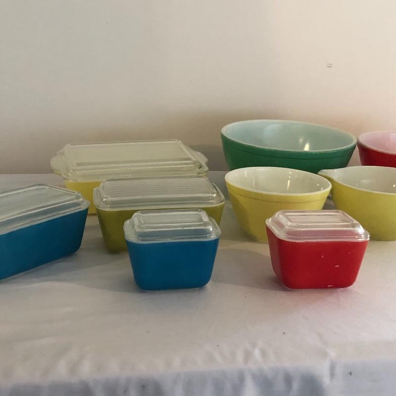 You don’t see Pyrex in these bold colors everyday. Lot includes two small, two medium and one larger rectangular Pyrex dishes with lids and four round bowls in different sizes and colors. Some pieces have scratches, see images.