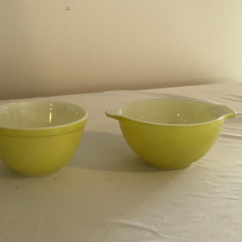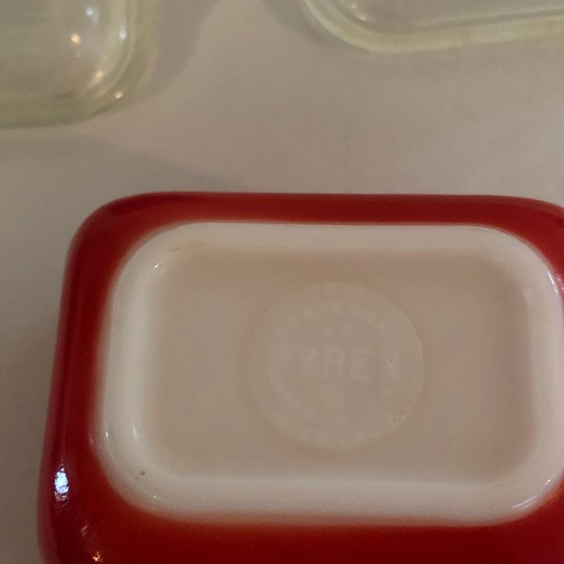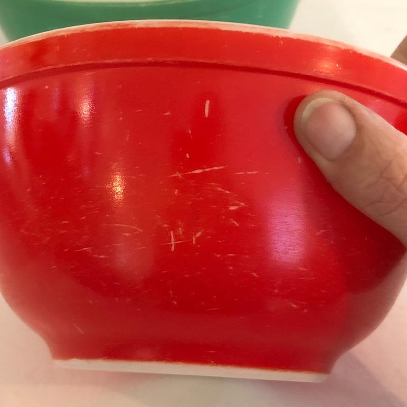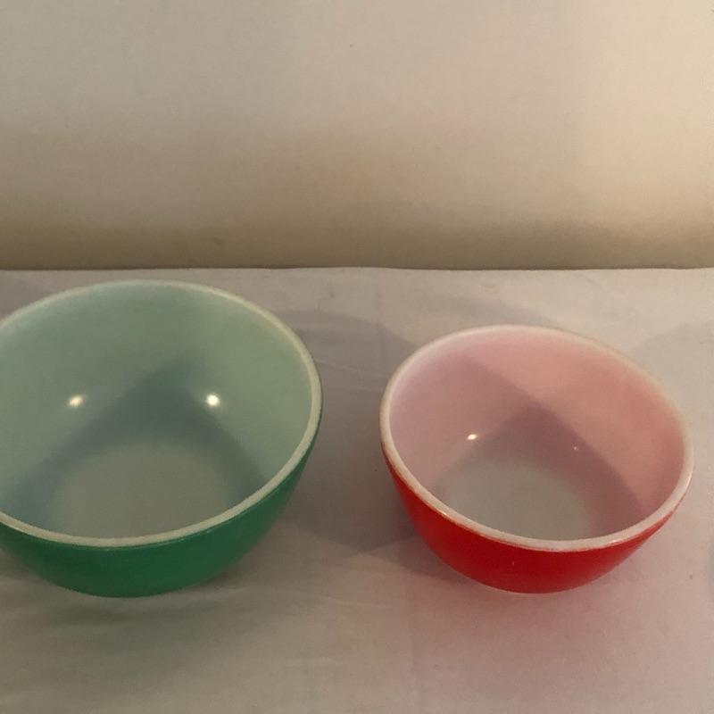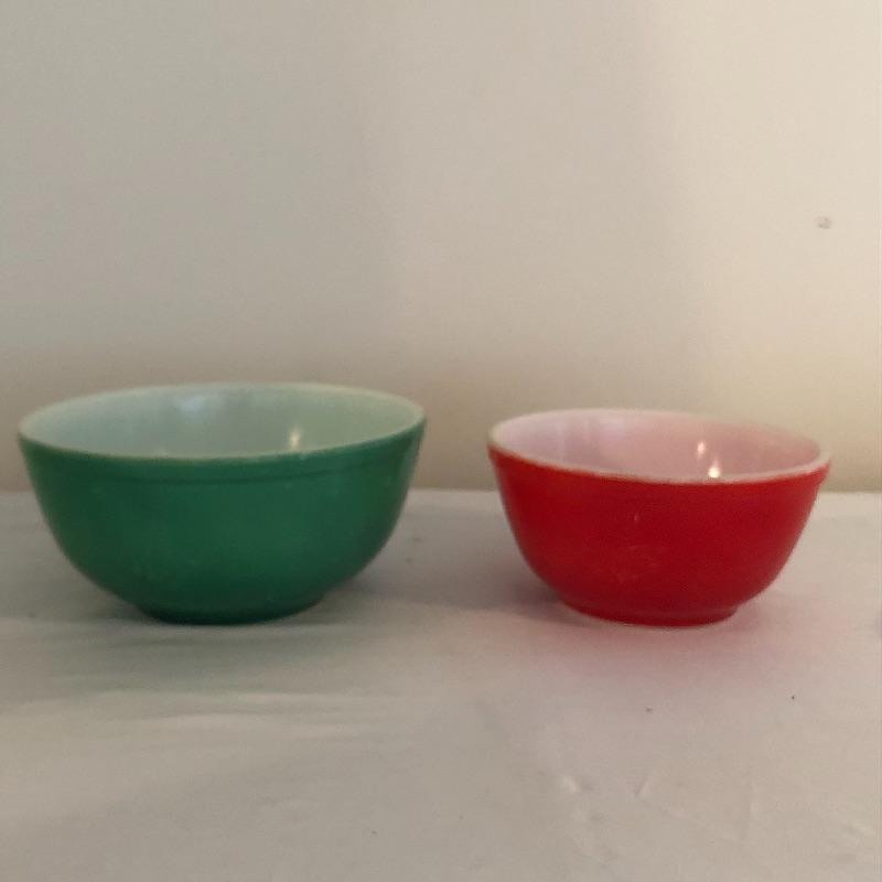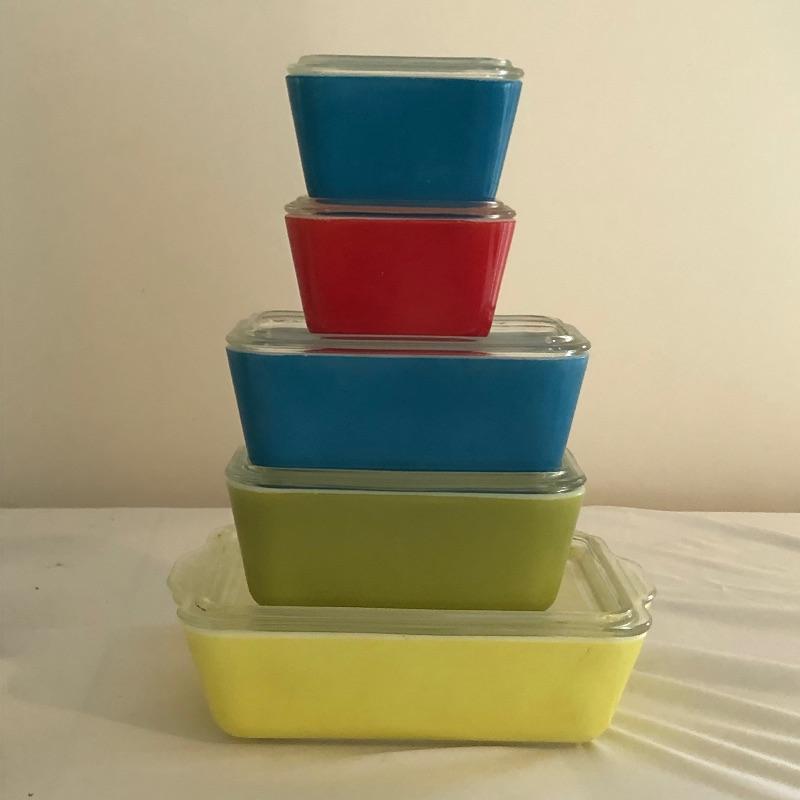 You don’t see Pyrex in these bold colors everyday. Lot includes two small, two medium and one larger rectangular Pyrex dishes with lids and four round bowls in different sizes and colors. Some pieces have scratches, see images.