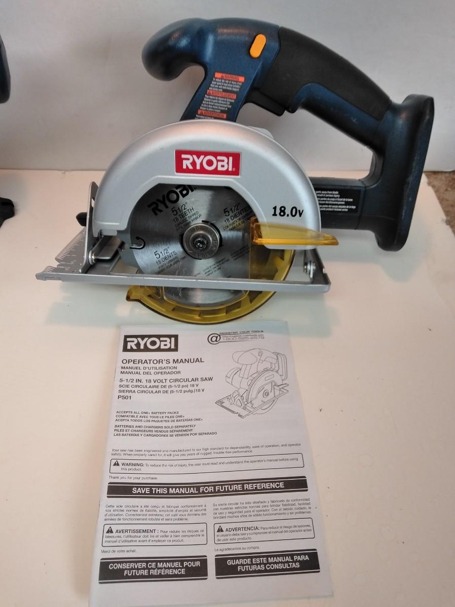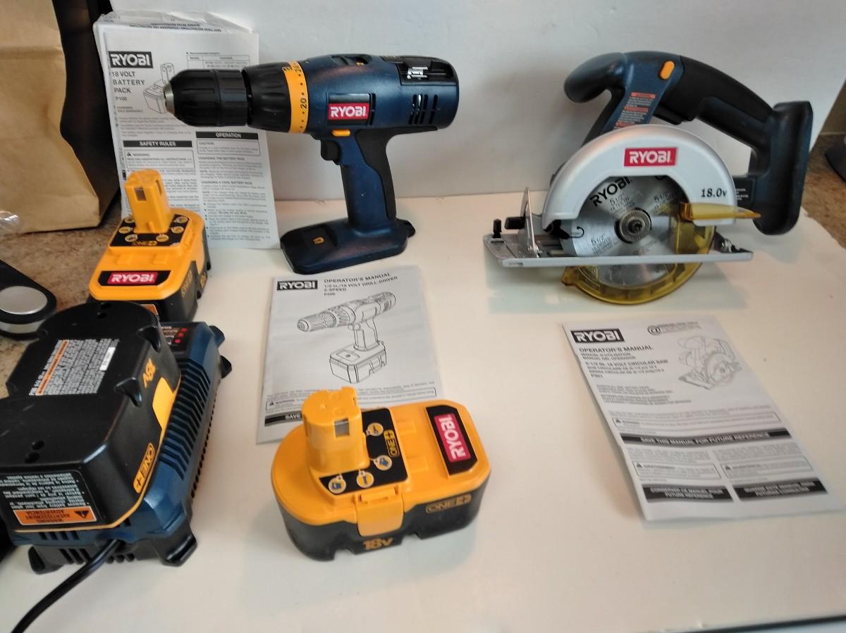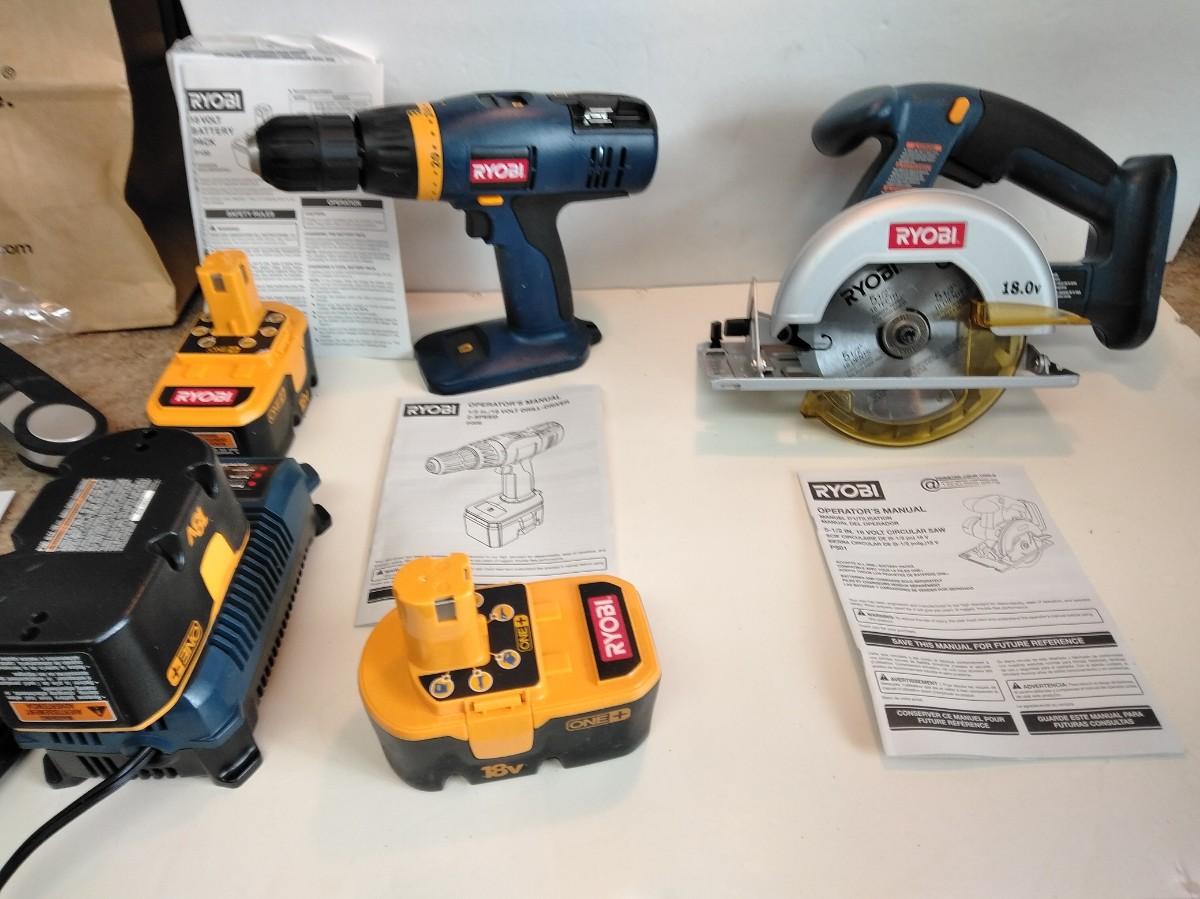 RYOBI 18 VOLT 1/2" DRILL P206, RYOBI 18 VOLT 5.5" P501 SAW, BOTH WITH BATTERIES AND CHARGER. THESE POWER TOOLS ALSO COME WITH A BAG, AND INSTRUCTION SHEETS.
