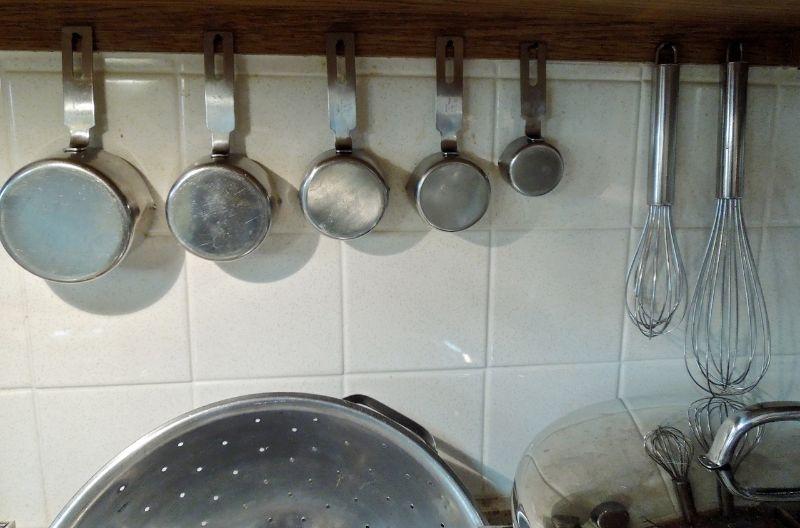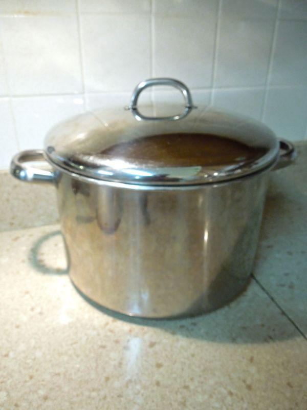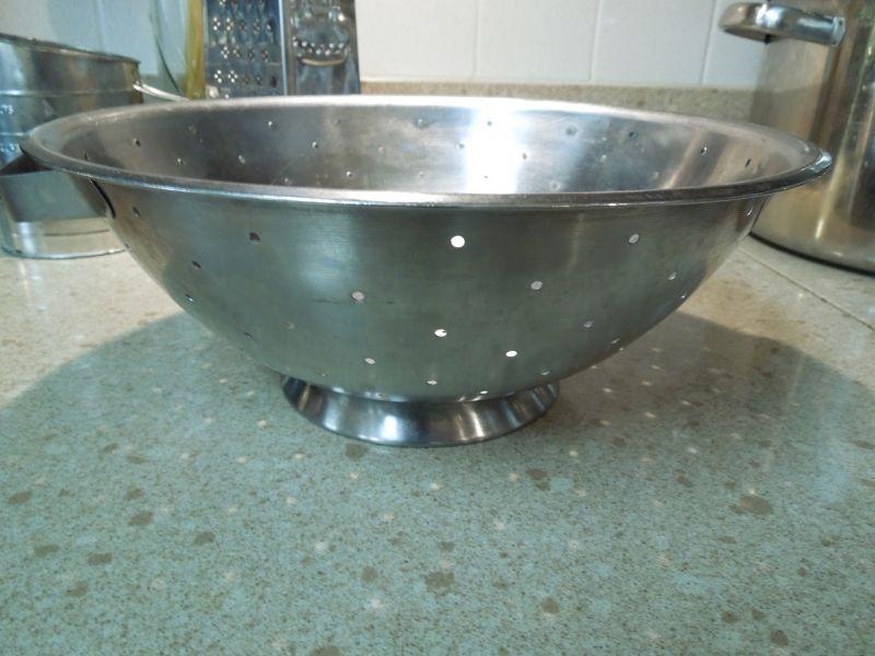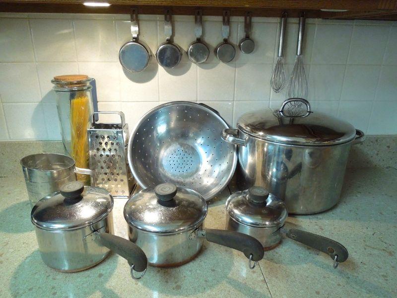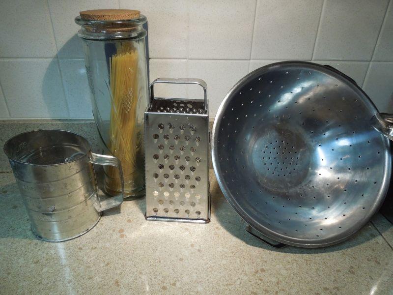 Everything to make some killer pasta. A stainless strainer; cheese grater; set of stainless measuring cups; a 2qt Reverware pot with lid; a 3/4 qt Revereware sauce pan with lid; an Inman stock pot; a Bromwell's flour sifter; a spaghetti glass jar with cork; and 2 wire whisks.