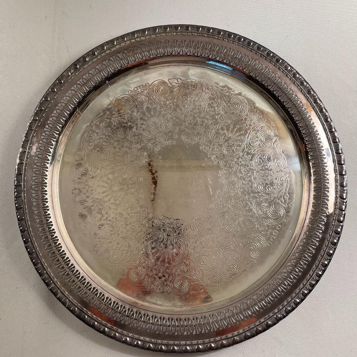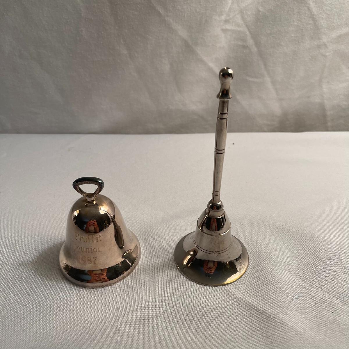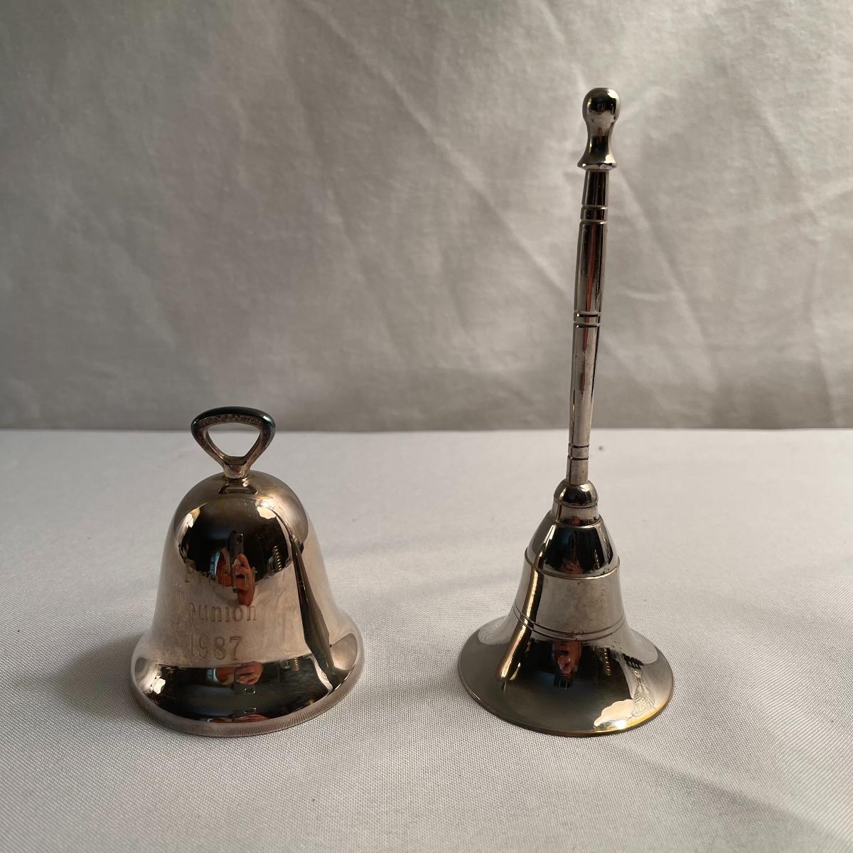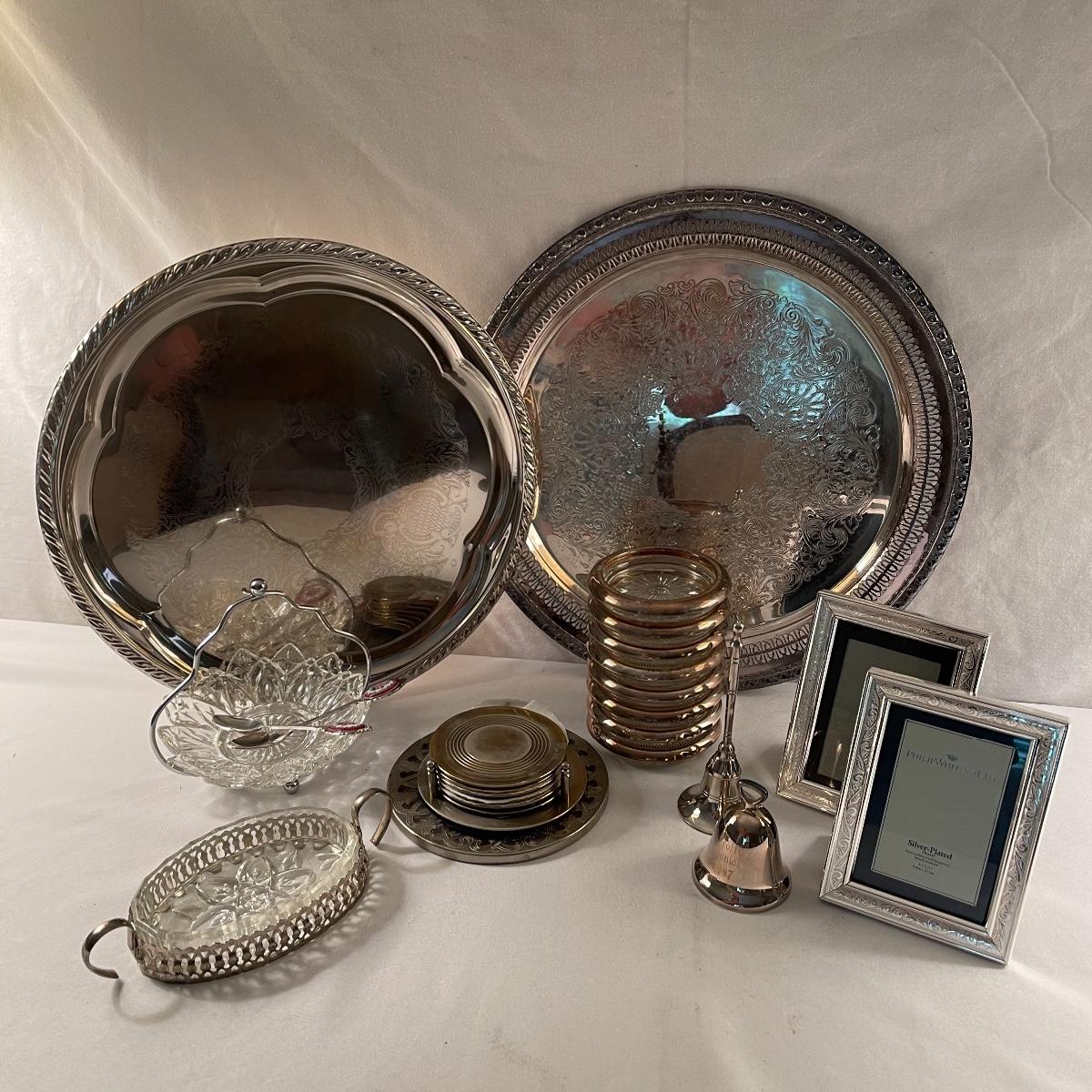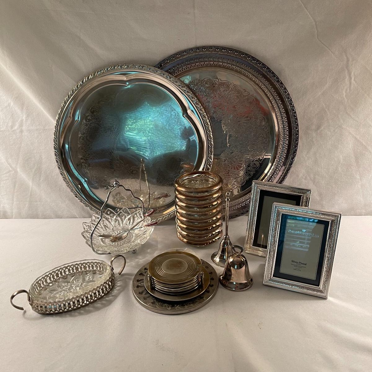This lot includes silver-plates and silver colored platters, picture frames, bells, coasters, and dishes. The two picture frames are Philip Whitney Ltd. 3.5” x 5” silver-plated frames. Eight stackable glass and silver-plated coasters that say “Leonard, Italy, Silverplate” are included alongside another set of coasters; a set of six flat, silver-plated, that sit in their own holding dish. Two bells, one of which says “Proffit Reunion 1987” and “Reed and Barton” are a part of this collection as well as two small silver-plated teaspoons that were made in Korea and have decorative ceramic pieces on their handles. An ovular glass dish sits in a silver-plated holder with handles, similarly, two shallow glass dishes sit in their silver-colored holder. Lastly two serving platters, one made in Hong Kong and lightweight and the other says “Rogers and Bro 1772” and is silver-plated and heavier in weight.