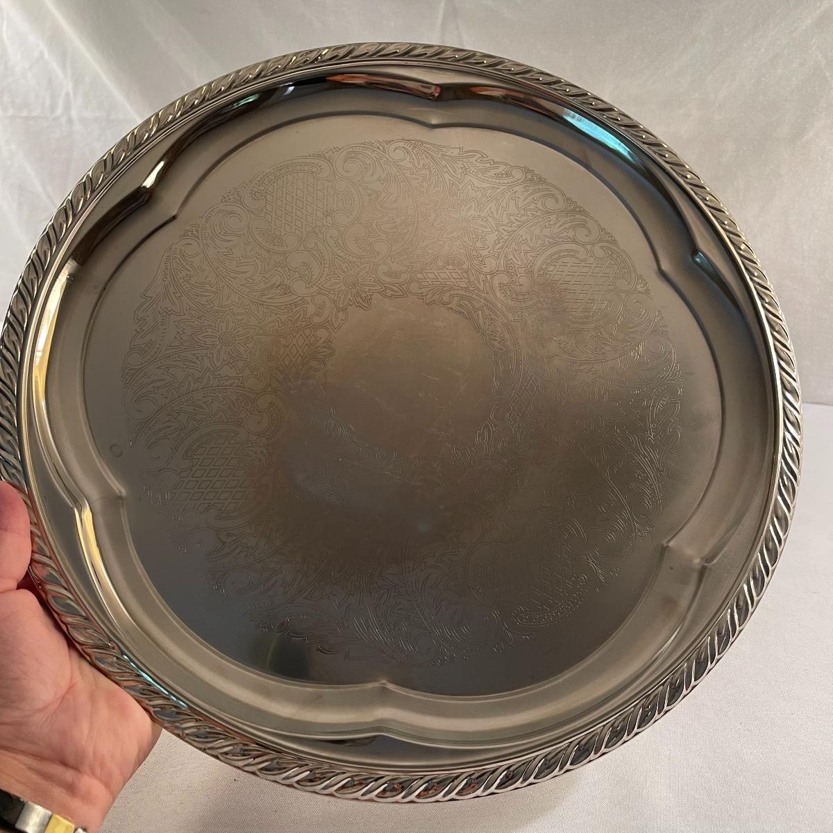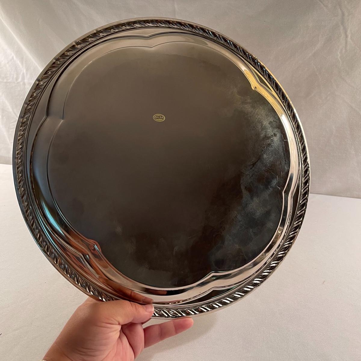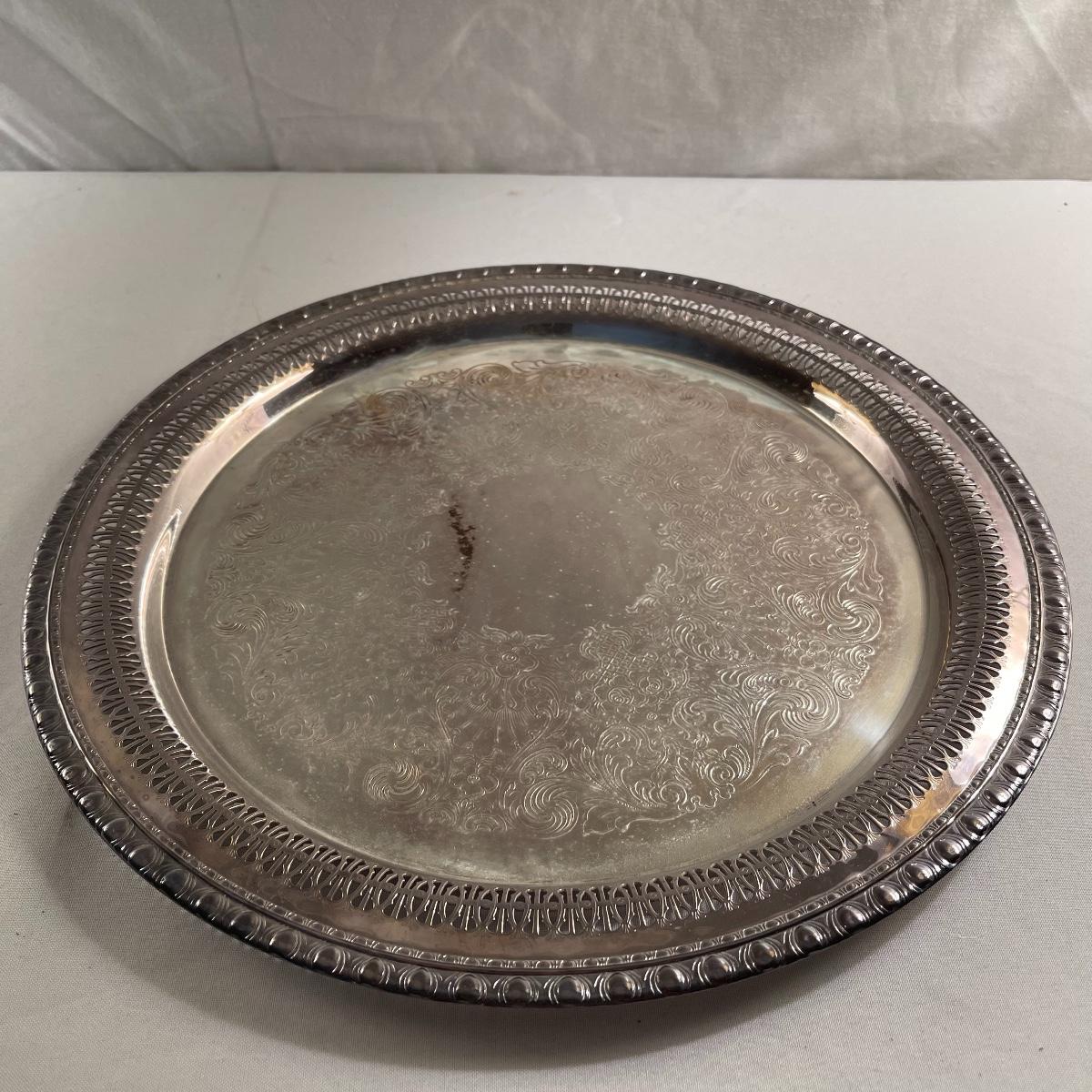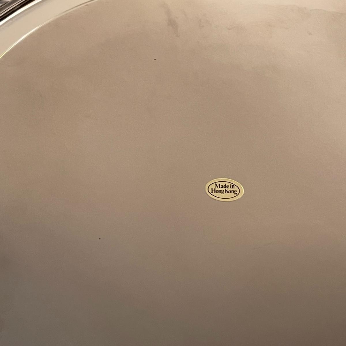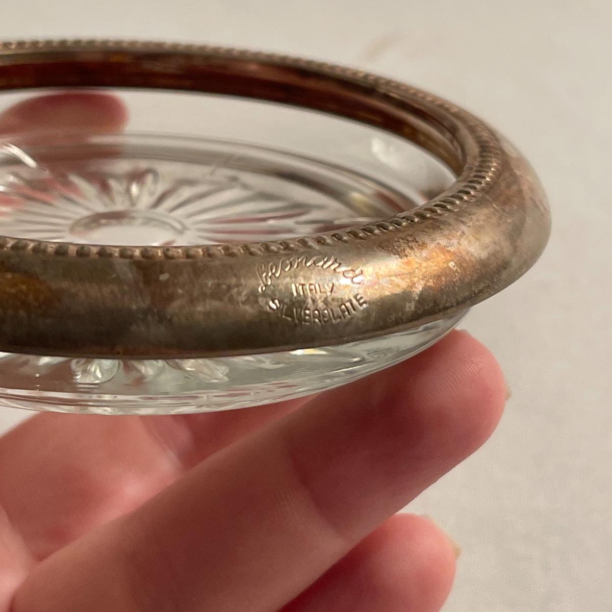 This lot includes silver-plates and silver colored platters, picture frames, bells, coasters, and dishes. The two picture frames are Philip Whitney Ltd. 3.5” x 5” silver-plated frames. Eight stackable glass and silver-plated coasters that say “Leonard, Italy, Silverplate” are included alongside another set of coasters; a set of six flat, silver-plated, that sit in their own holding dish. Two bells, one of which says “Proffit Reunion 1987” and “Reed and Barton” are a part of this collection as well as two small silver-plated teaspoons that were made in Korea and have decorative ceramic pieces on their handles. An ovular glass dish sits in a silver-plated holder with handles, similarly, two shallow glass dishes sit in their silver-colored holder. Lastly two serving platters, one made in Hong Kong and lightweight and the other says “Rogers and Bro 1772” and is silver-plated and heavier in weight.