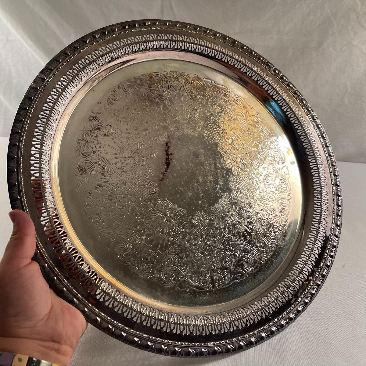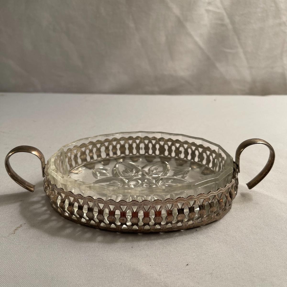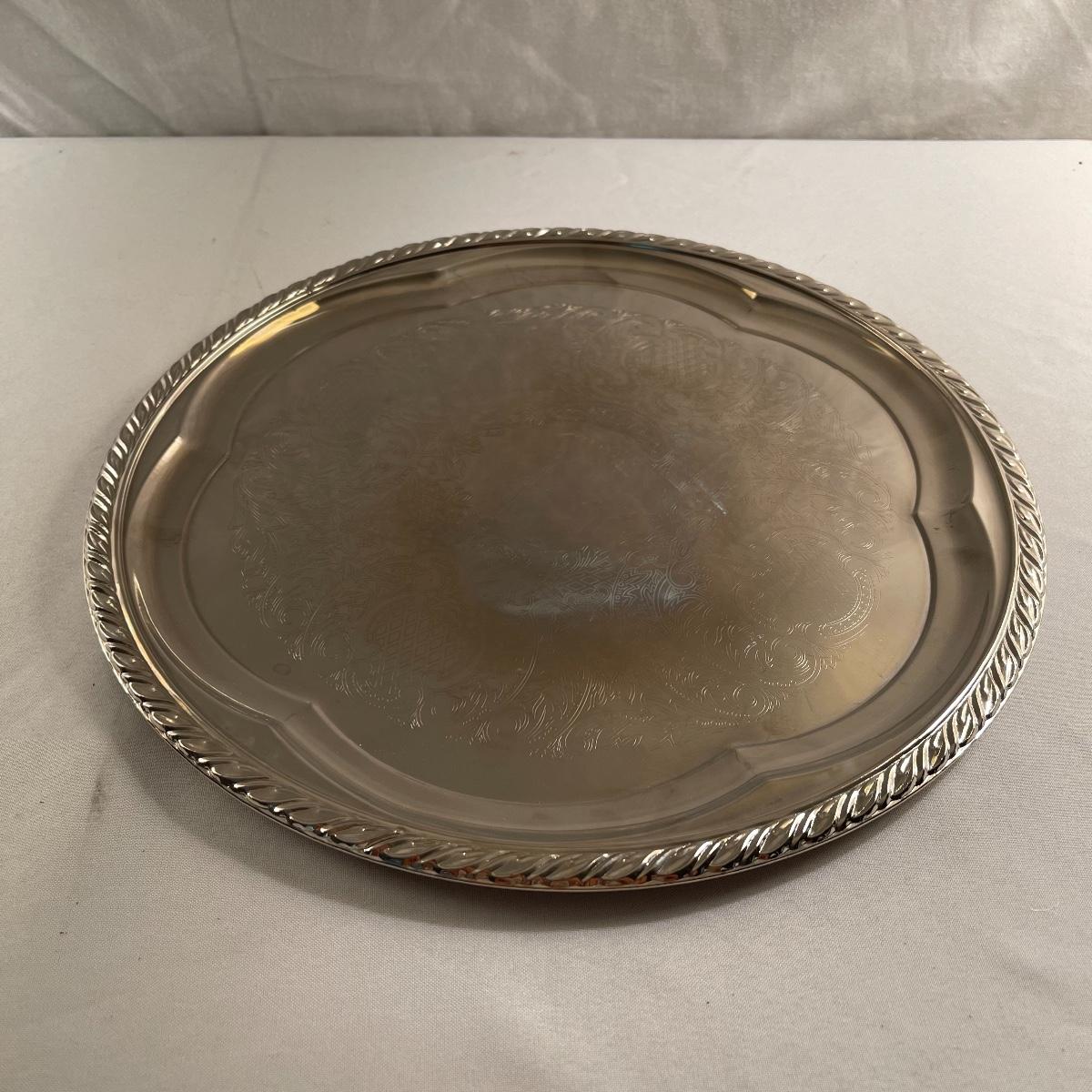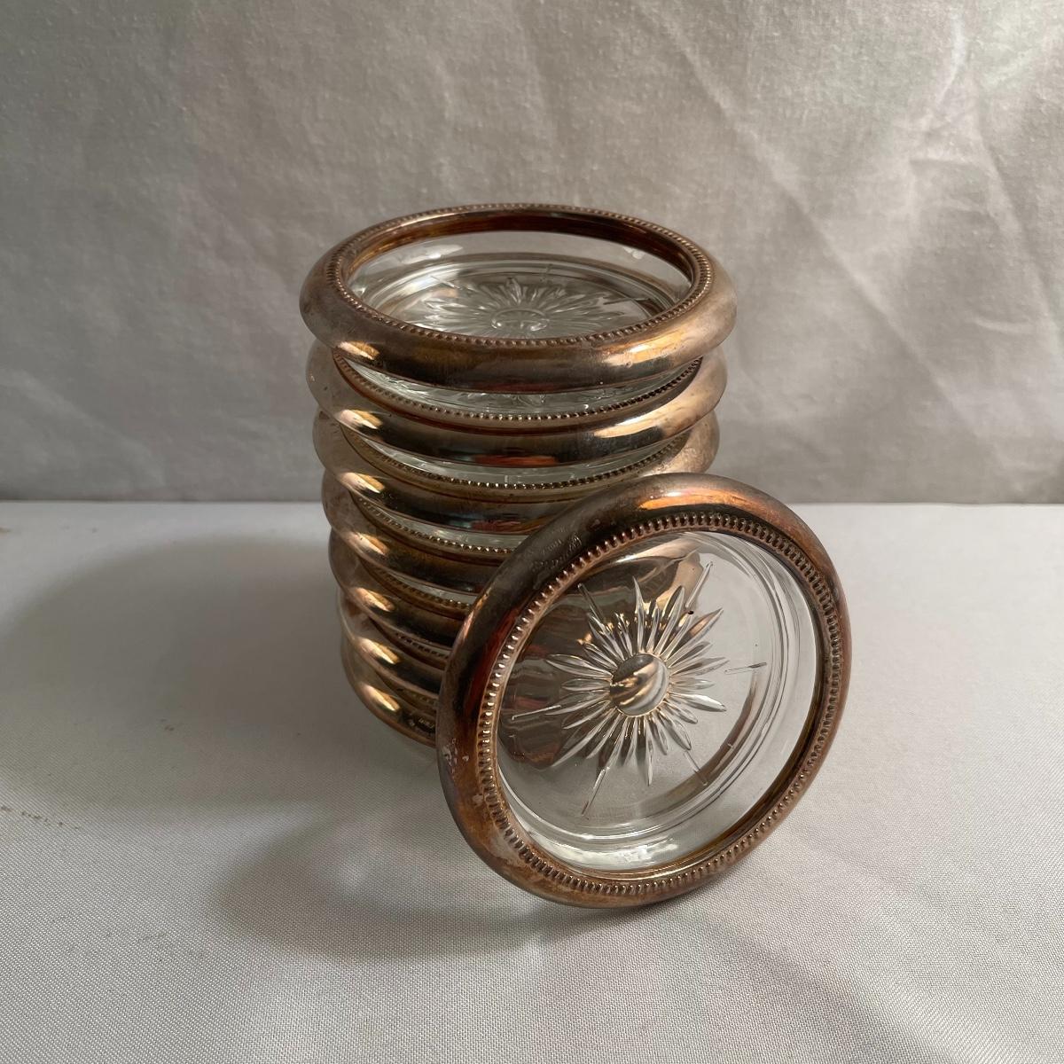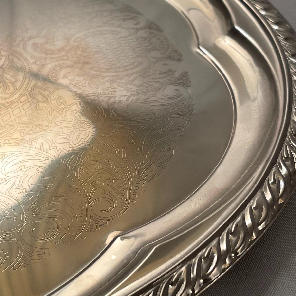 This lot includes silver-plates and silver colored platters, picture frames, bells, coasters, and dishes. The two picture frames are Philip Whitney Ltd. 3.5” x 5” silver-plated frames. Eight stackable glass and silver-plated coasters that say “Leonard, Italy, Silverplate” are included alongside another set of coasters; a set of six flat, silver-plated, that sit in their own holding dish. Two bells, one of which says “Proffit Reunion 1987” and “Reed and Barton” are a part of this collection as well as two small silver-plated teaspoons that were made in Korea and have decorative ceramic pieces on their handles. An ovular glass dish sits in a silver-plated holder with handles, similarly, two shallow glass dishes sit in their silver-colored holder. Lastly two serving platters, one made in Hong Kong and lightweight and the other says “Rogers and Bro 1772” and is silver-plated and heavier in weight.