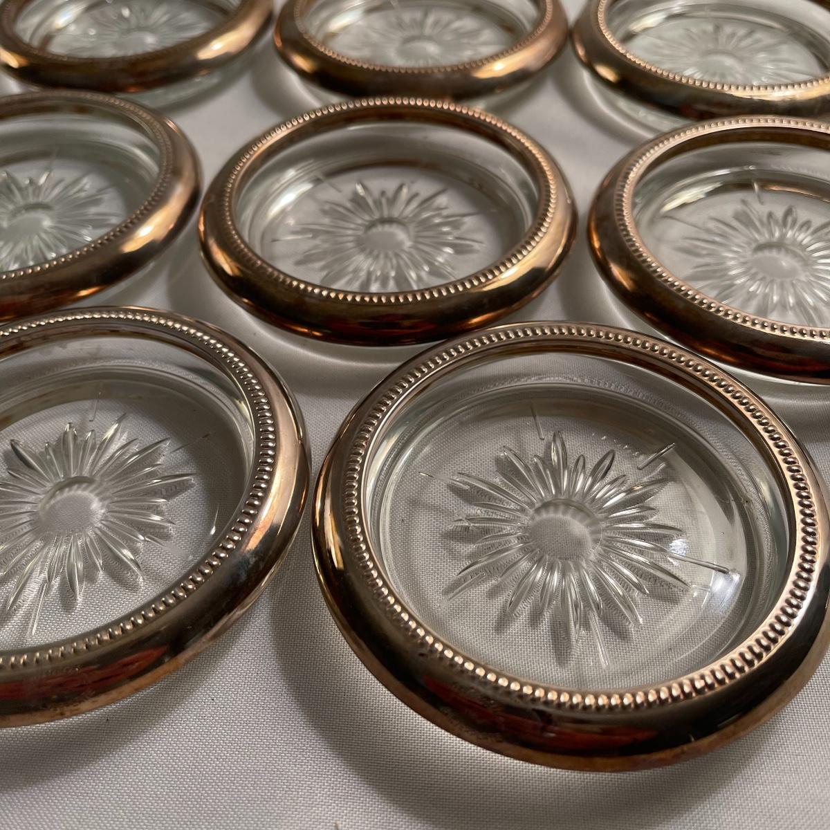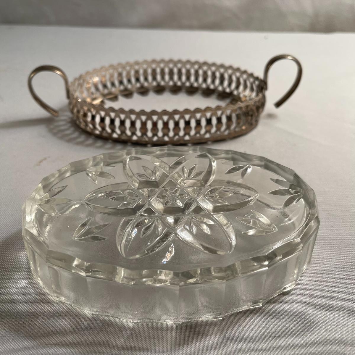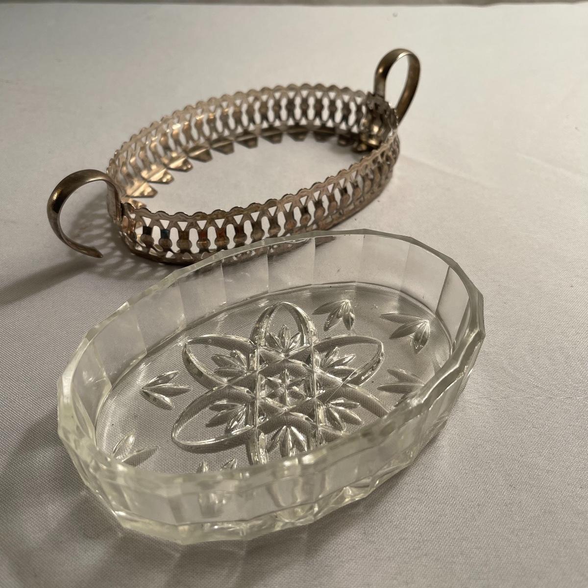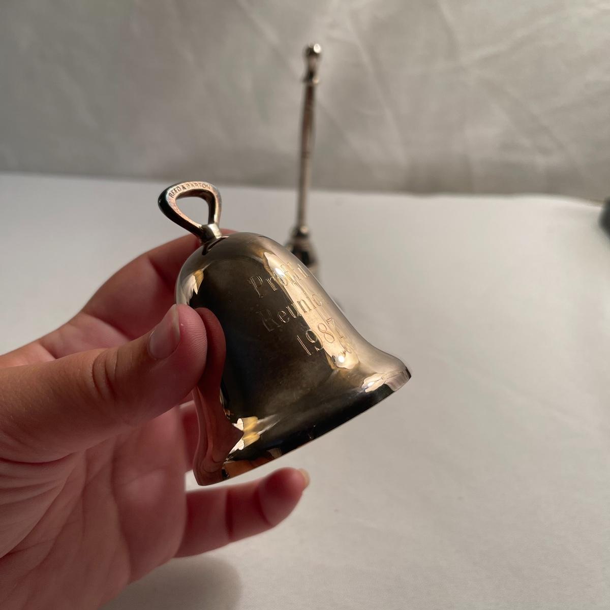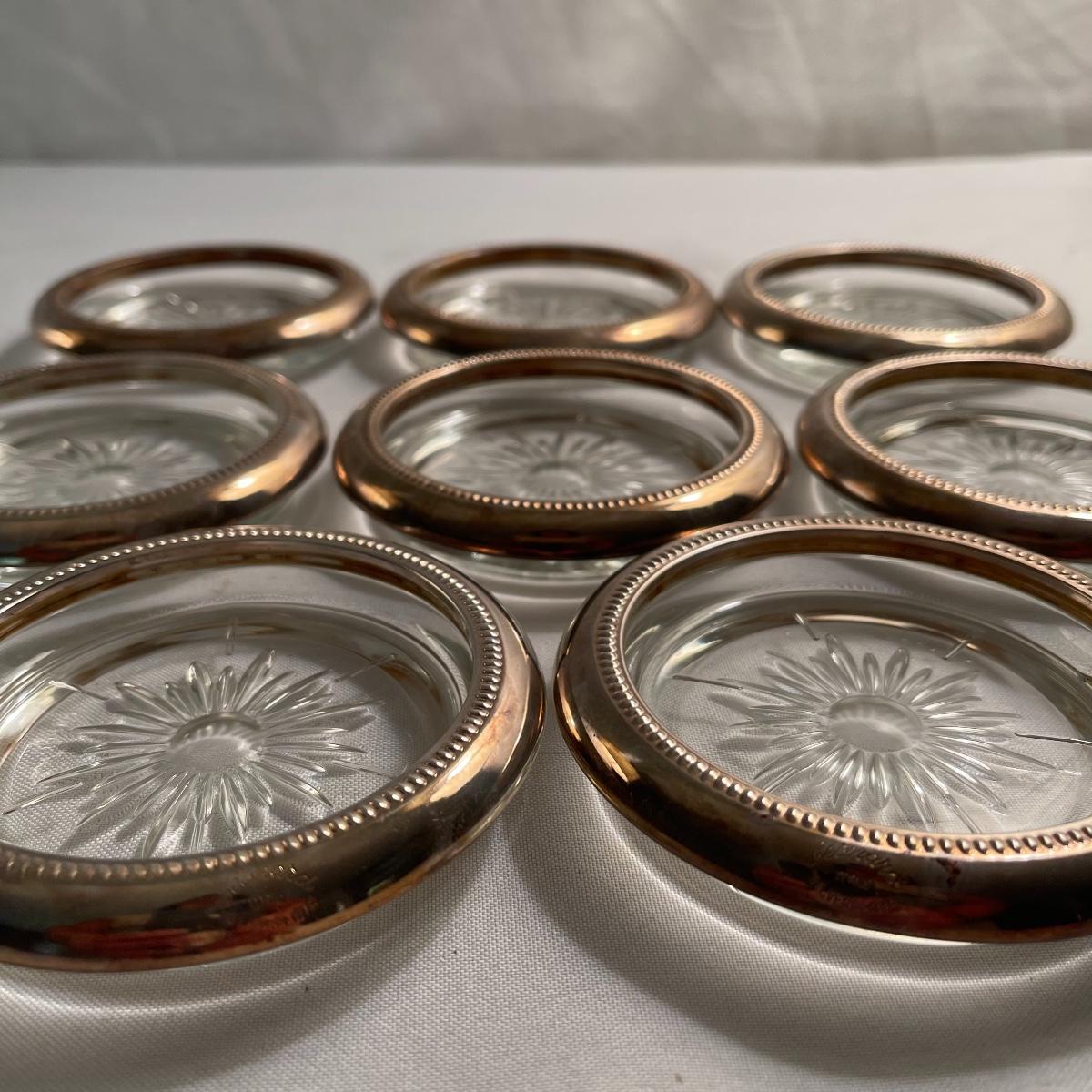 This lot includes silver-plates and silver colored platters, picture frames, bells, coasters, and dishes. The two picture frames are Philip Whitney Ltd. 3.5” x 5” silver-plated frames. Eight stackable glass and silver-plated coasters that say “Leonard, Italy, Silverplate” are included alongside another set of coasters; a set of six flat, silver-plated, that sit in their own holding dish. Two bells, one of which says “Proffit Reunion 1987” and “Reed and Barton” are a part of this collection as well as two small silver-plated teaspoons that were made in Korea and have decorative ceramic pieces on their handles. An ovular glass dish sits in a silver-plated holder with handles, similarly, two shallow glass dishes sit in their silver-colored holder. Lastly two serving platters, one made in Hong Kong and lightweight and the other says “Rogers and Bro 1772” and is silver-plated and heavier in weight.