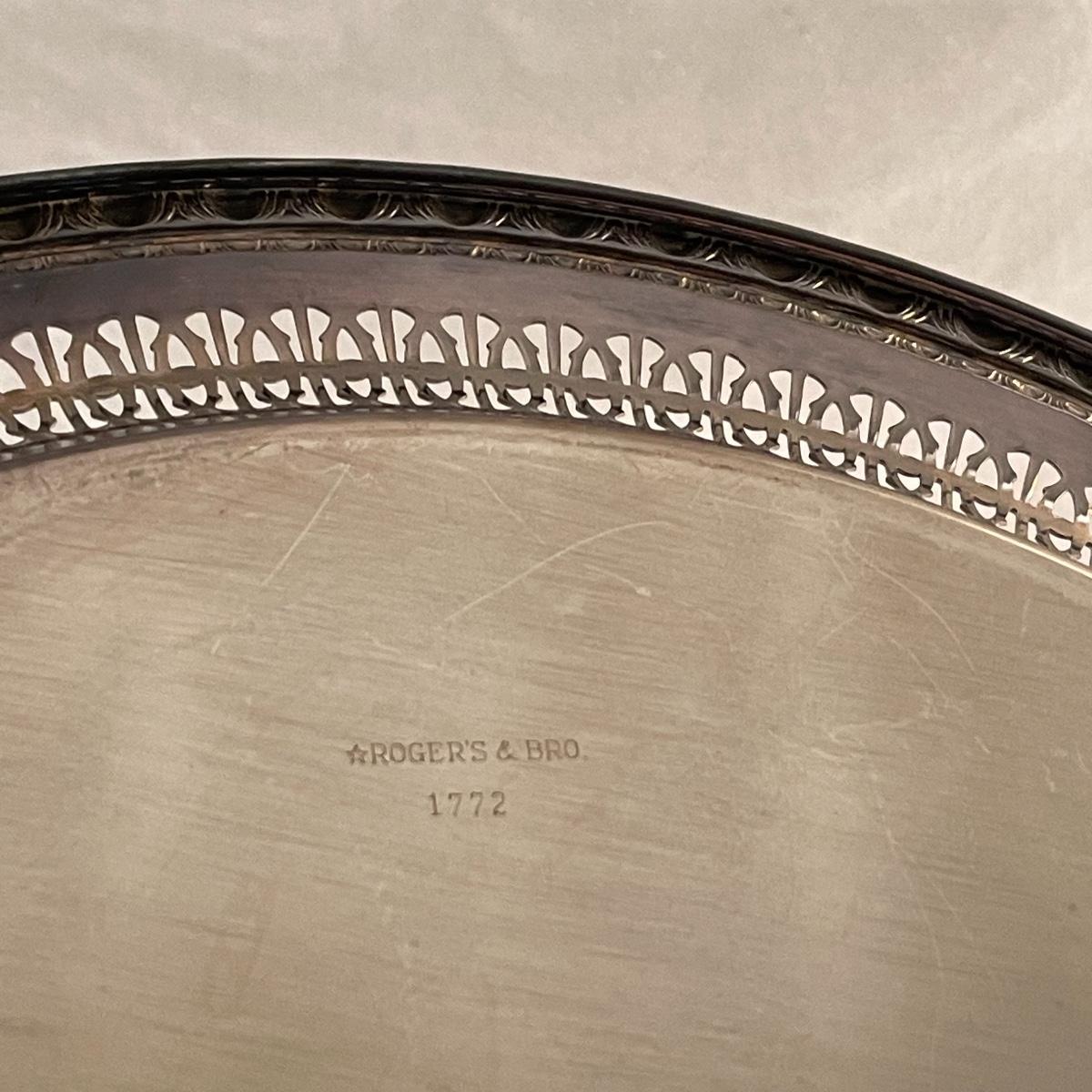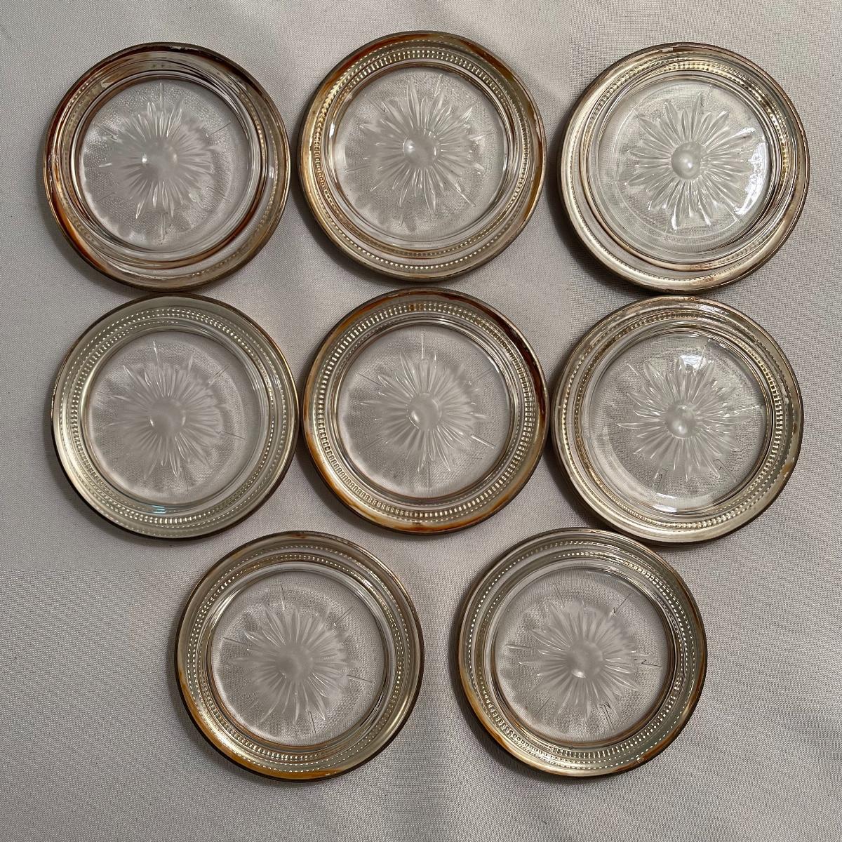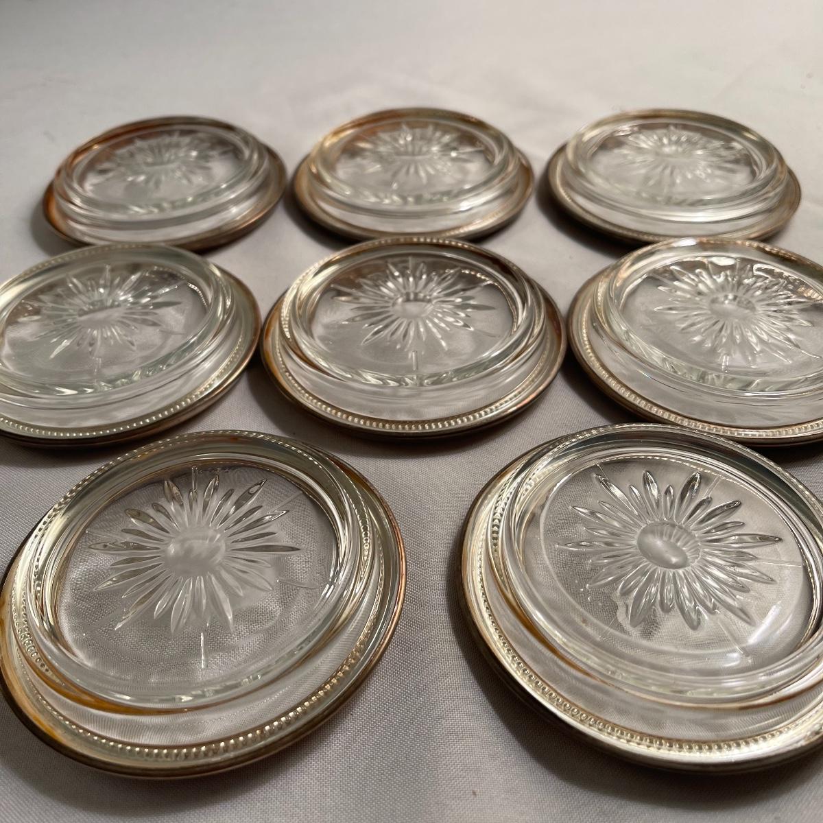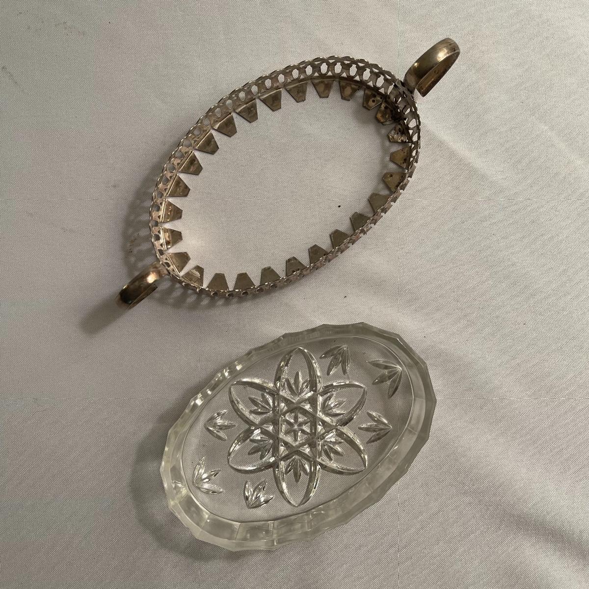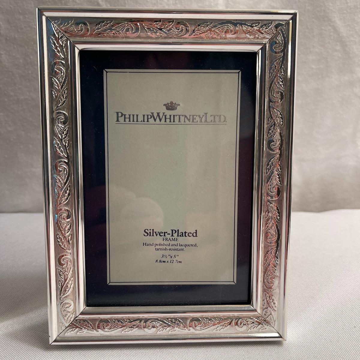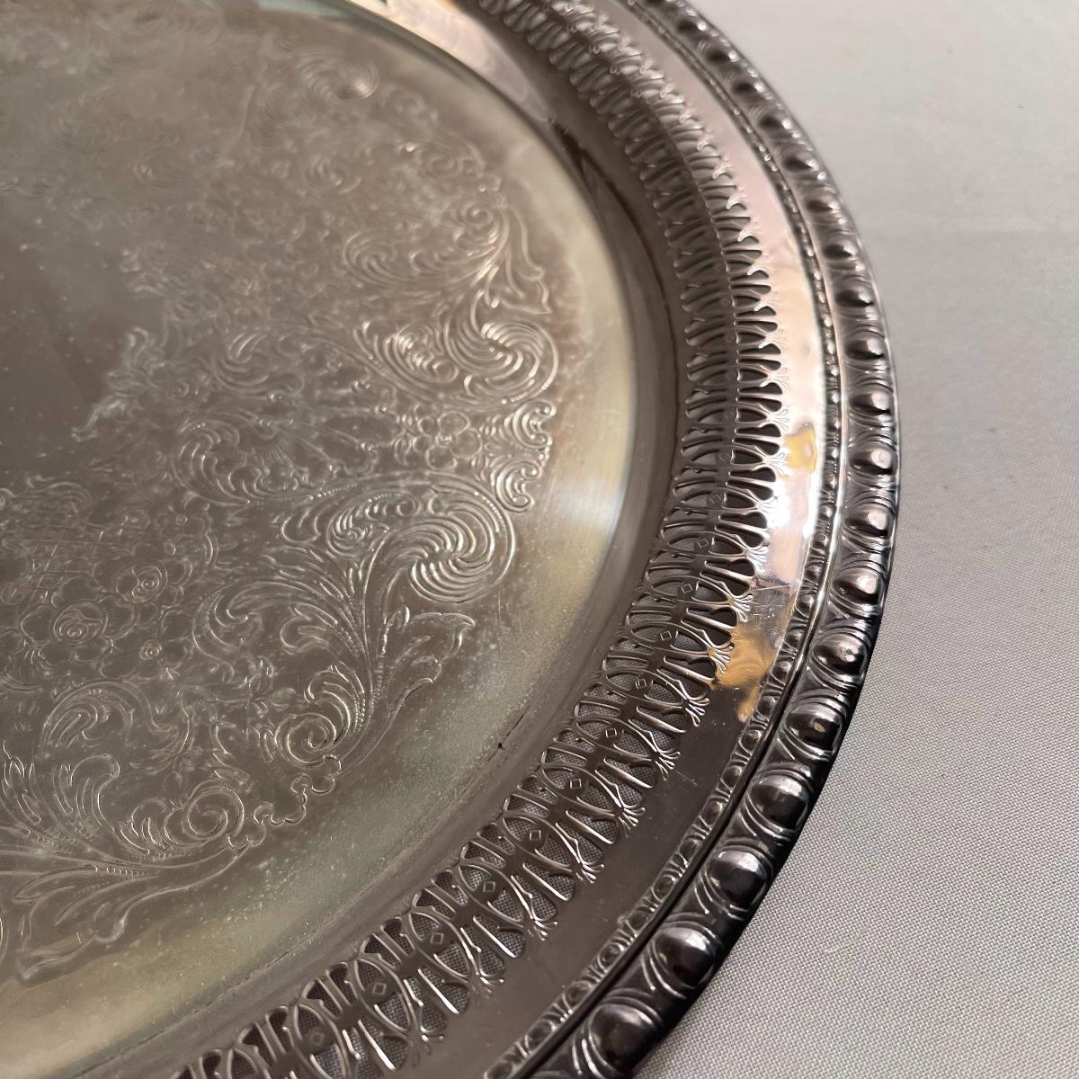 This lot includes silver-plates and silver colored platters, picture frames, bells, coasters, and dishes. The two picture frames are Philip Whitney Ltd. 3.5” x 5” silver-plated frames. Eight stackable glass and silver-plated coasters that say “Leonard, Italy, Silverplate” are included alongside another set of coasters; a set of six flat, silver-plated, that sit in their own holding dish. Two bells, one of which says “Proffit Reunion 1987” and “Reed and Barton” are a part of this collection as well as two small silver-plated teaspoons that were made in Korea and have decorative ceramic pieces on their handles. An ovular glass dish sits in a silver-plated holder with handles, similarly, two shallow glass dishes sit in their silver-colored holder. Lastly two serving platters, one made in Hong Kong and lightweight and the other says “Rogers and Bro 1772” and is silver-plated and heavier in weight.