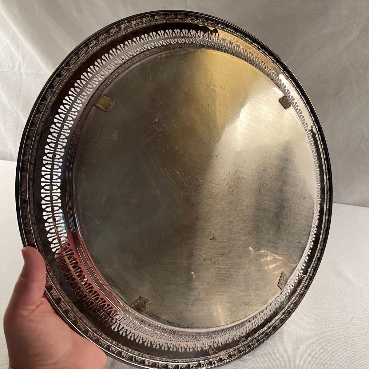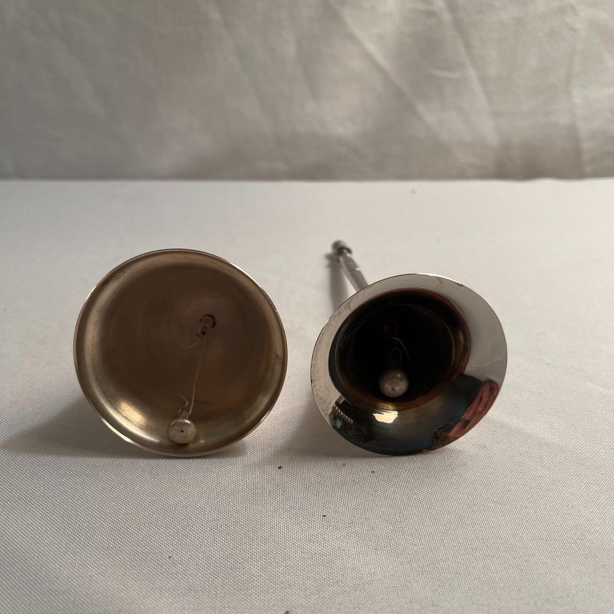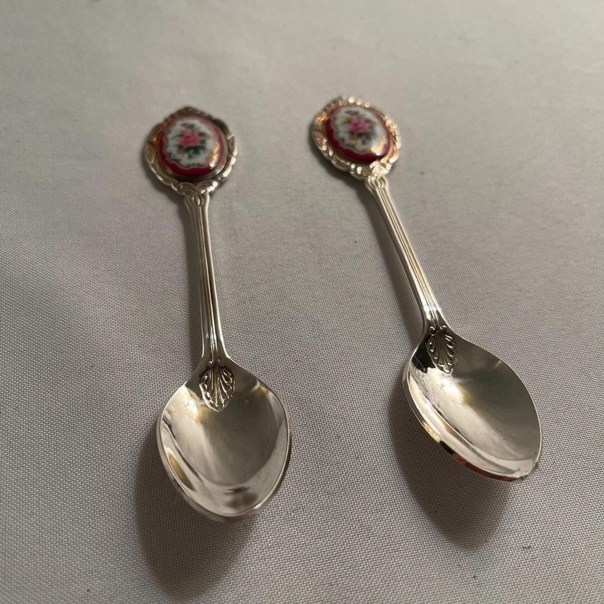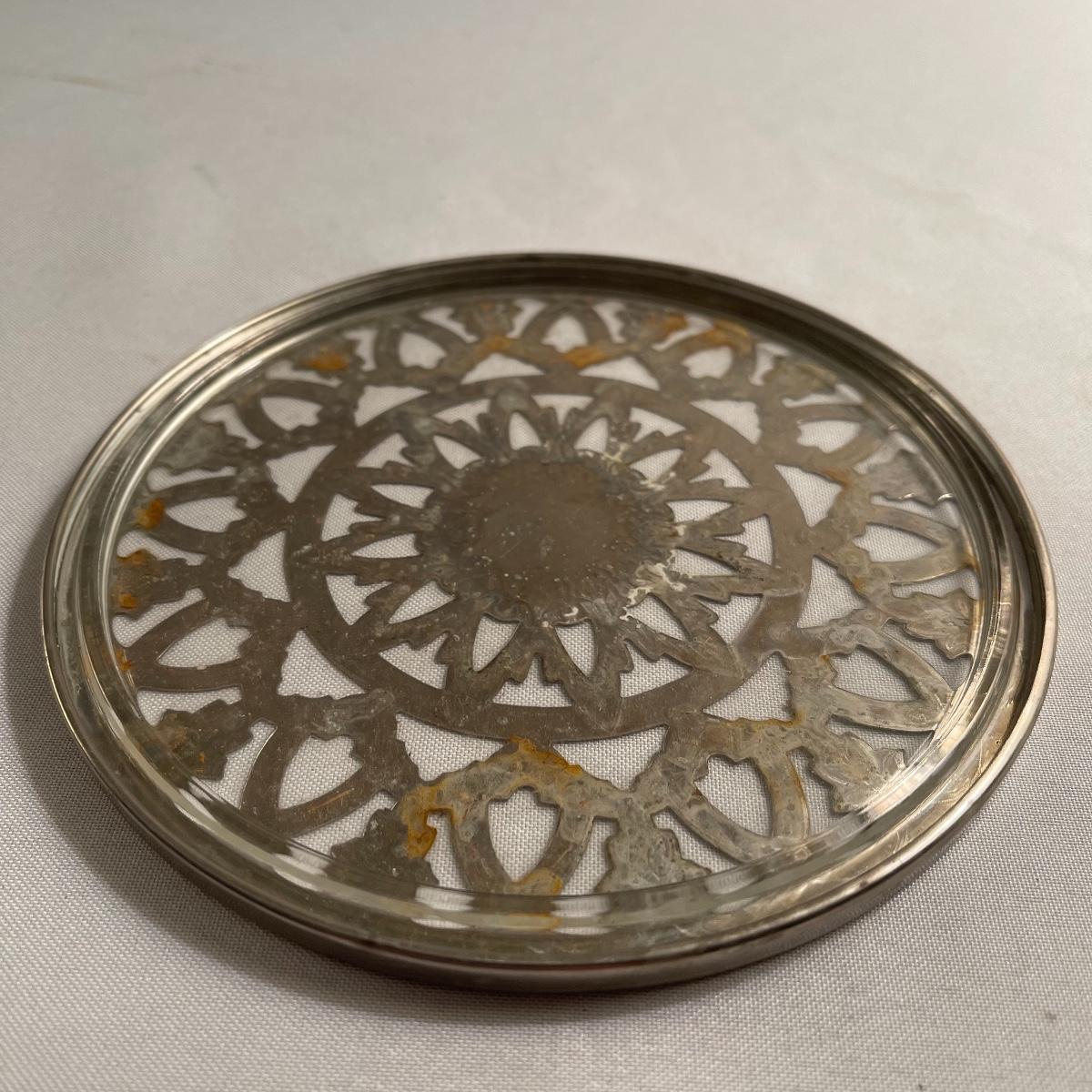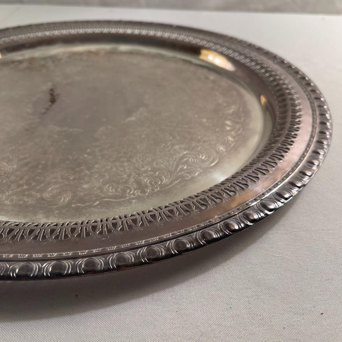 This lot includes silver-plates and silver colored platters, picture frames, bells, coasters, and dishes. The two picture frames are Philip Whitney Ltd. 3.5” x 5” silver-plated frames. Eight stackable glass and silver-plated coasters that say “Leonard, Italy, Silverplate” are included alongside another set of coasters; a set of six flat, silver-plated, that sit in their own holding dish. Two bells, one of which says “Proffit Reunion 1987” and “Reed and Barton” are a part of this collection as well as two small silver-plated teaspoons that were made in Korea and have decorative ceramic pieces on their handles. An ovular glass dish sits in a silver-plated holder with handles, similarly, two shallow glass dishes sit in their silver-colored holder. Lastly two serving platters, one made in Hong Kong and lightweight and the other says “Rogers and Bro 1772” and is silver-plated and heavier in weight.