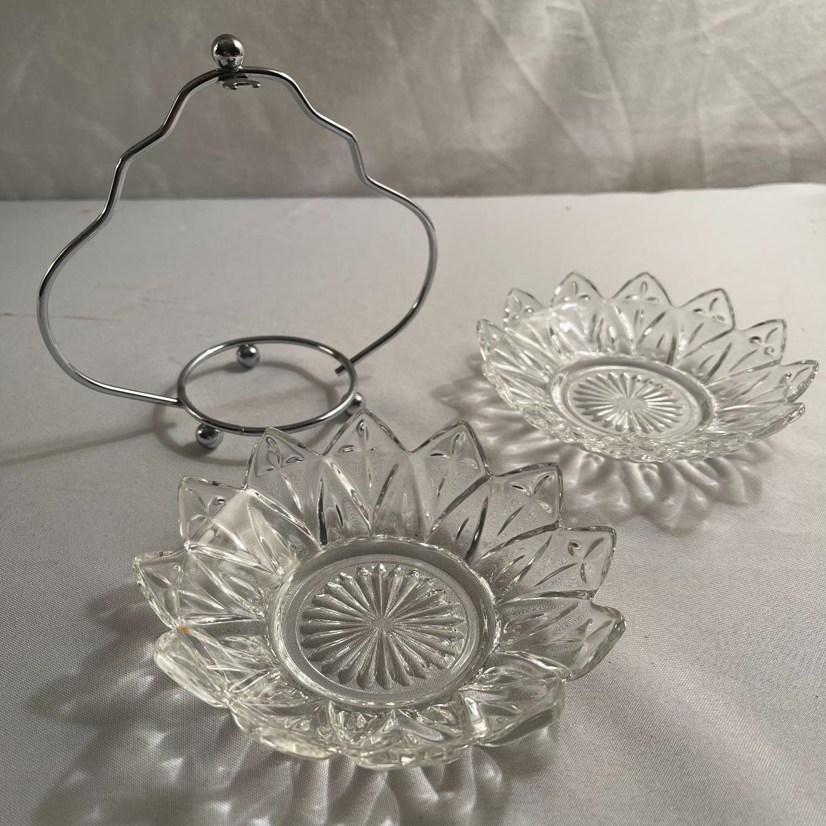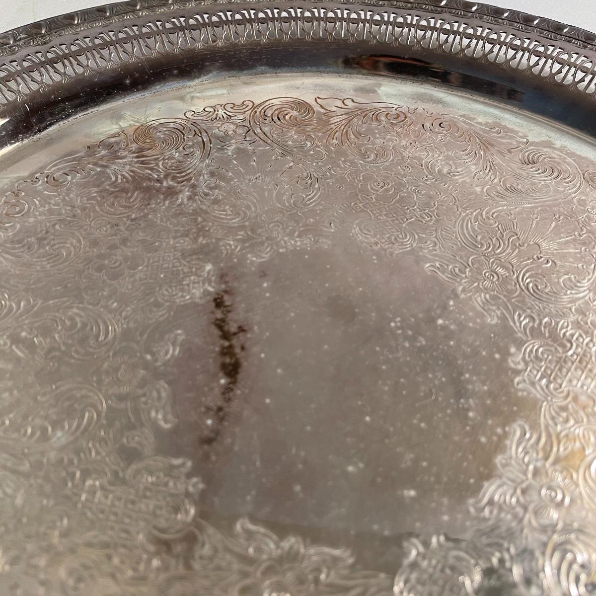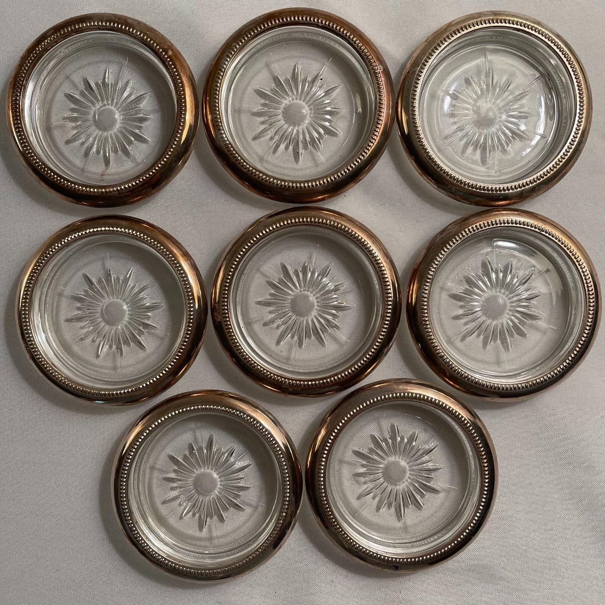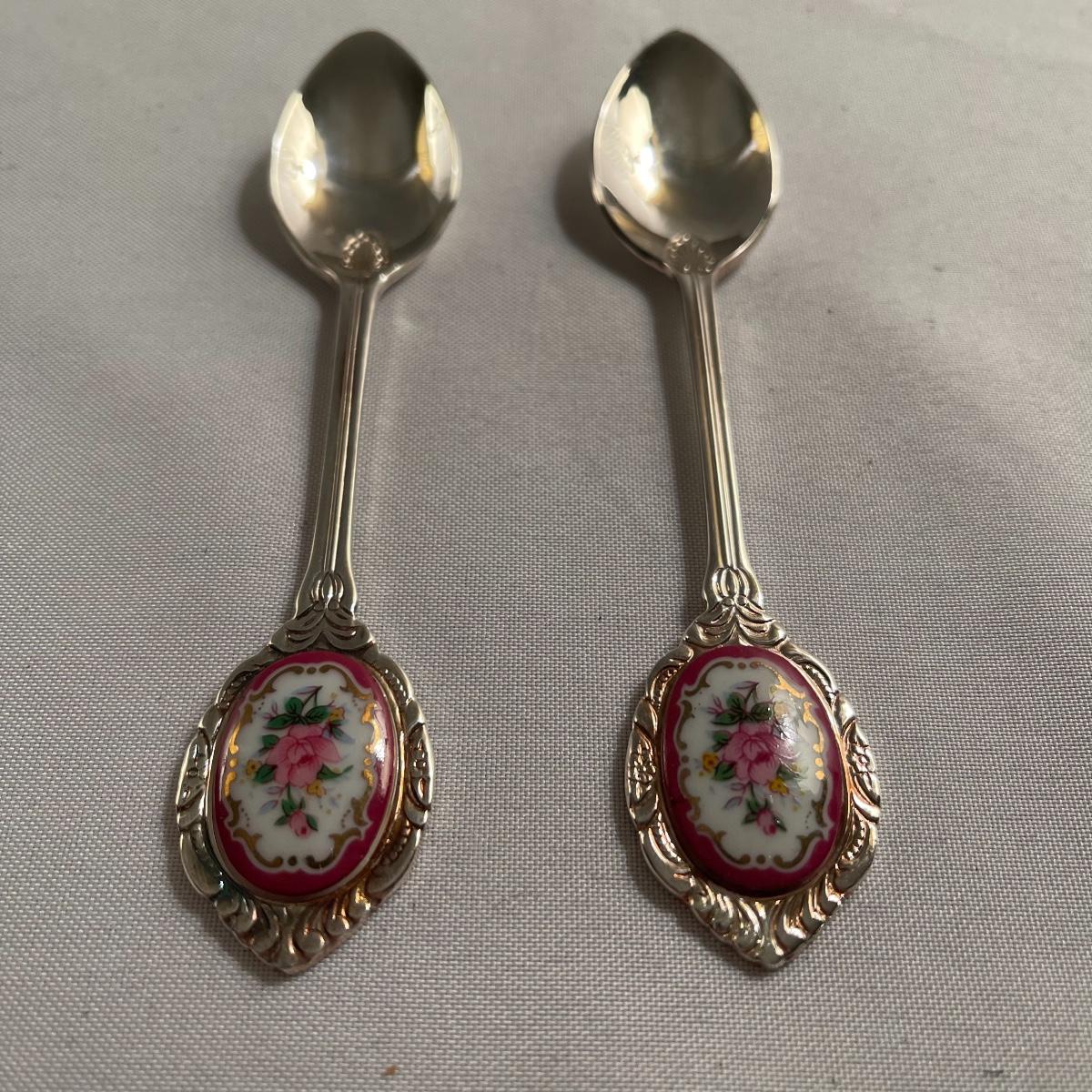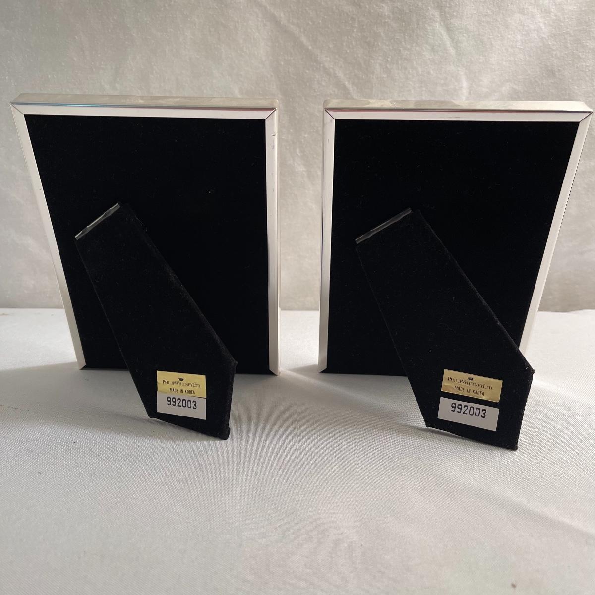 This lot includes silver-plates and silver colored platters, picture frames, bells, coasters, and dishes. The two picture frames are Philip Whitney Ltd. 3.5” x 5” silver-plated frames. Eight stackable glass and silver-plated coasters that say “Leonard, Italy, Silverplate” are included alongside another set of coasters; a set of six flat, silver-plated, that sit in their own holding dish. Two bells, one of which says “Proffit Reunion 1987” and “Reed and Barton” are a part of this collection as well as two small silver-plated teaspoons that were made in Korea and have decorative ceramic pieces on their handles. An ovular glass dish sits in a silver-plated holder with handles, similarly, two shallow glass dishes sit in their silver-colored holder. Lastly two serving platters, one made in Hong Kong and lightweight and the other says “Rogers and Bro 1772” and is silver-plated and heavier in weight.
