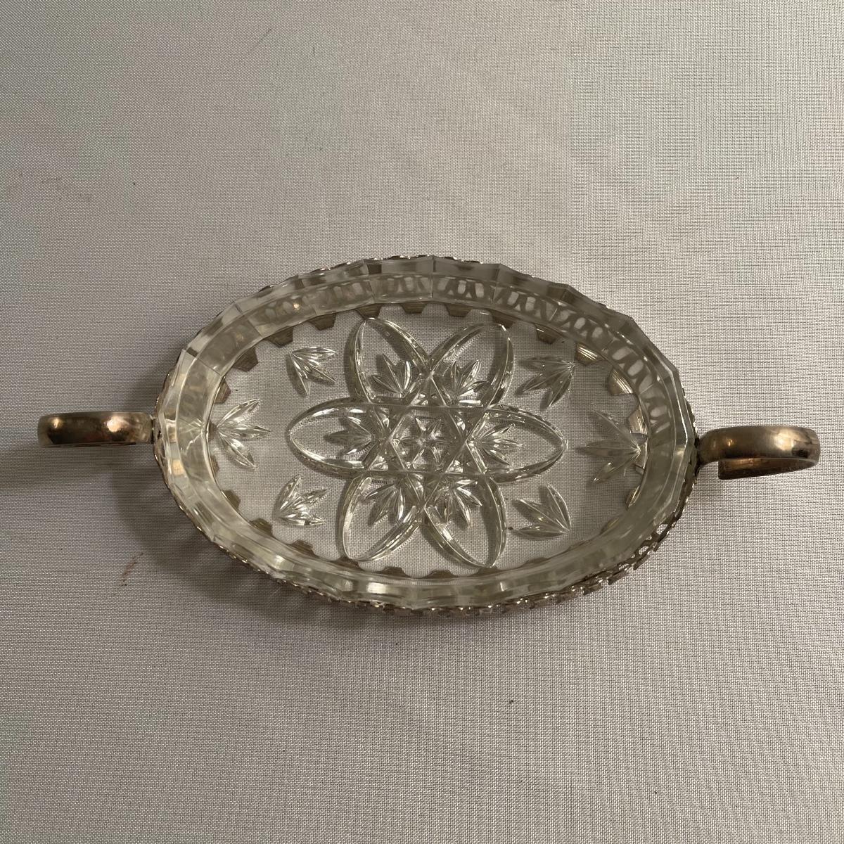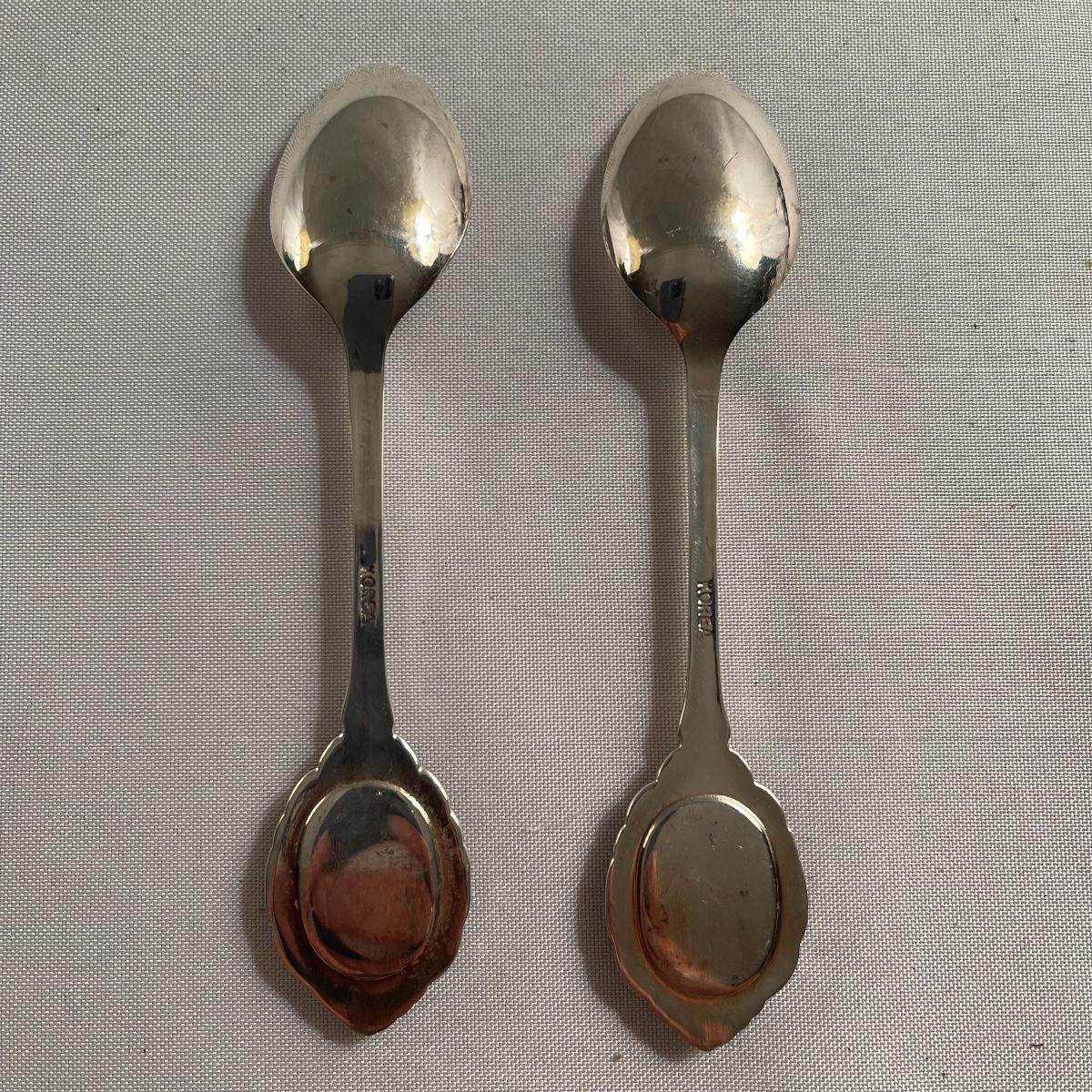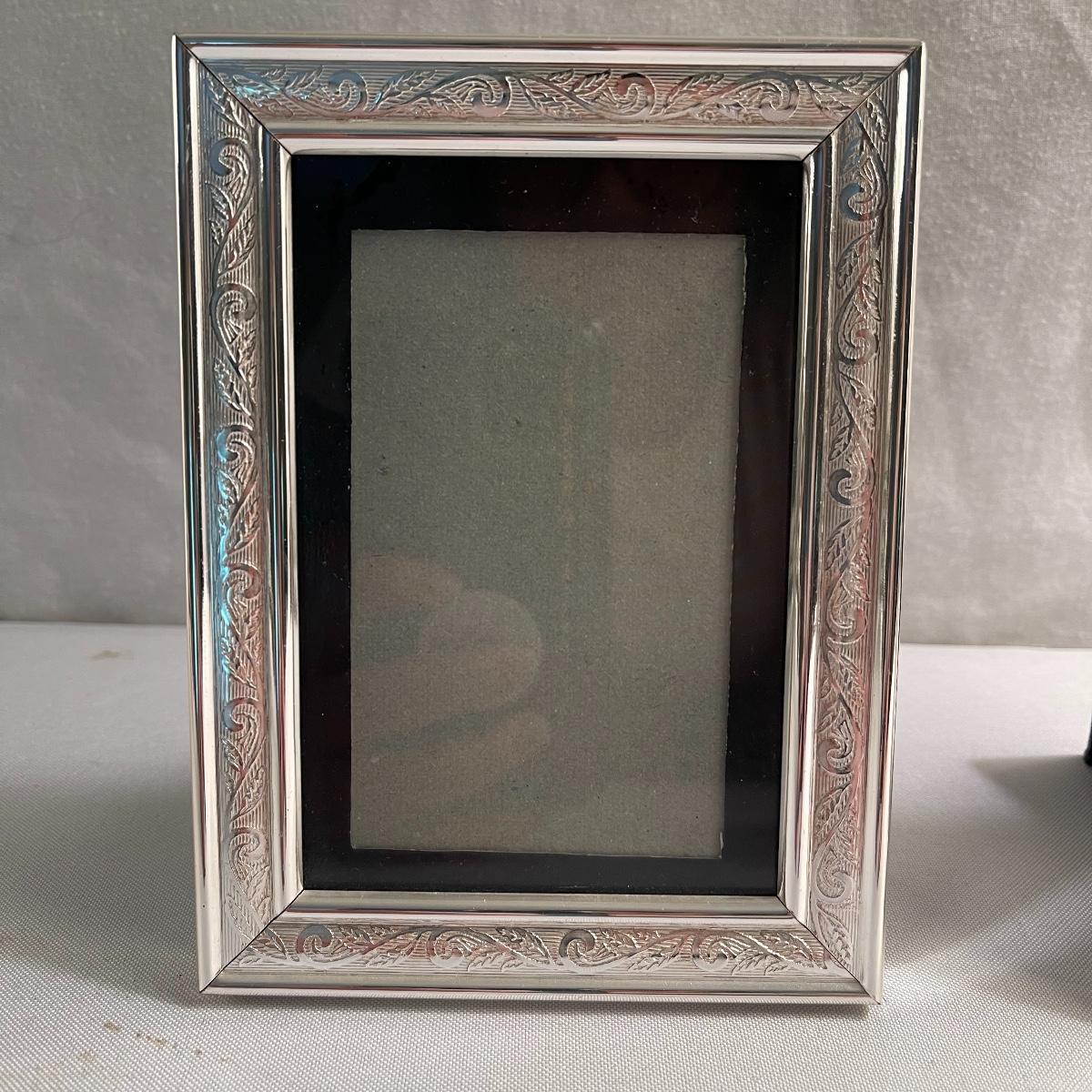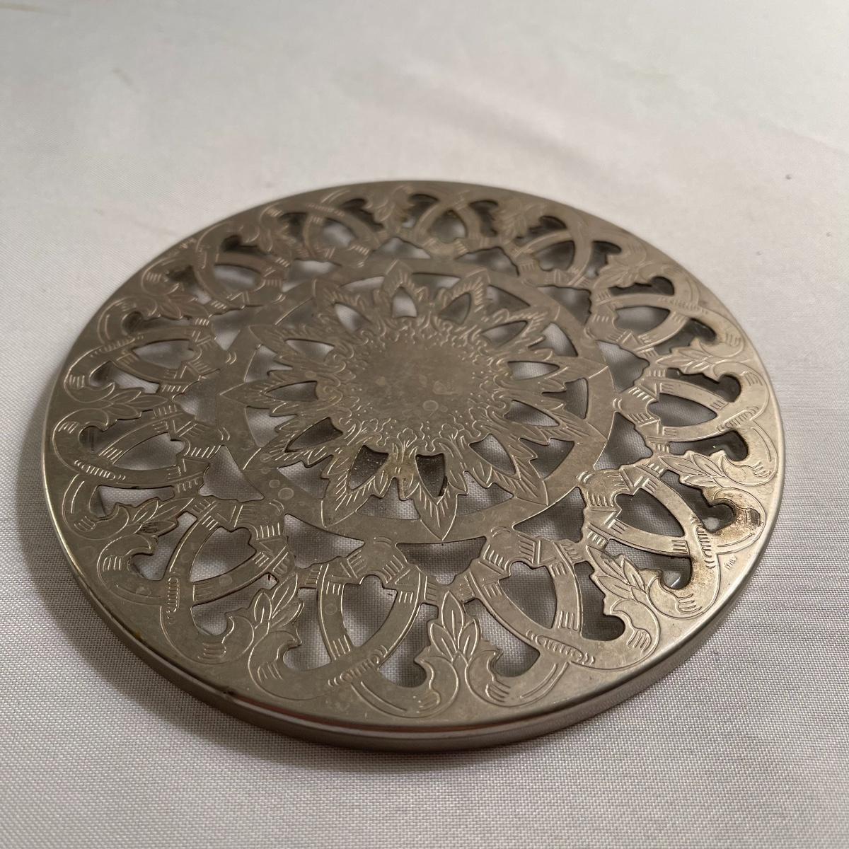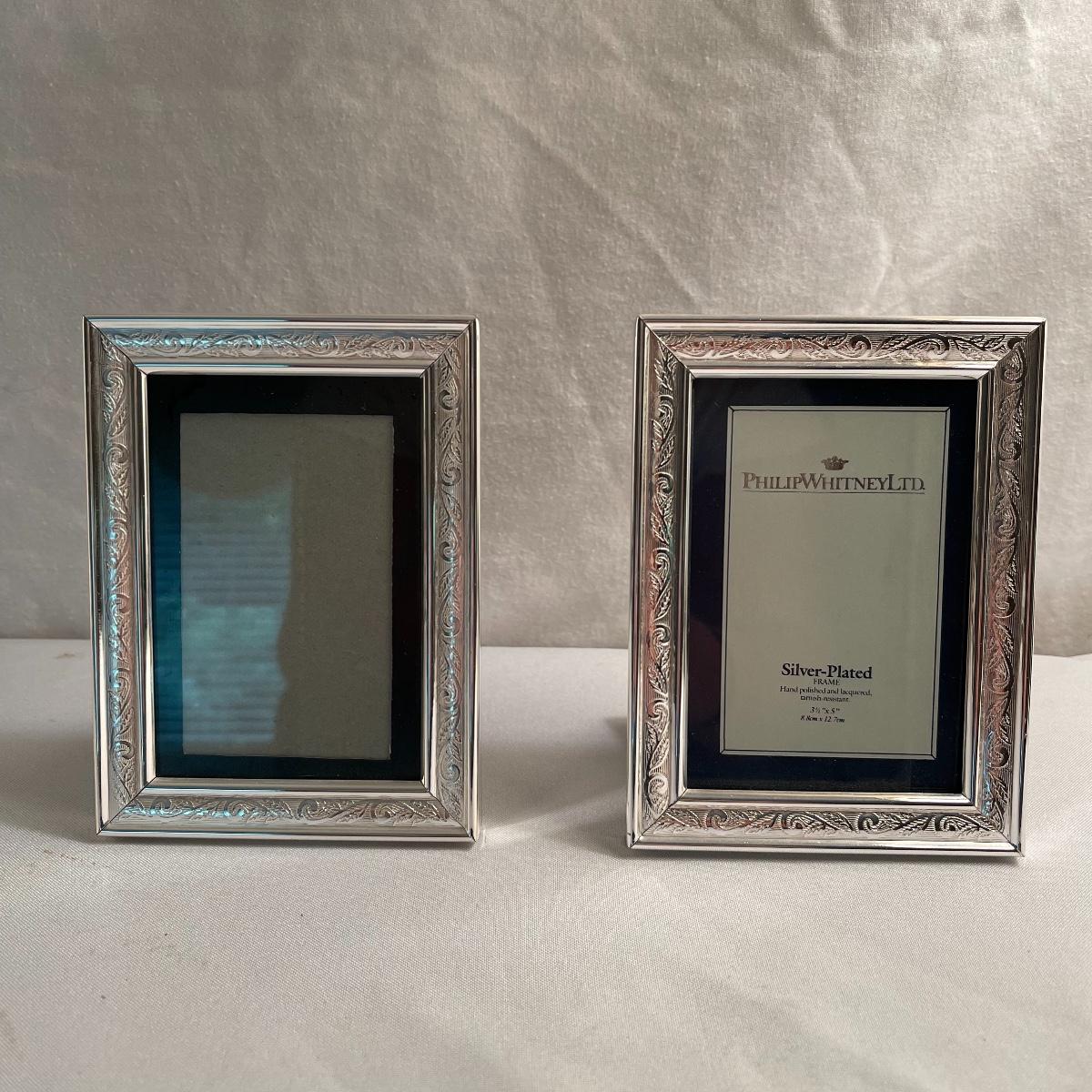 This lot includes silver-plates and silver colored platters, picture frames, bells, coasters, and dishes. The two picture frames are Philip Whitney Ltd. 3.5” x 5” silver-plated frames. Eight stackable glass and silver-plated coasters that say “Leonard, Italy, Silverplate” are included alongside another set of coasters; a set of six flat, silver-plated, that sit in their own holding dish. Two bells, one of which says “Proffit Reunion 1987” and “Reed and Barton” are a part of this collection as well as two small silver-plated teaspoons that were made in Korea and have decorative ceramic pieces on their handles. An ovular glass dish sits in a silver-plated holder with handles, similarly, two shallow glass dishes sit in their silver-colored holder. Lastly two serving platters, one made in Hong Kong and lightweight and the other says “Rogers and Bro 1772” and is silver-plated and heavier in weight.
