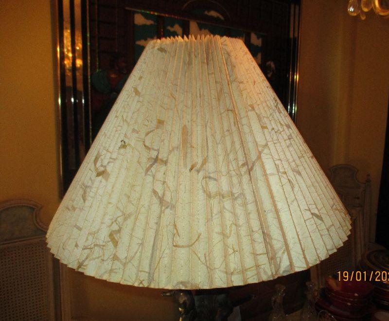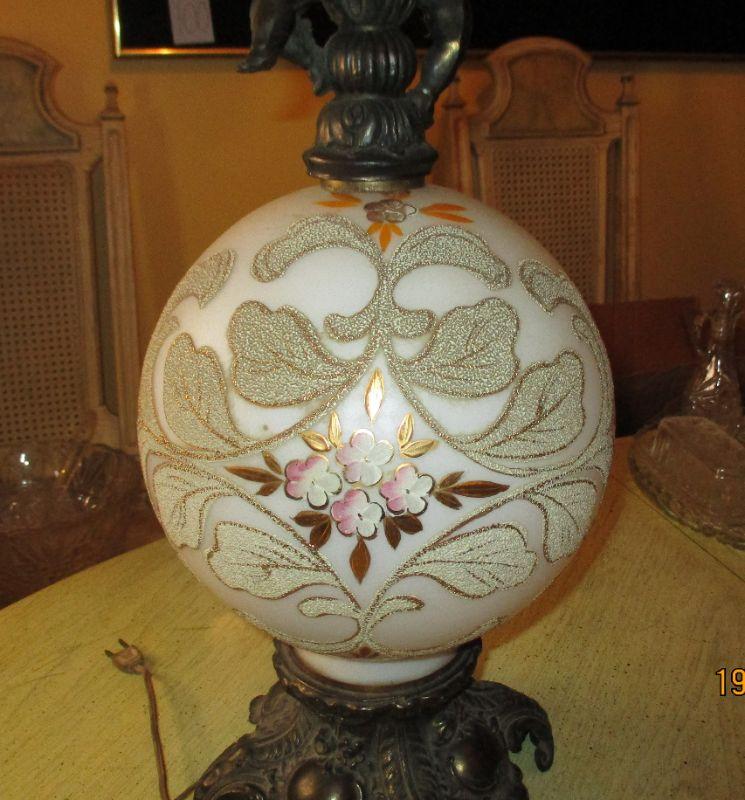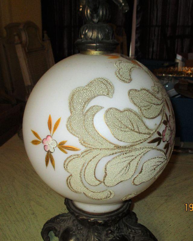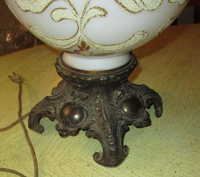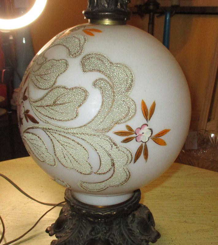 This is an absolutely gorgeous lamp that will be the highlight of any room. It has a paper lamp shade, but the finial is lost. It stands 37.75" tall and the glass base is about 9.5" in diameter.