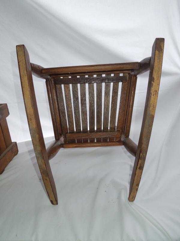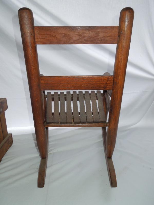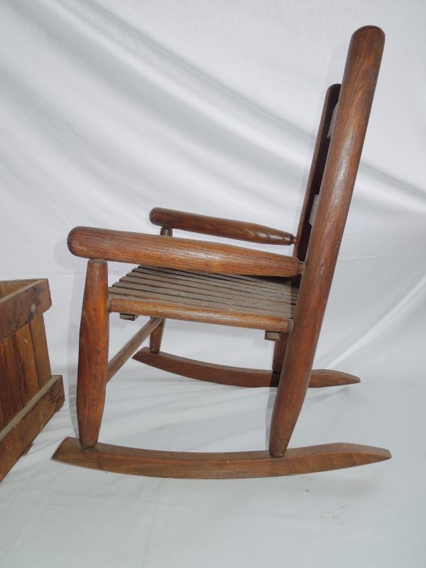 Crate has been lightly stained and varnished. Child's wooden rocker also included. No damage noted to either and both are structurely sound.