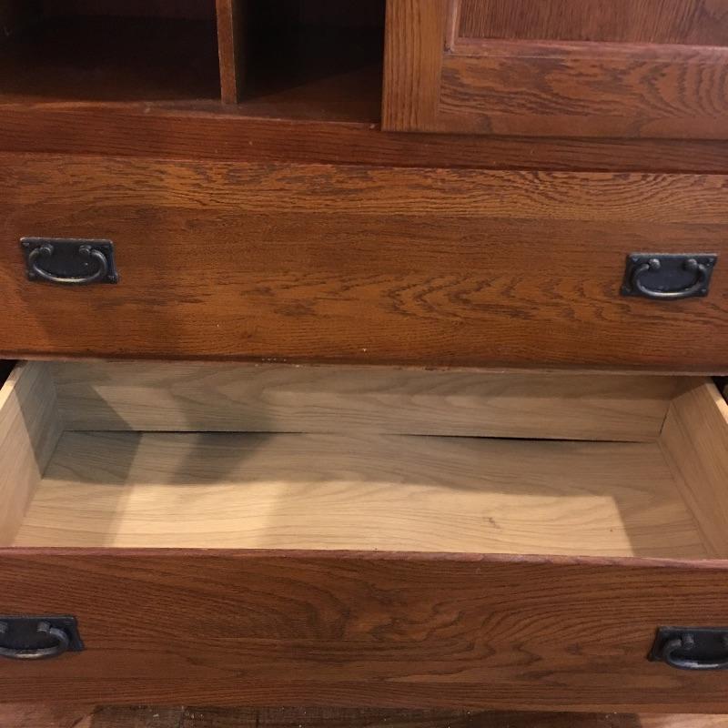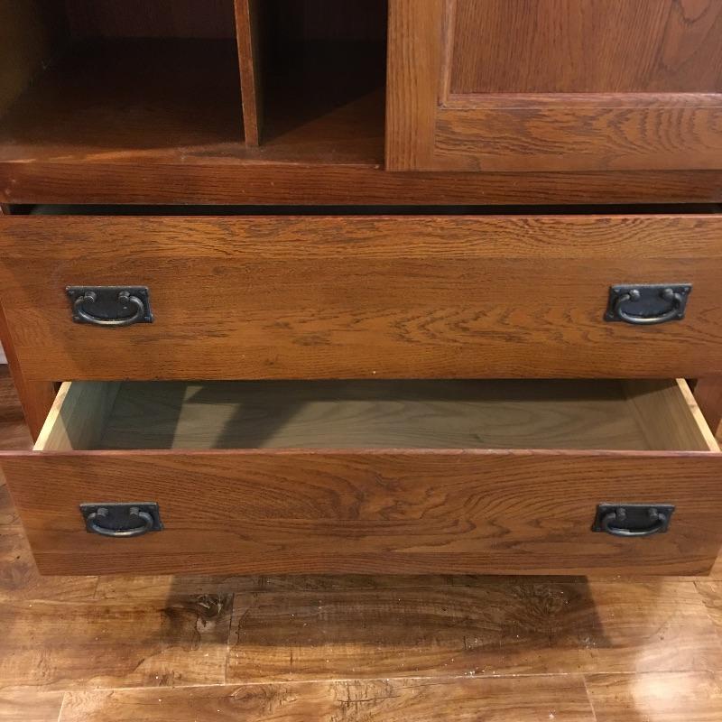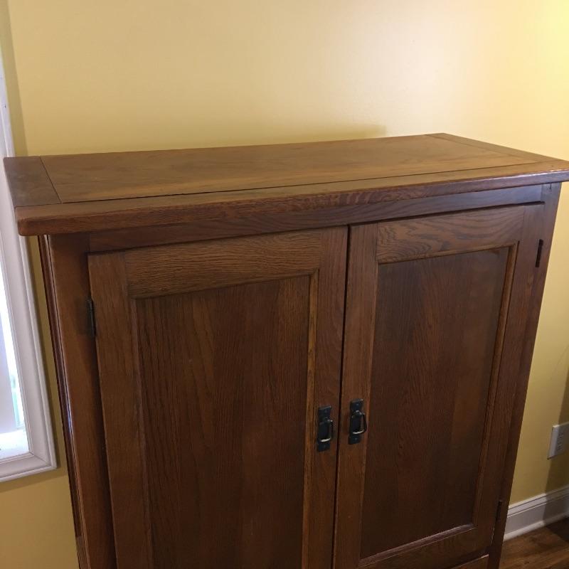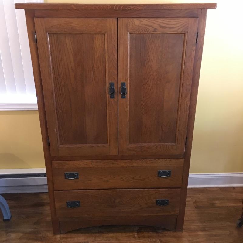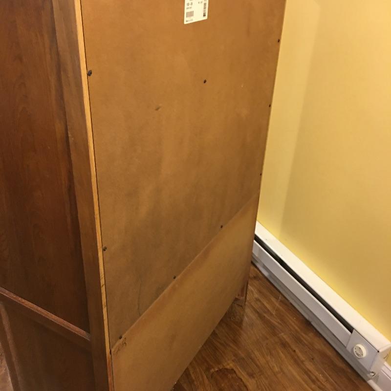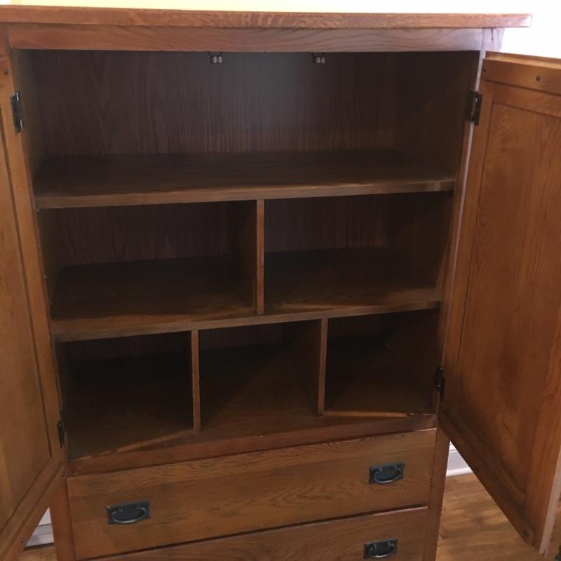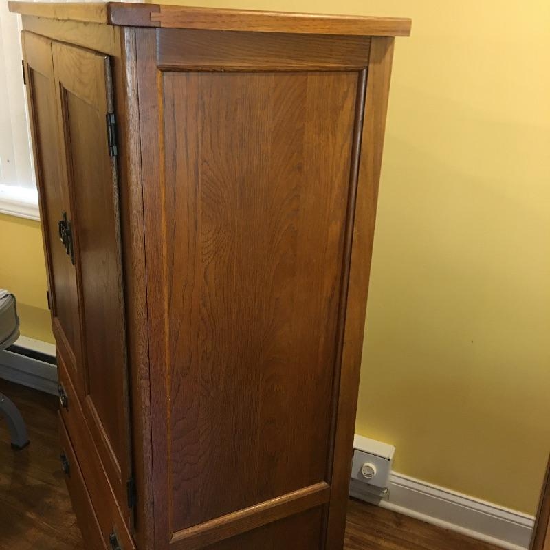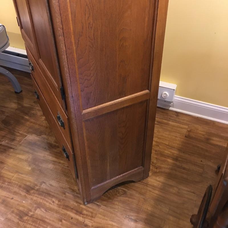 A great way to store all your things and keep them out of sight or open the doors and let everyone see your collection. Armoire has two drawers and three shelves divided into six sections Armoire measures 18” x 40” x 60”. Bring help item is substantial.