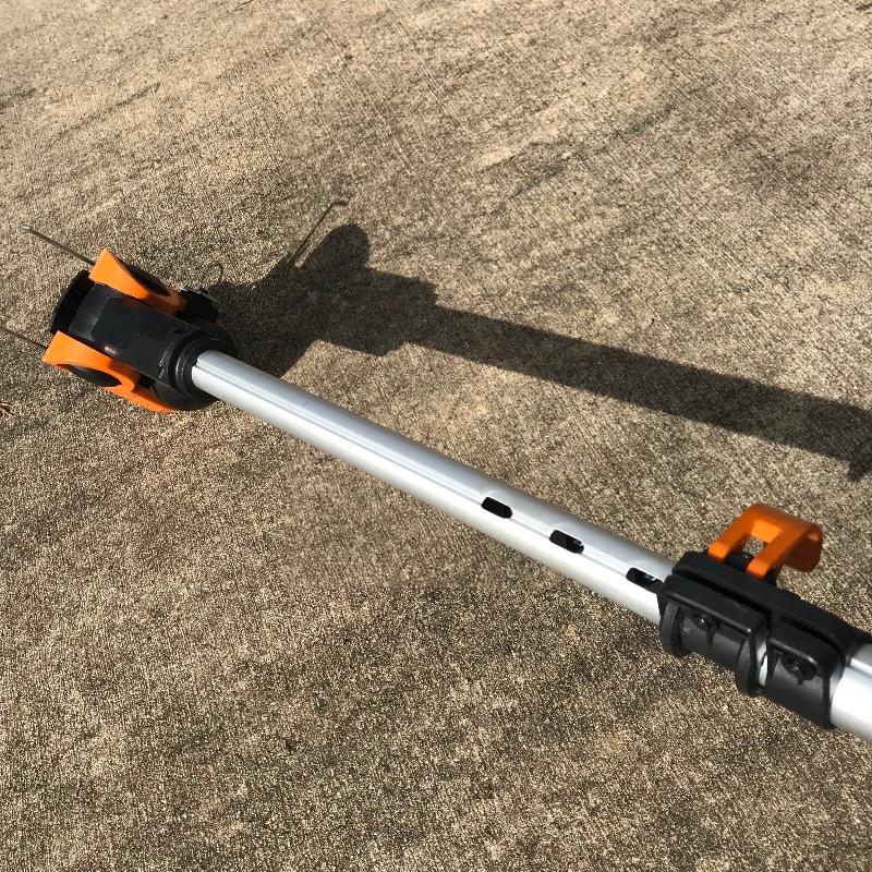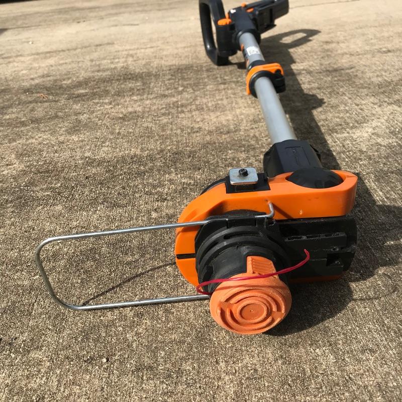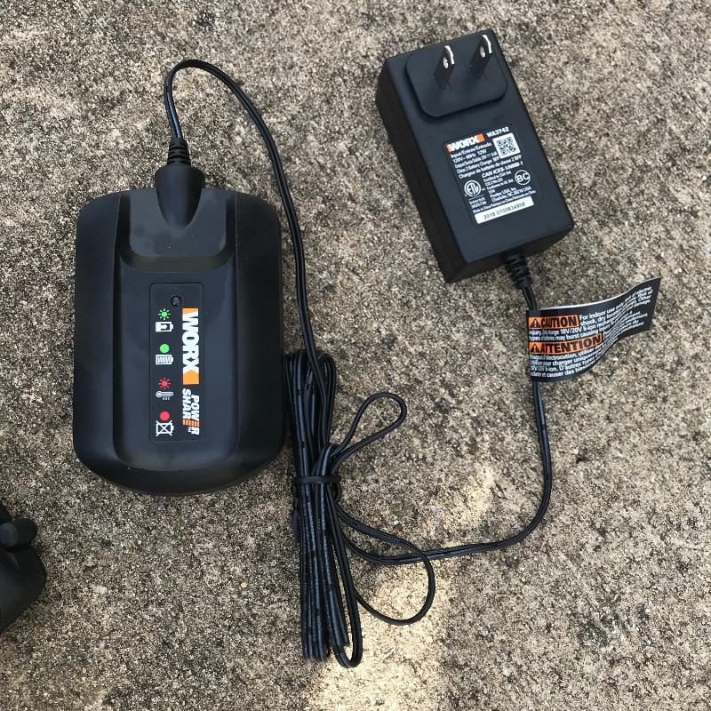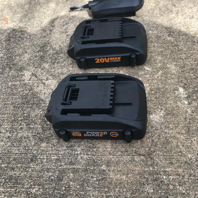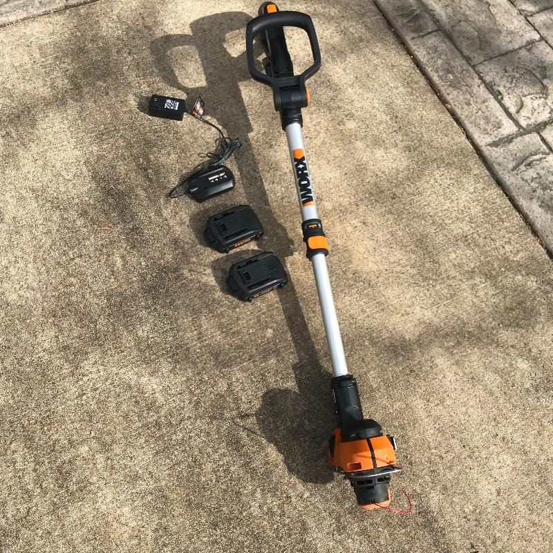 Cordless Worx 20V Easy Feed String Trimmer appears lightly used and comes with two working 20V batteries and charger. Trimmer turns on with both batteries. Handle adjusts for convenience and command feed button lets you extend the line without stopping. See photos. No shipping.