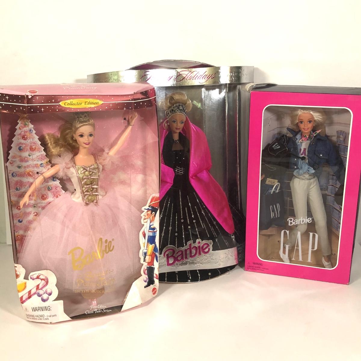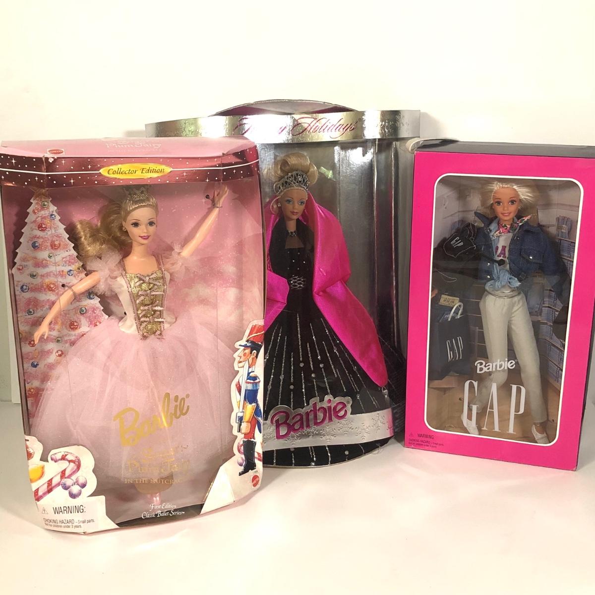 LOT 178L: Mattel Barbies - NIB 1996 Special Edition GAP Blonde Doll, Boxed 1996 Sugar Plum Fairy Doll & 1998 Happy Holidays Blonde Doll