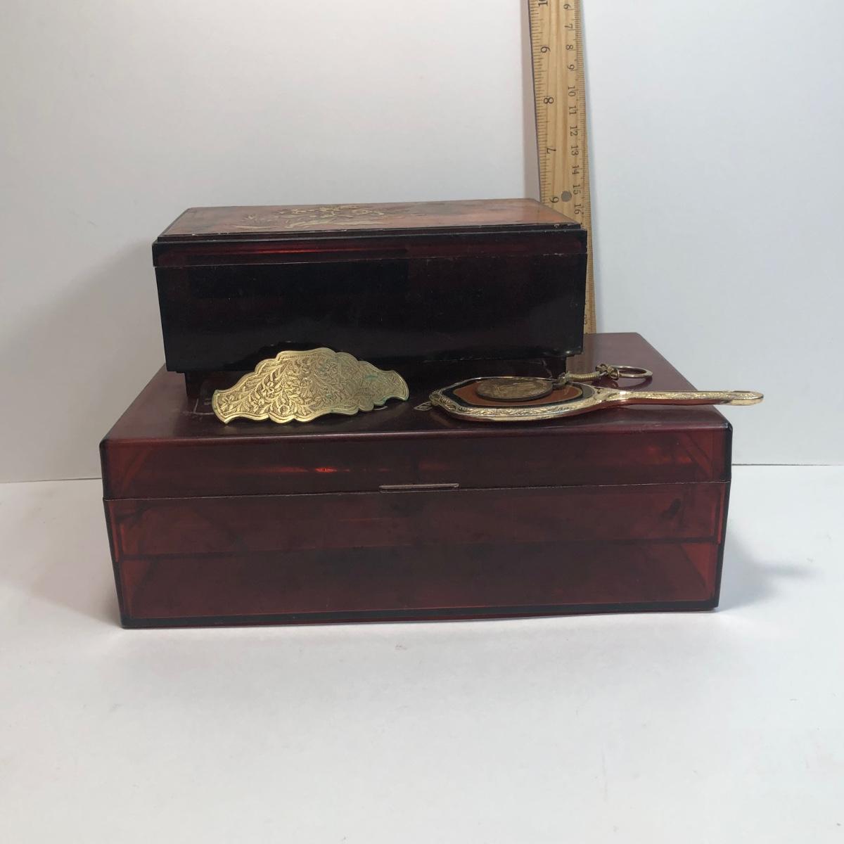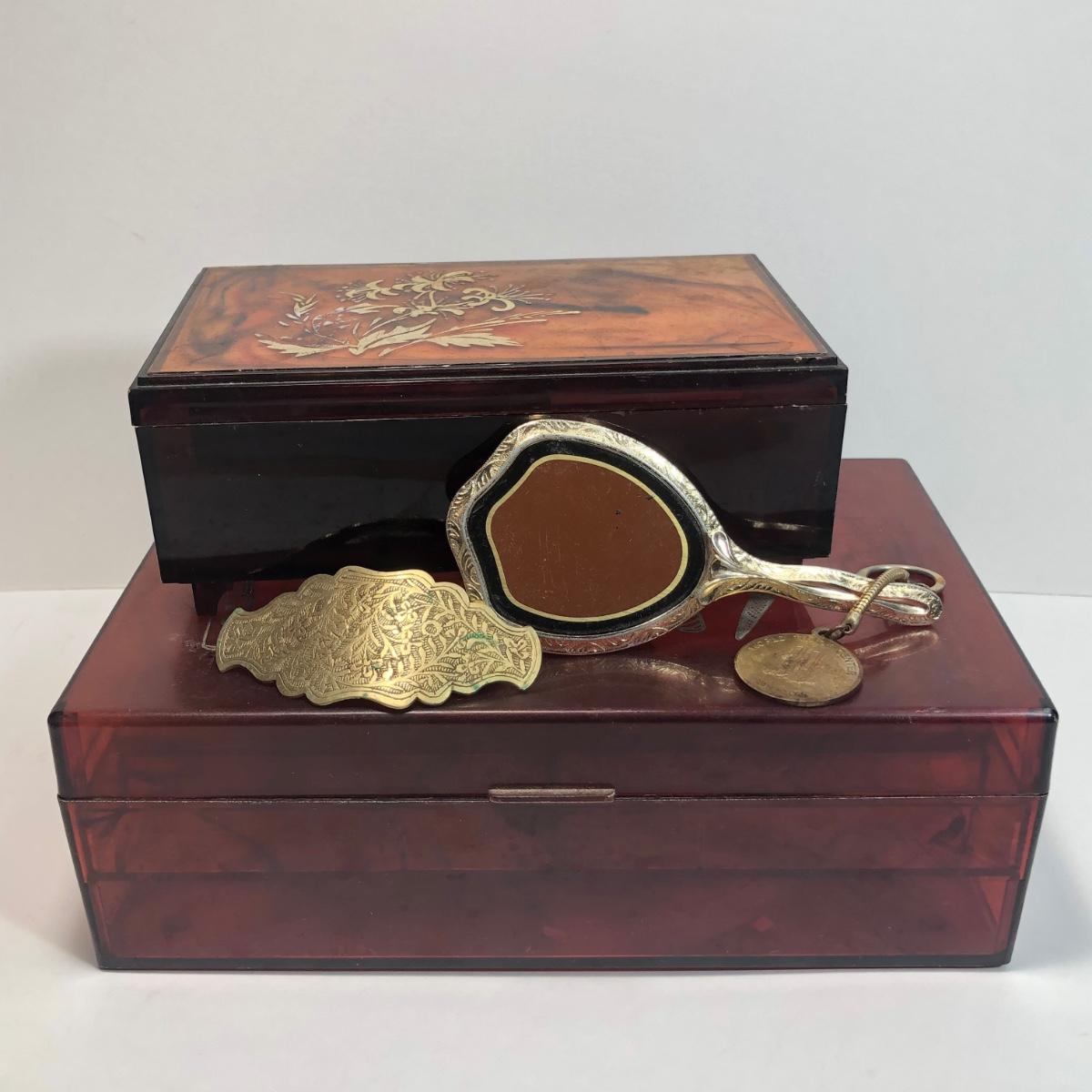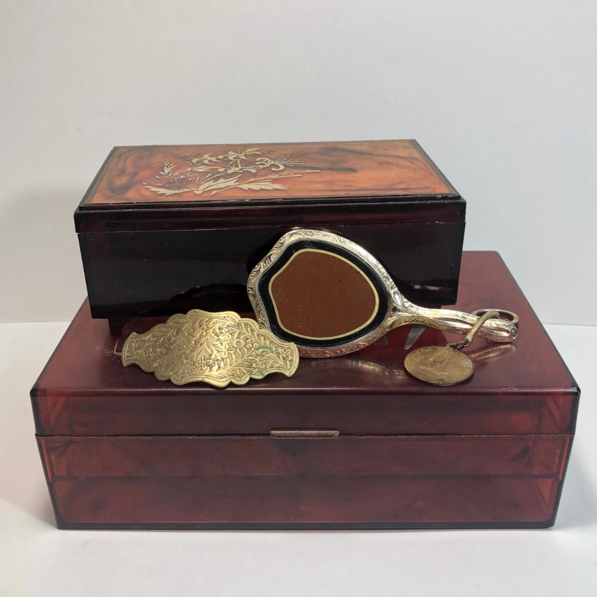 Two small boxes, a World Trade Center coin keepsake, & small hand mirror.