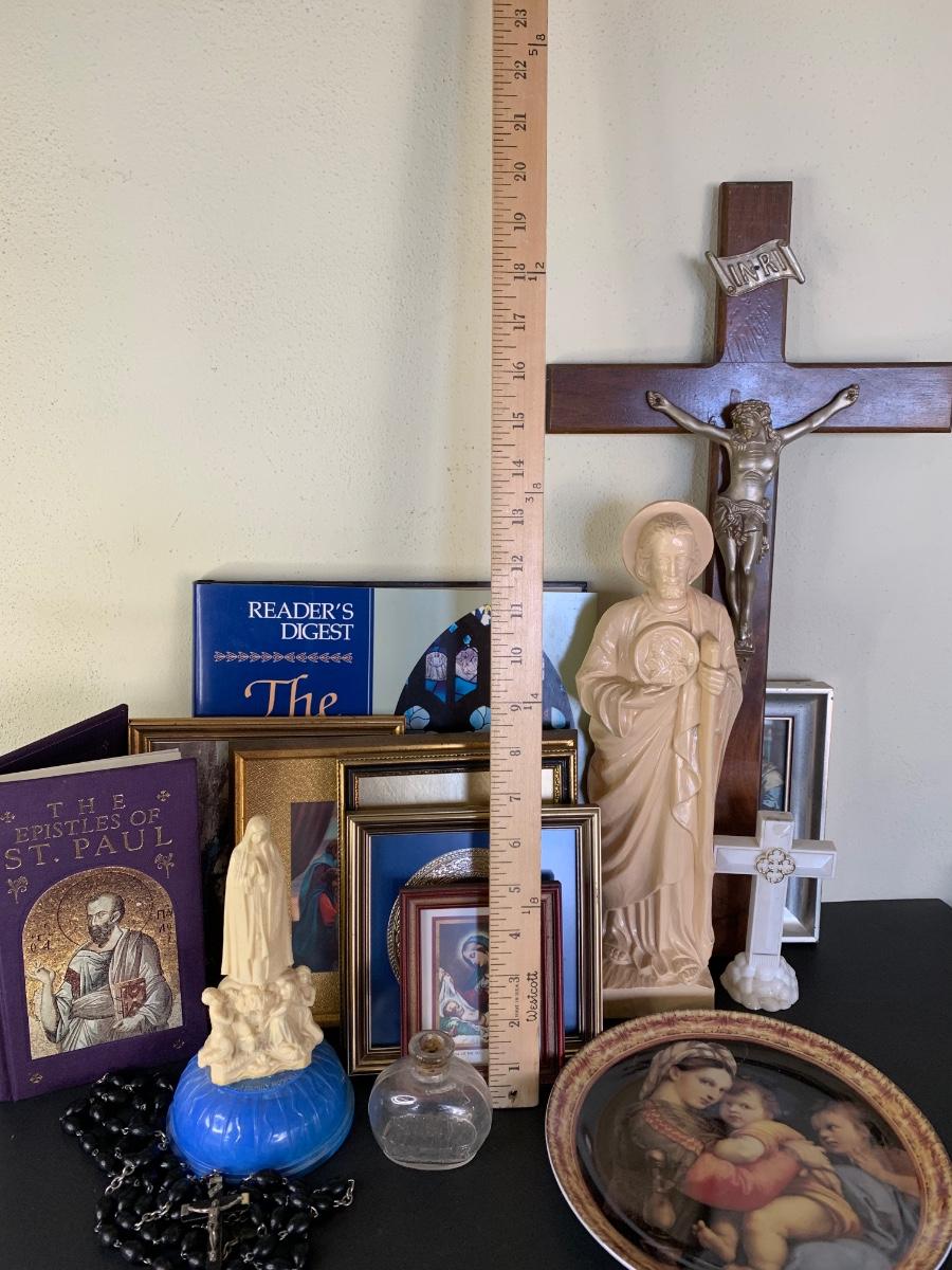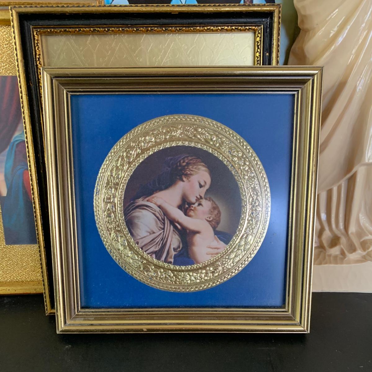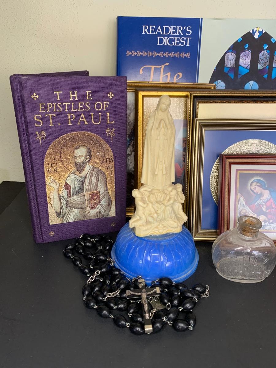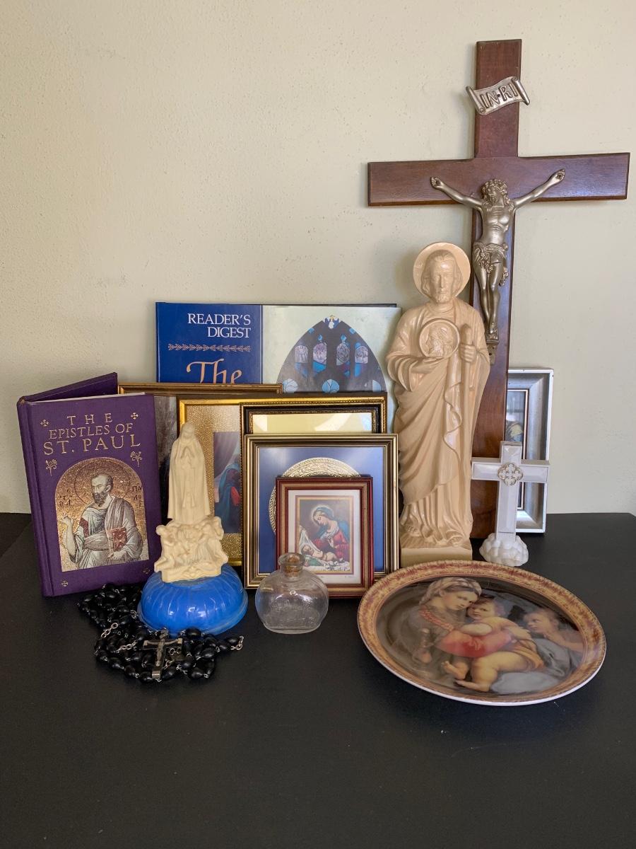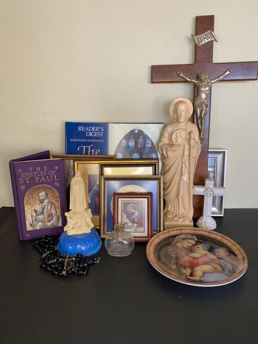 Includes crosses, books, and religious prints. Includes Colezione Madonnas Il Riposo plate.