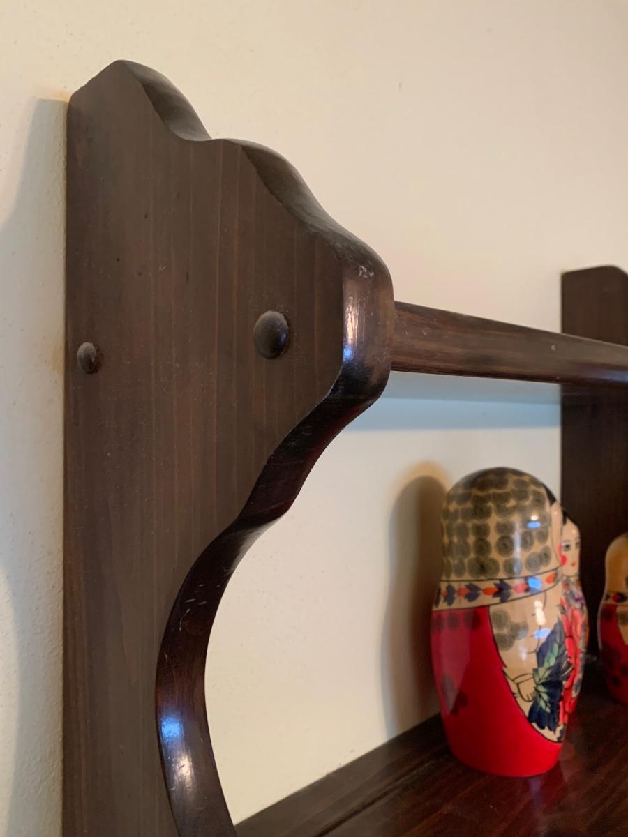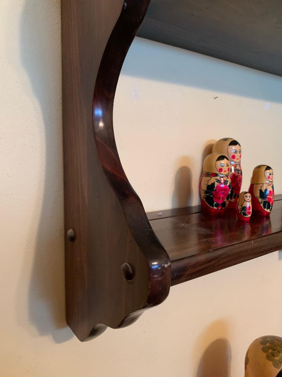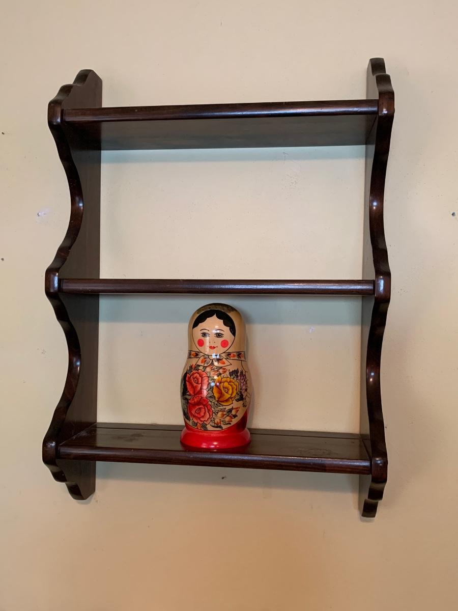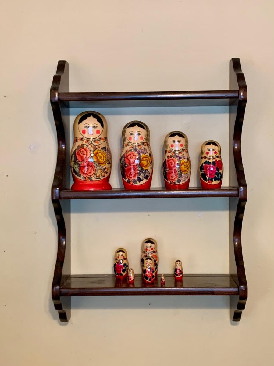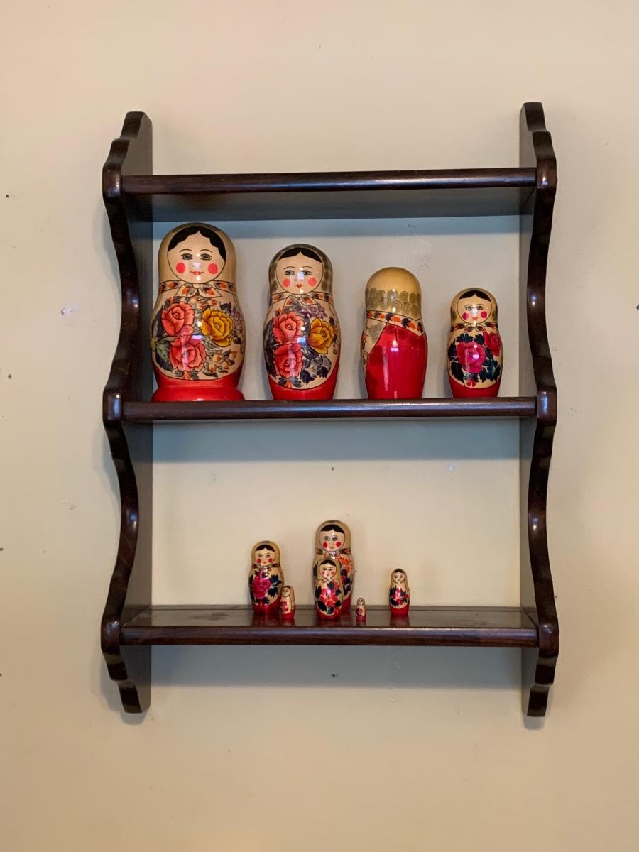 Wooden wall shelf with a set of nesting dolls. Unfortunately there is a crack in one of the dolls.