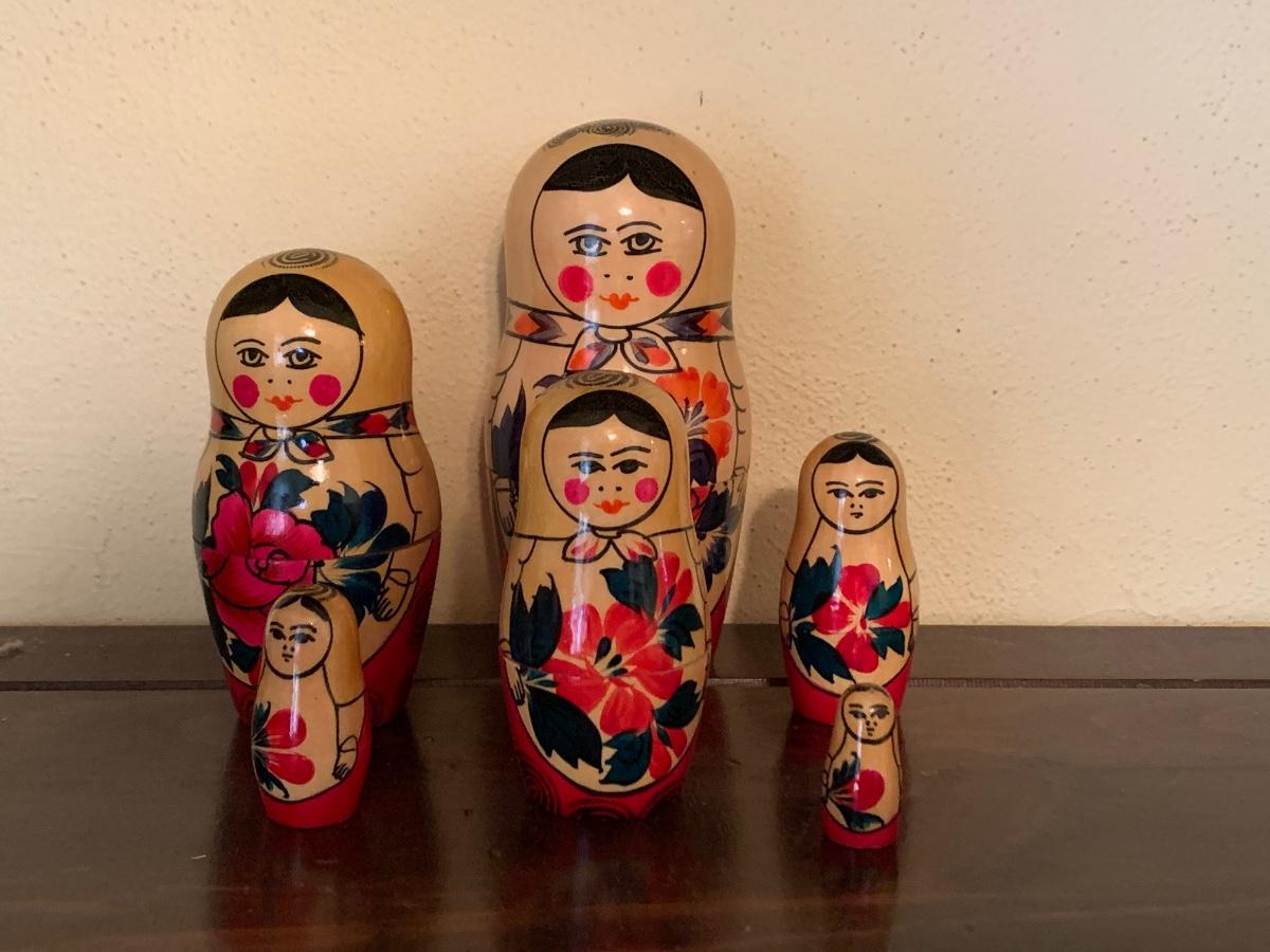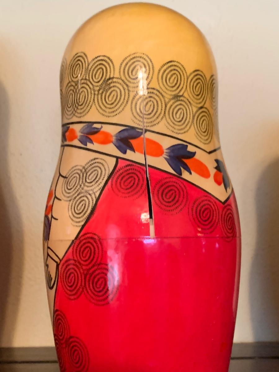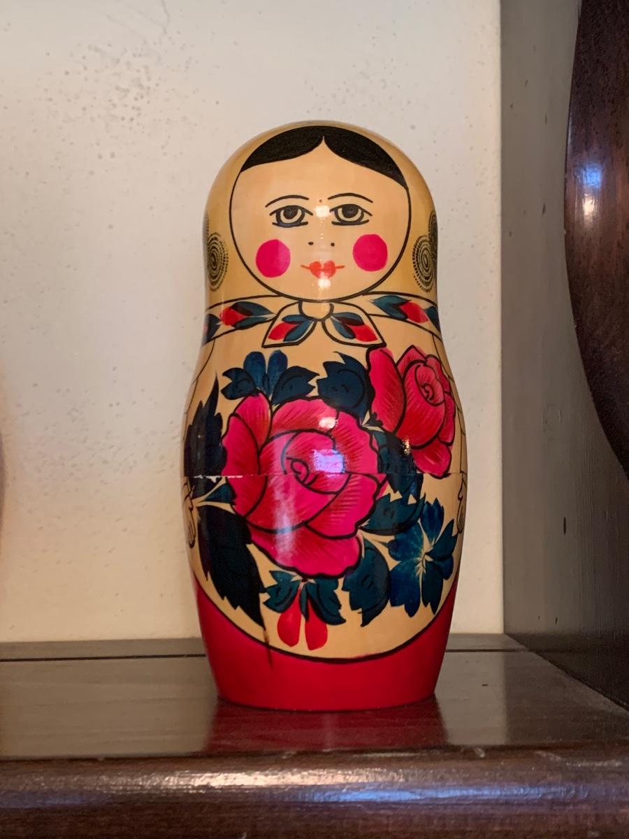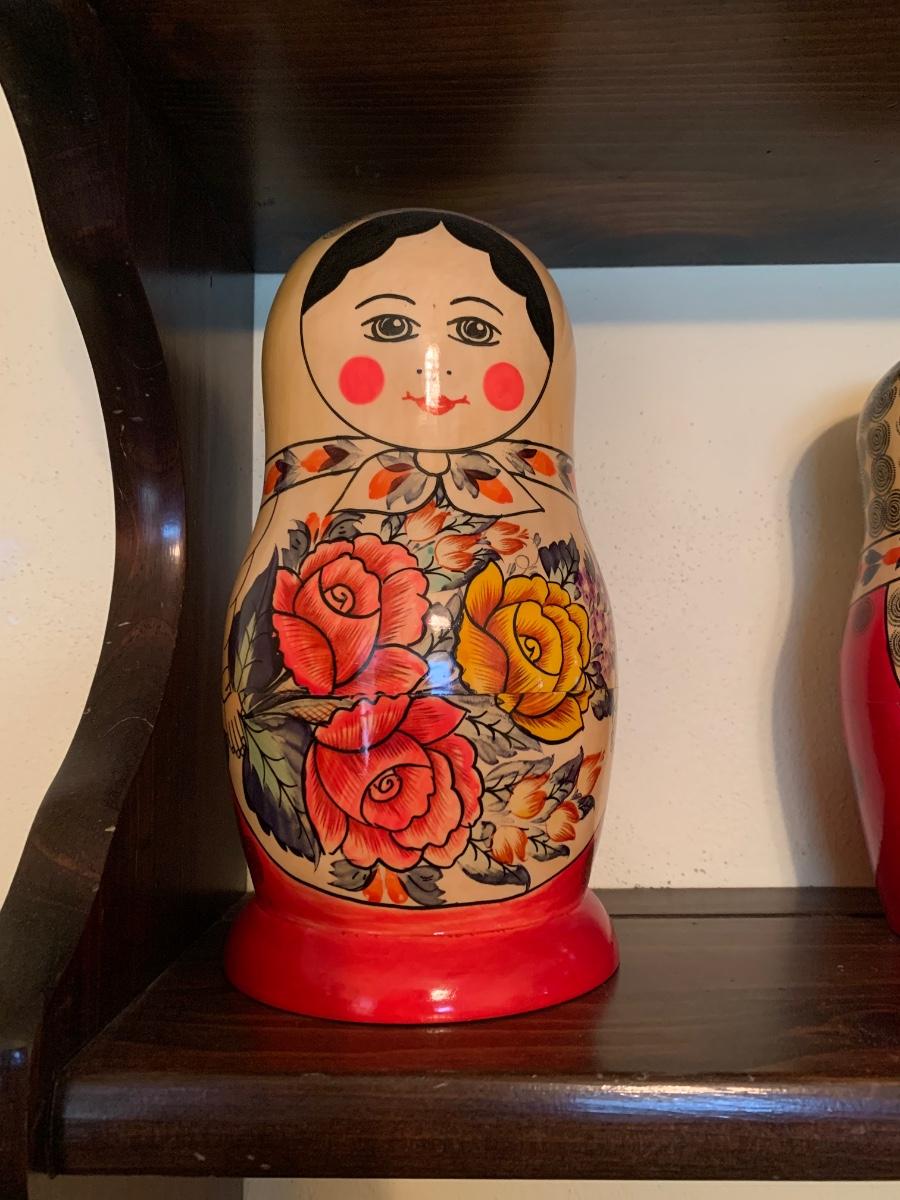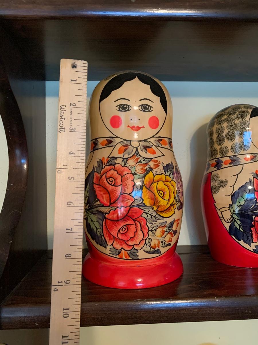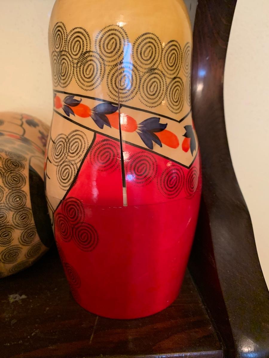 Wooden wall shelf with a set of nesting dolls. Unfortunately there is a crack in one of the dolls.