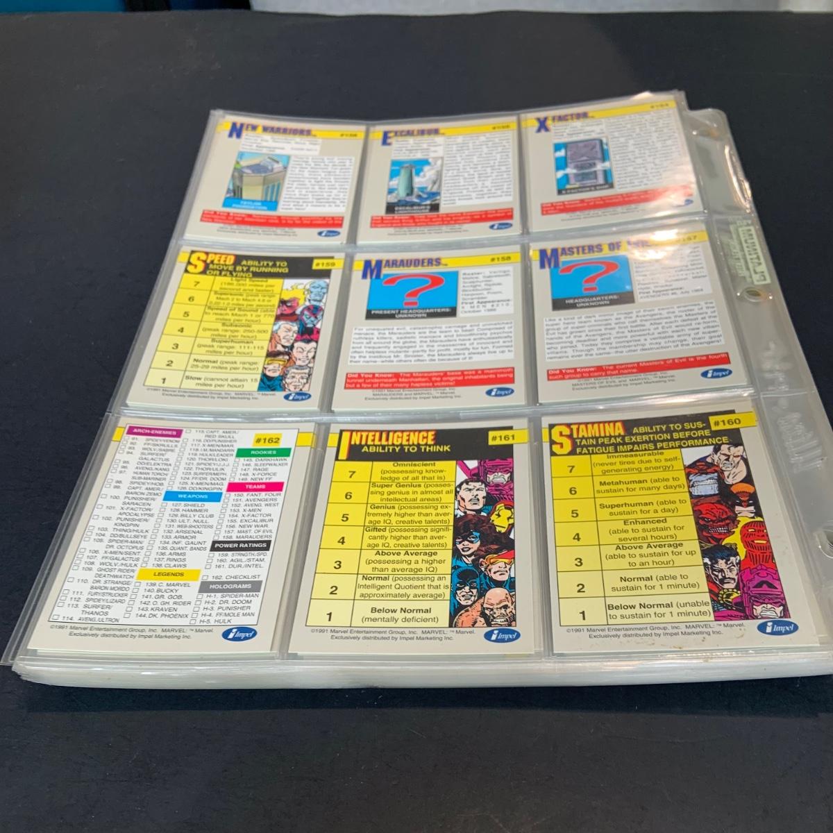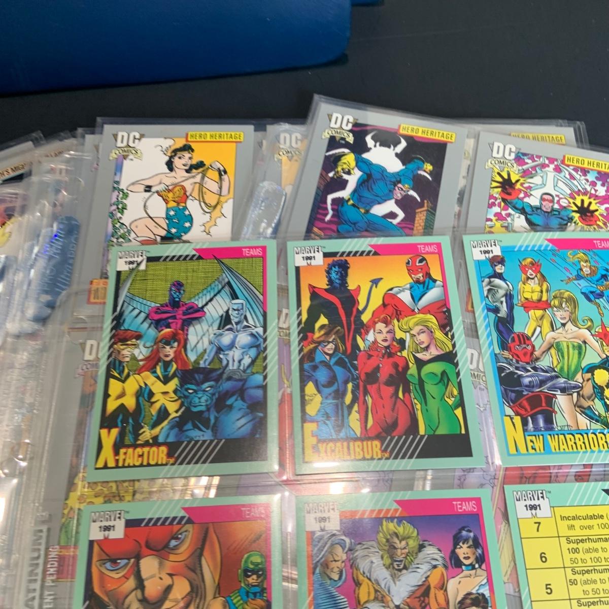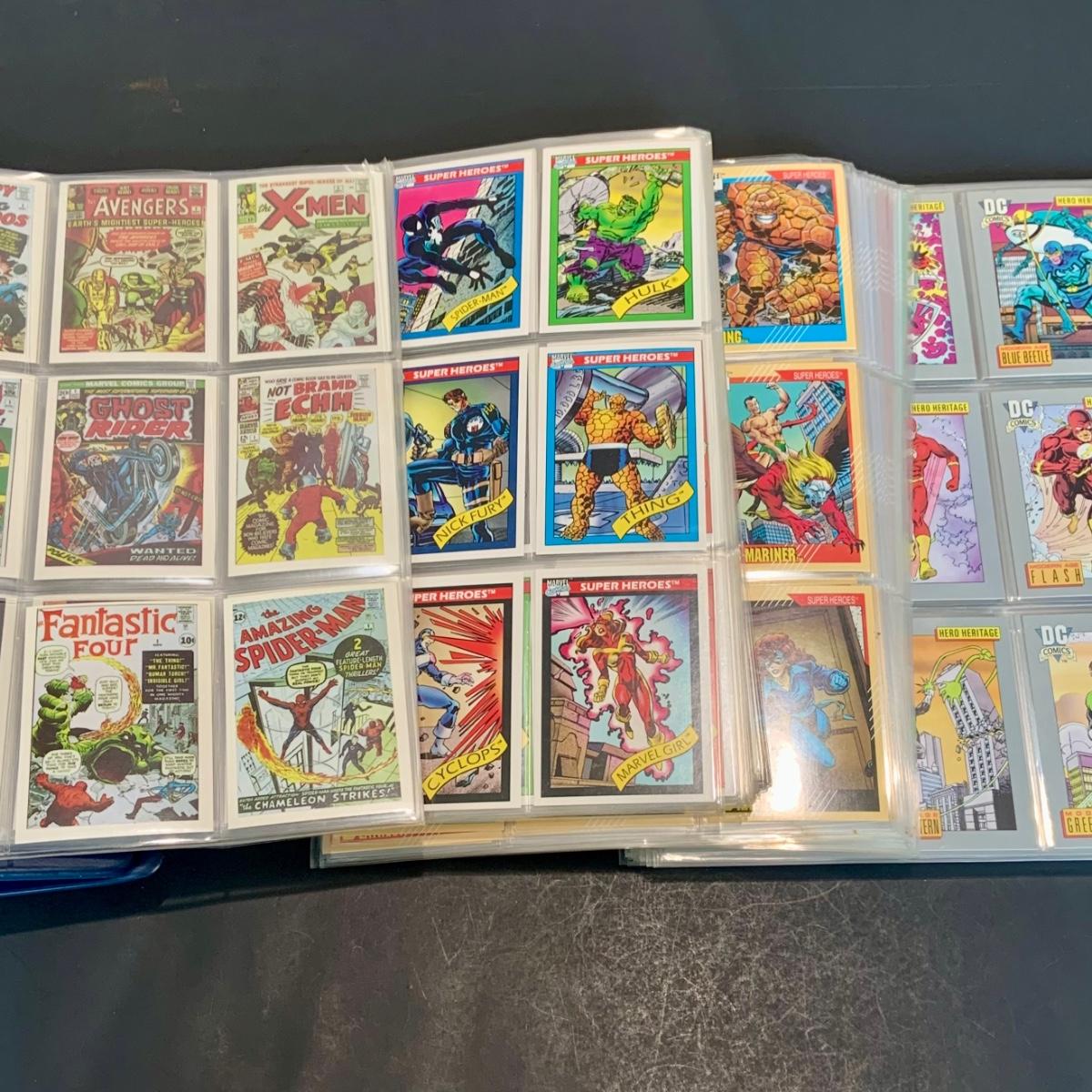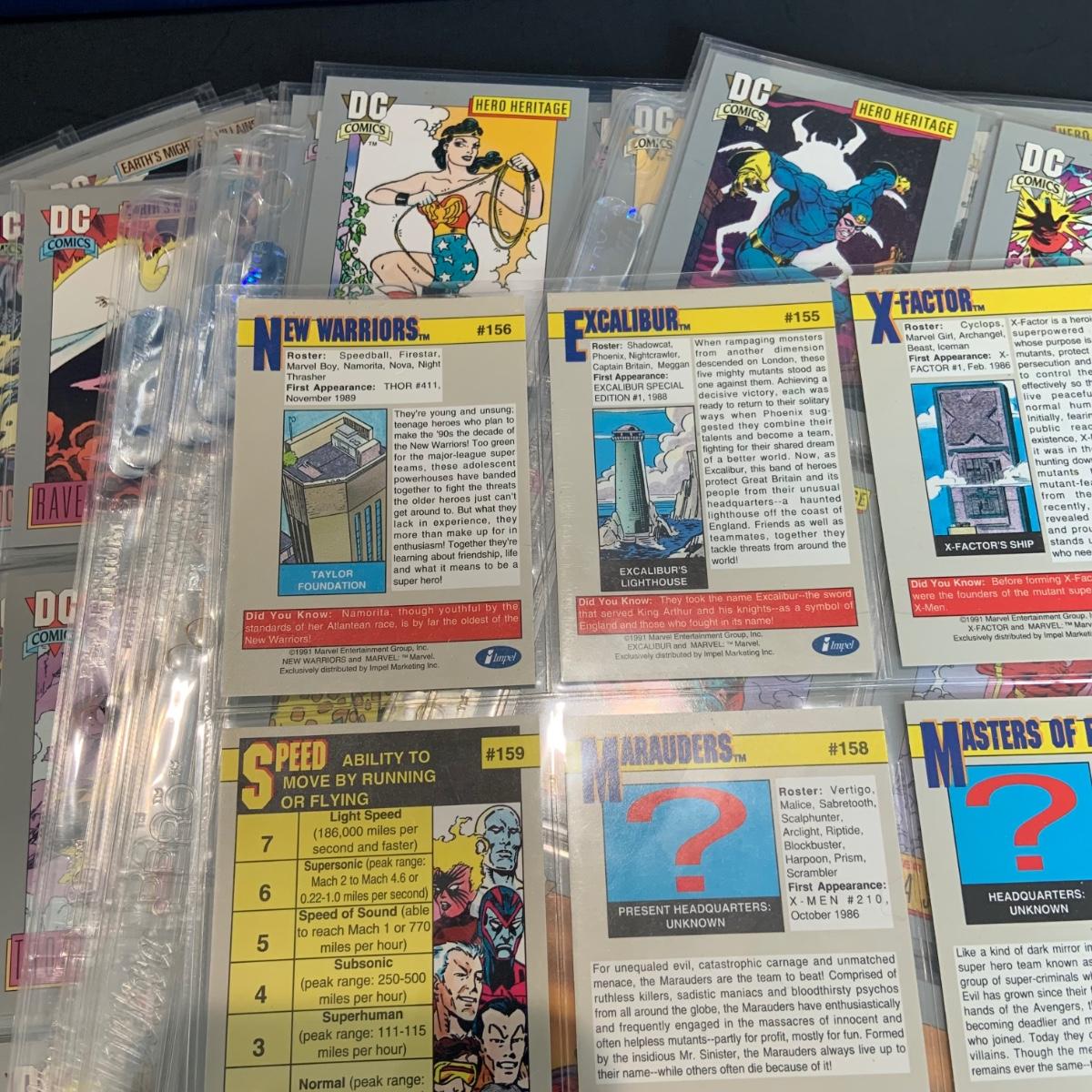 LOT 179: Binder full of 3 complete card SETS: 1990 Marvel; 1991 Marvel; 1991 Impel DC Hero Heritage