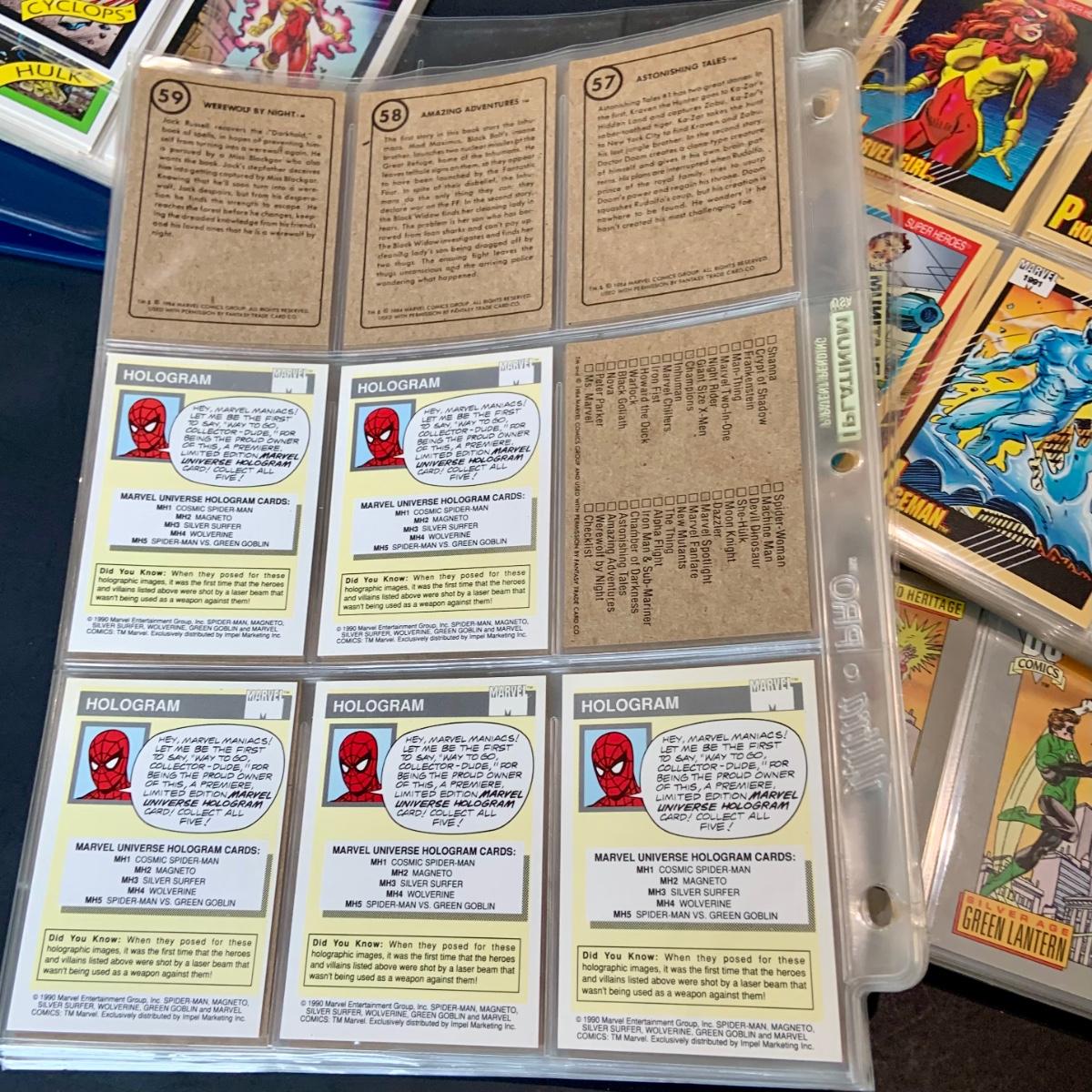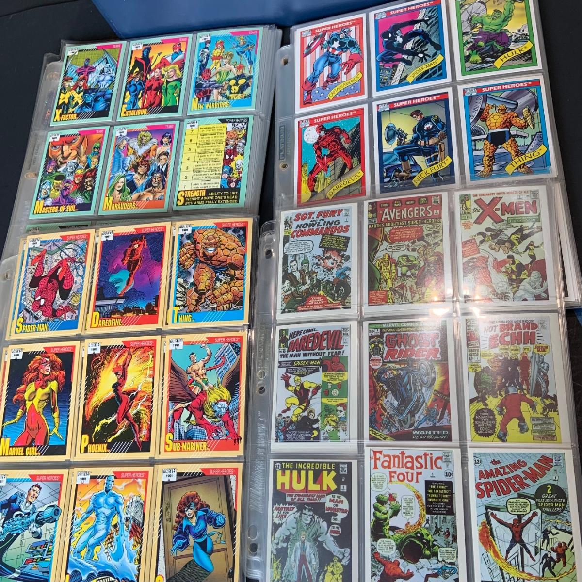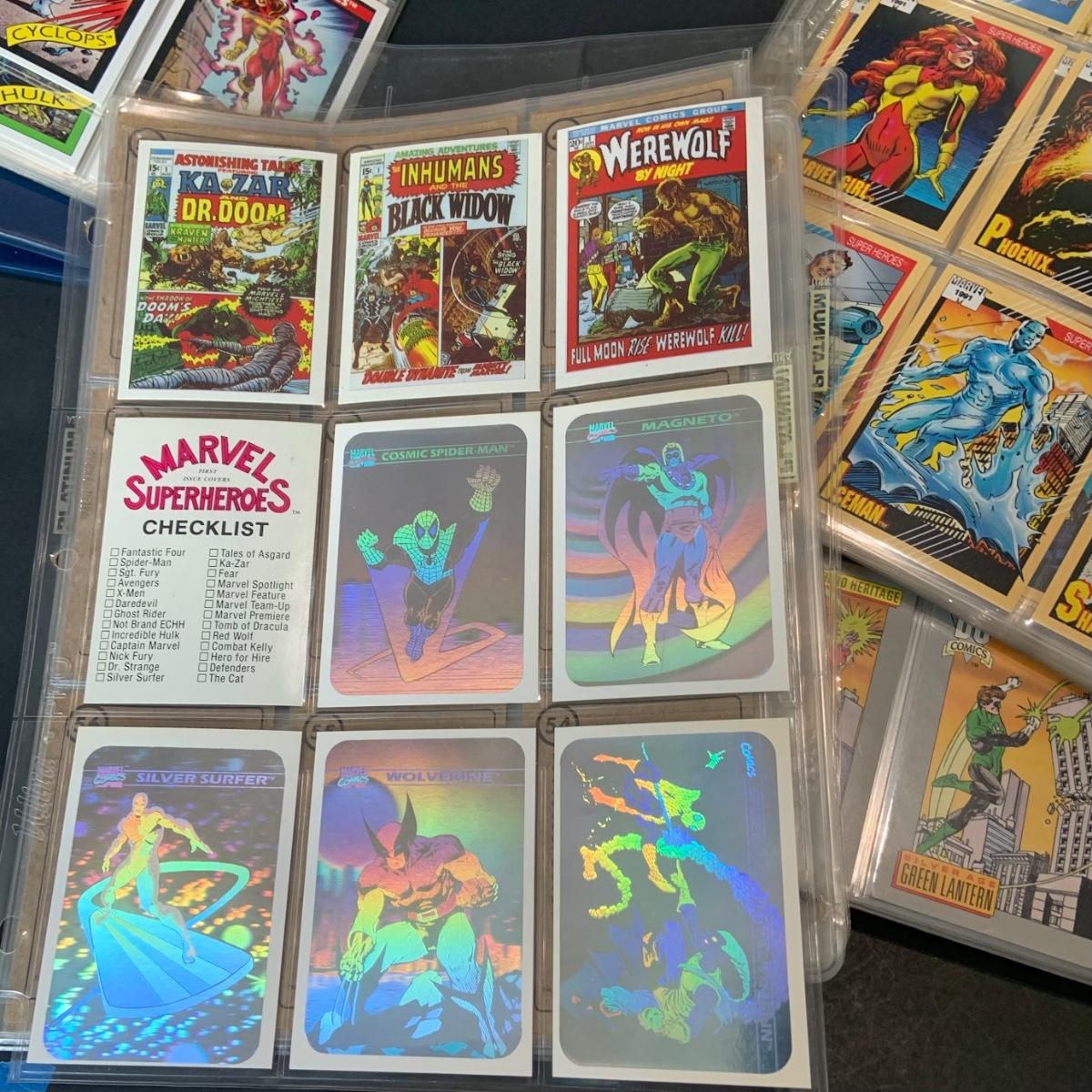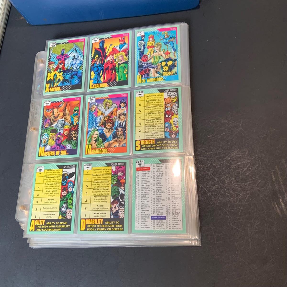 LOT 179: Binder full of 3 complete card SETS: 1990 Marvel; 1991 Marvel; 1991 Impel DC Hero Heritage