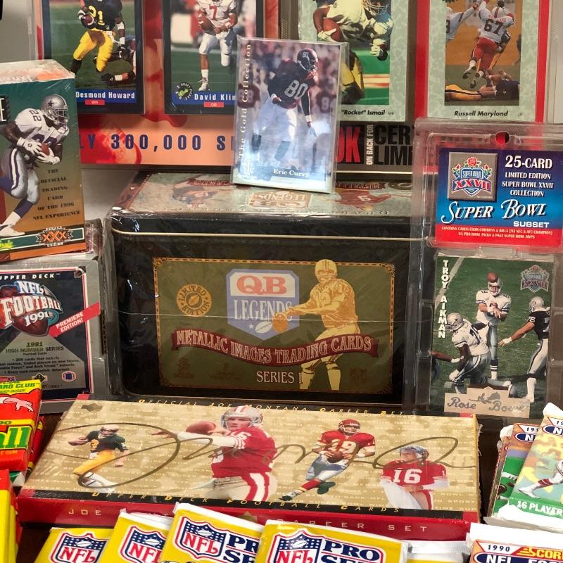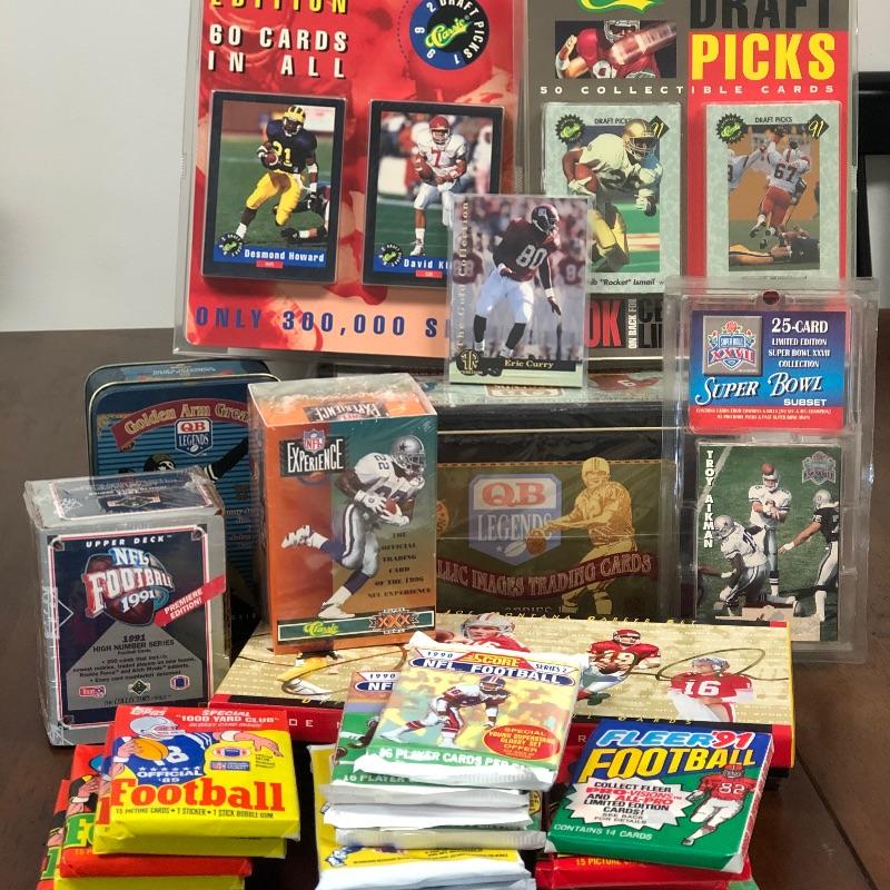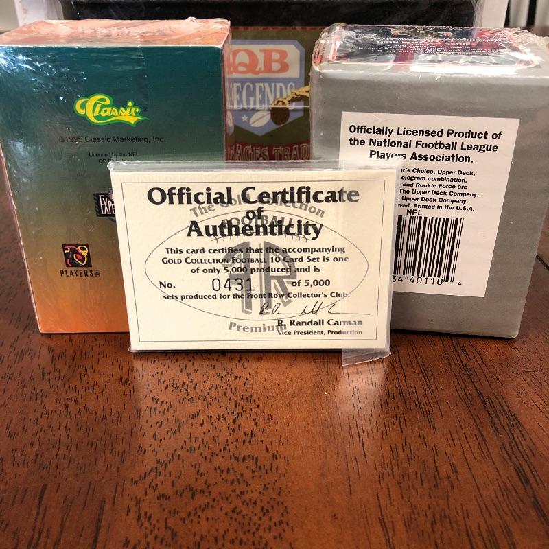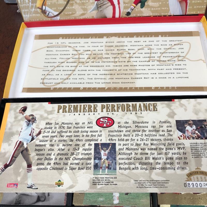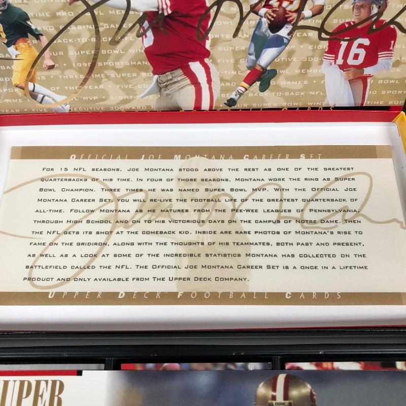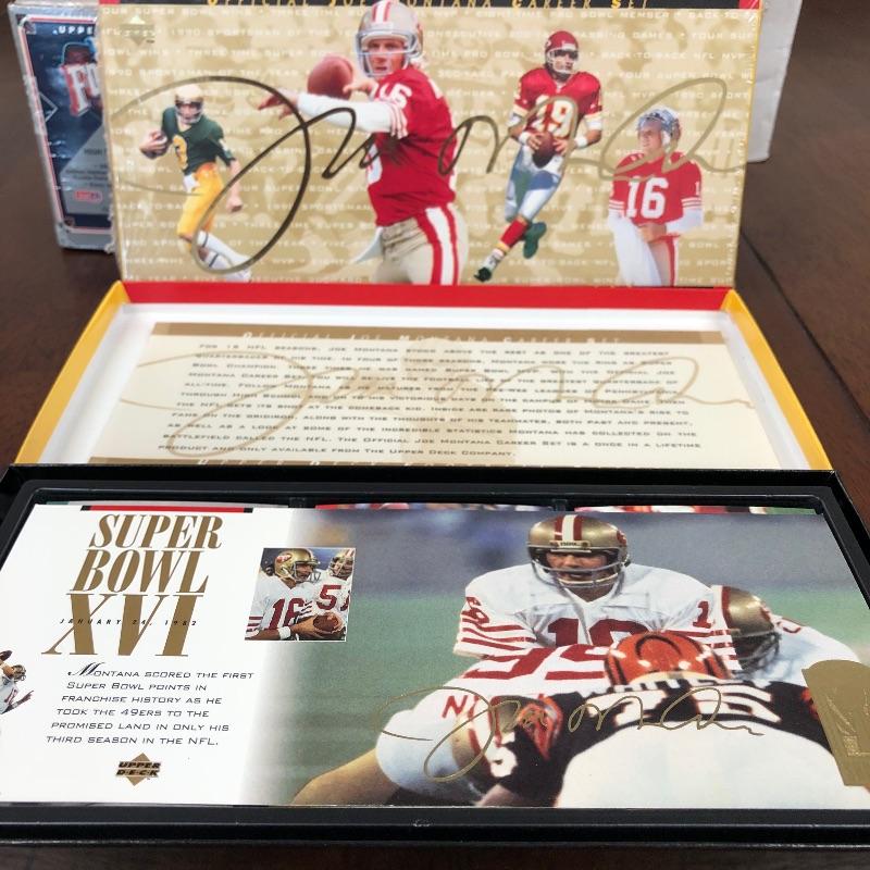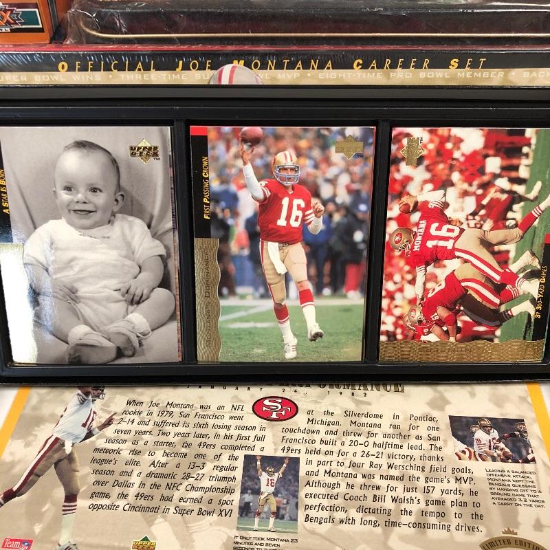 The majority of this lot has not been opened and there is an unopened Joe Montana collector set as well as one that is open see photos.