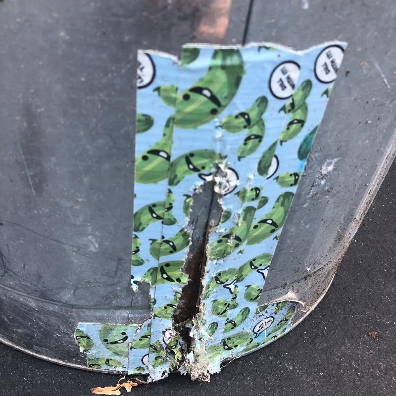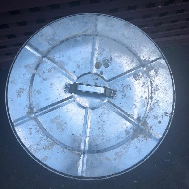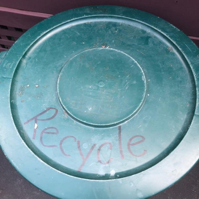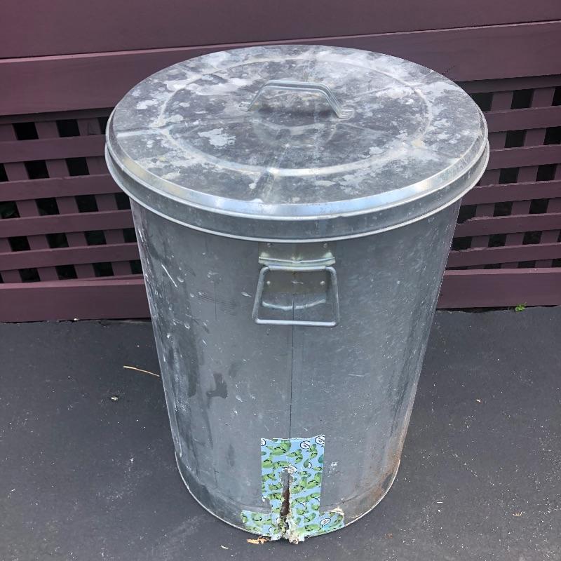 Lot includes 6 lidded garbage bins. Metal bin has some rusting (pictured).
