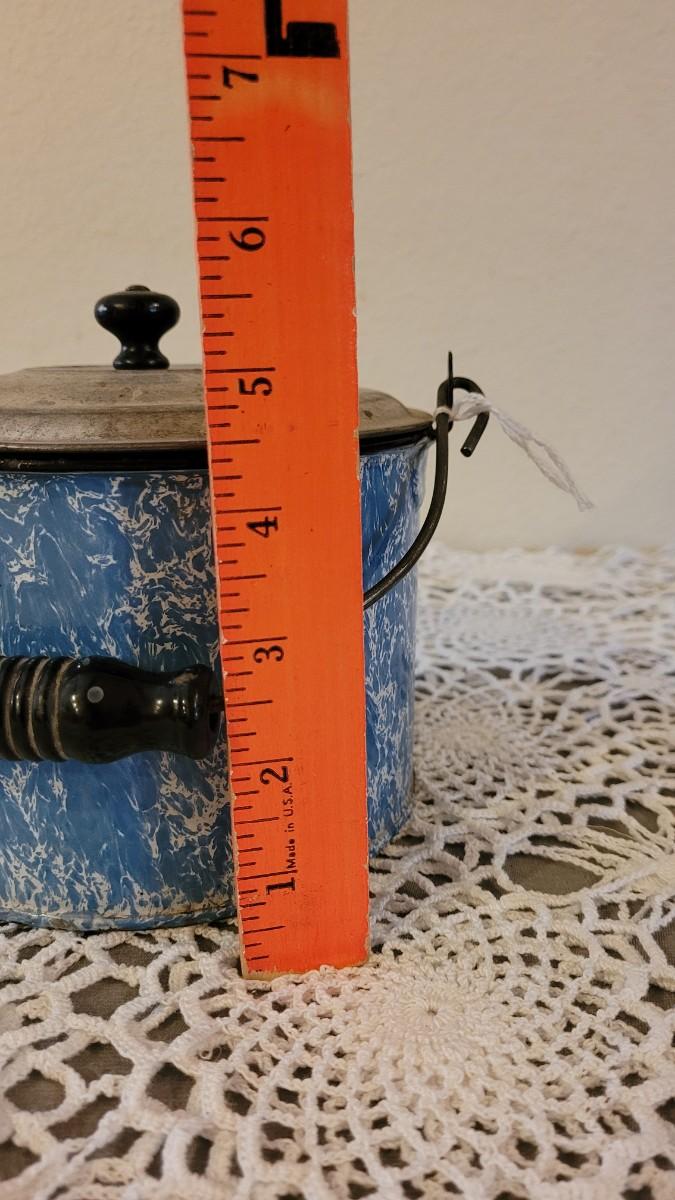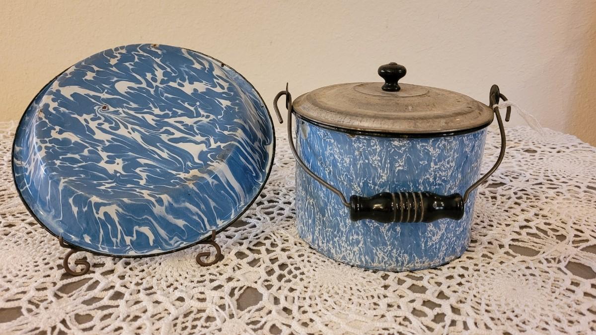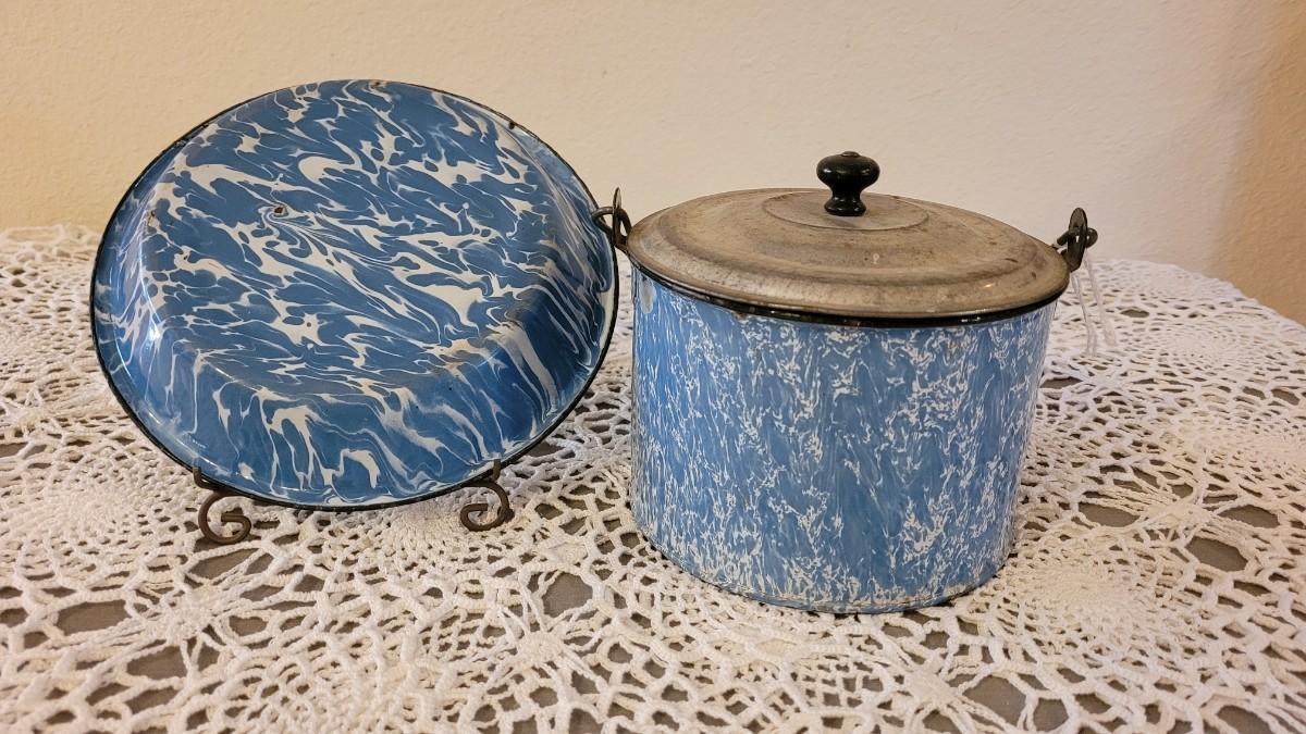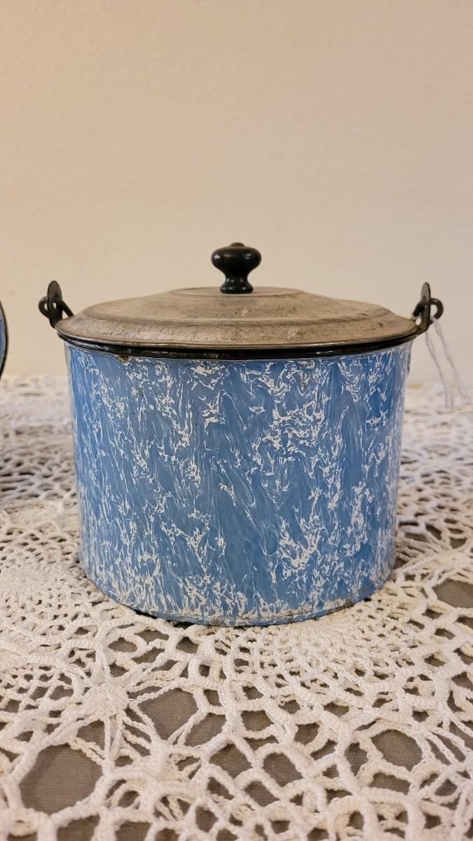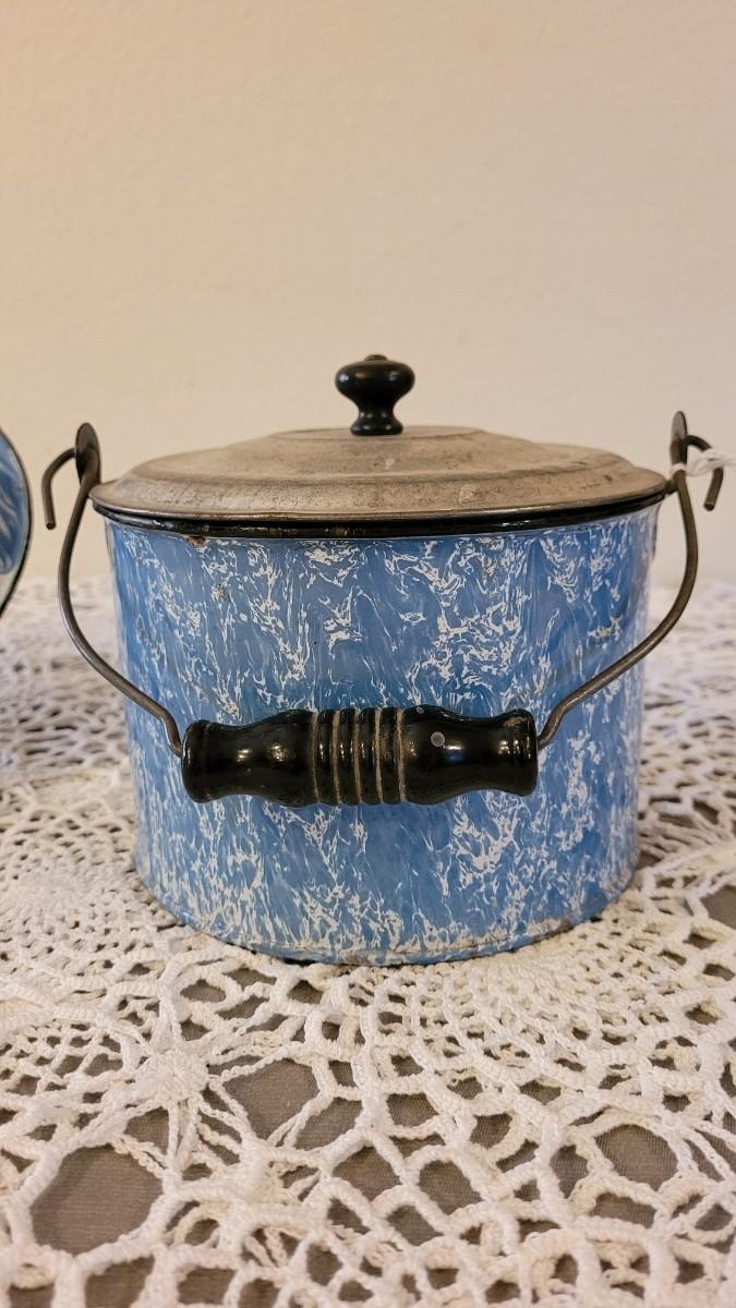 Lot 179: Antique Robbins Egg Blue & White Splatter Enamelware Pie Plate with Stand and Covered Pot with Wood Handle