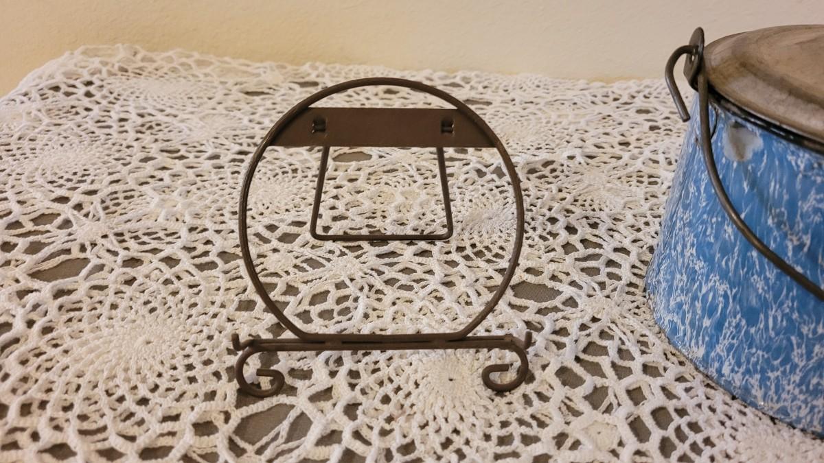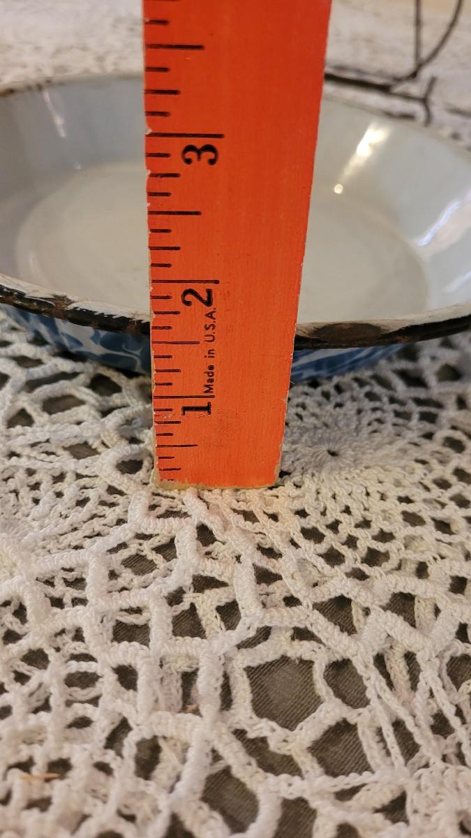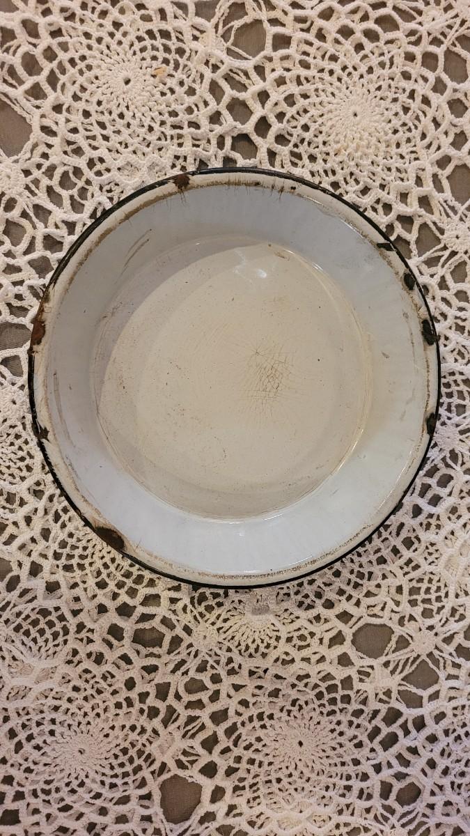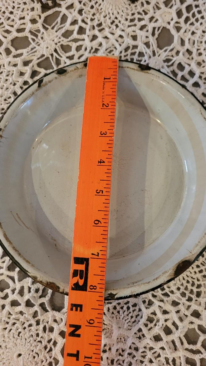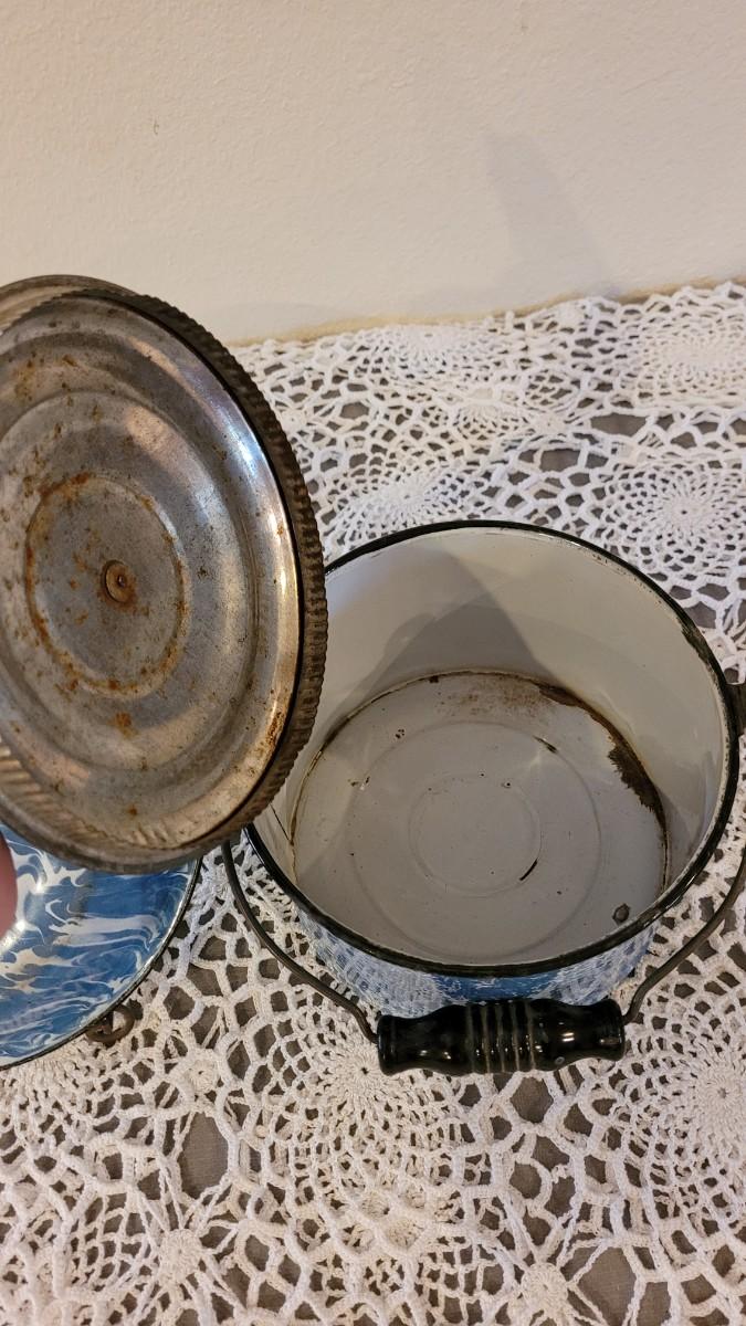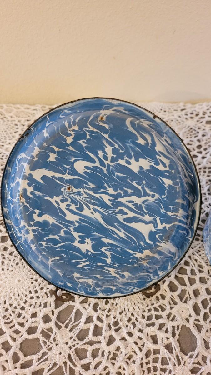 Lot 179: Antique Robbins Egg Blue & White Splatter Enamelware Pie Plate with Stand and Covered Pot with Wood Handle