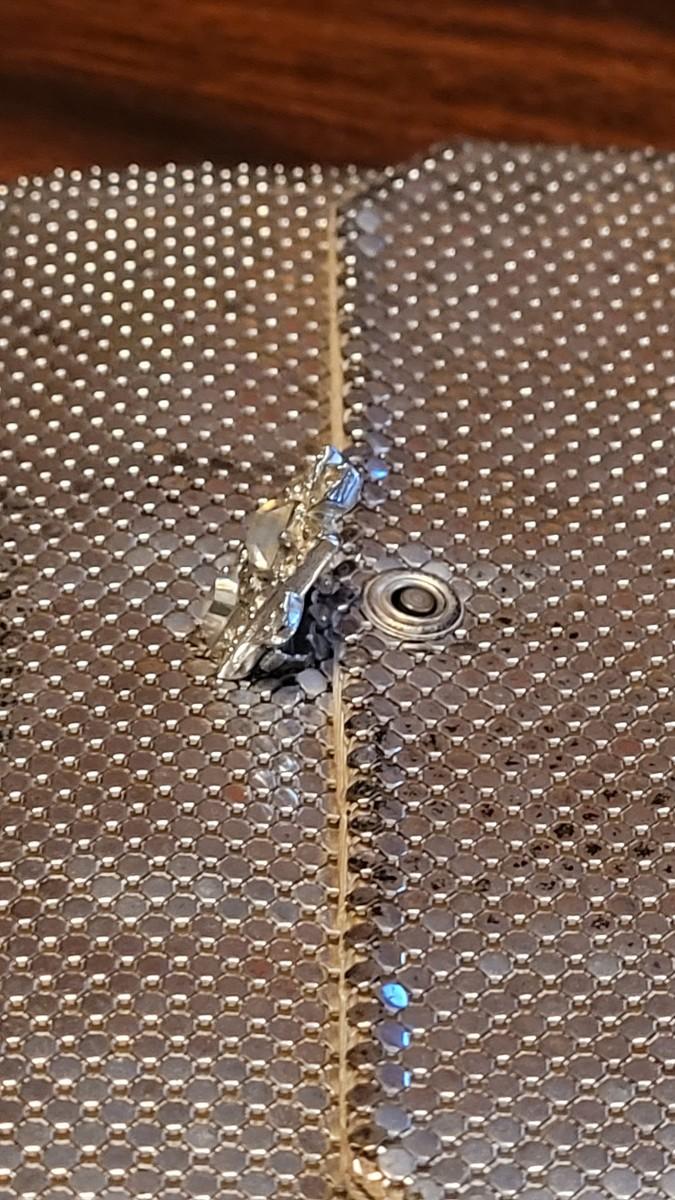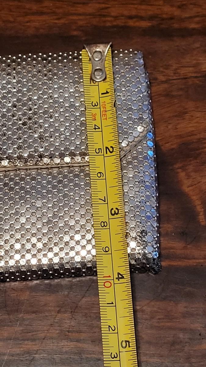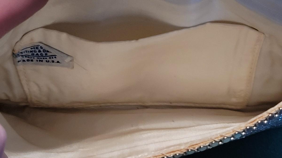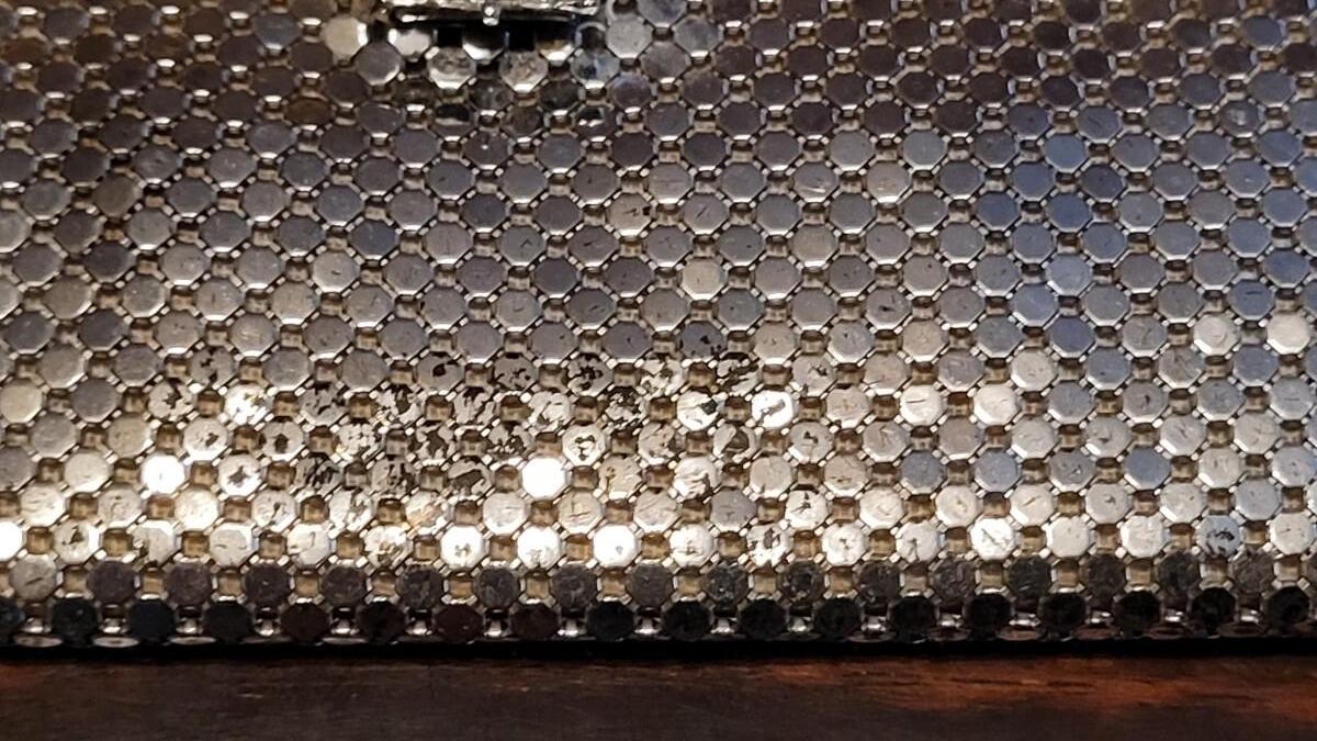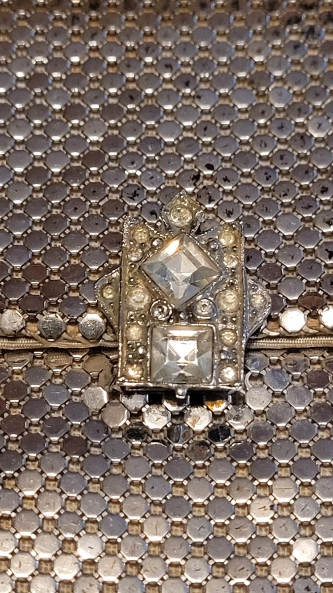 The mesh is discolored slightly below the clasp. The bag features the Whiting and Davis flip up clasp.