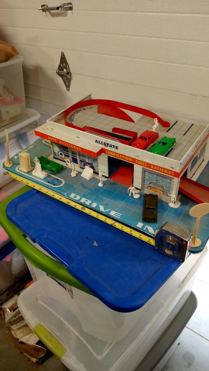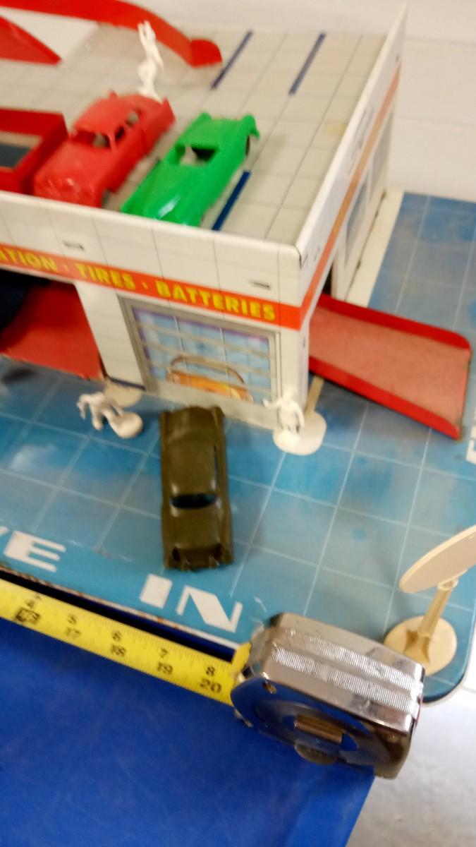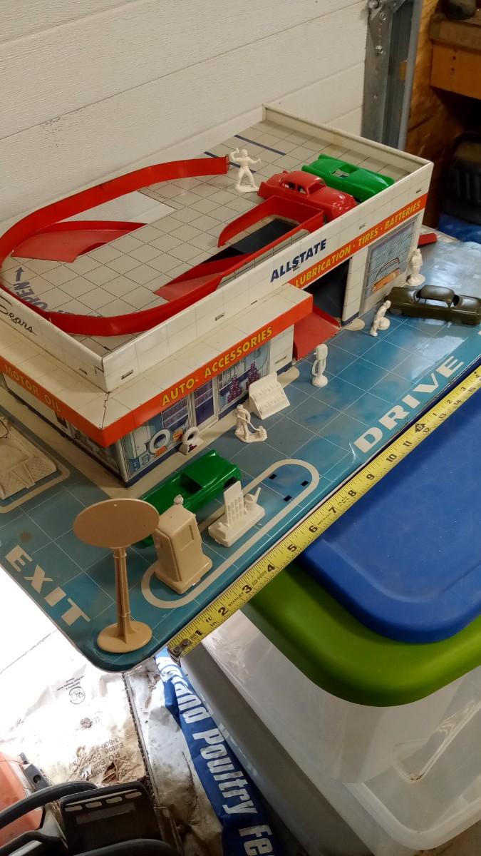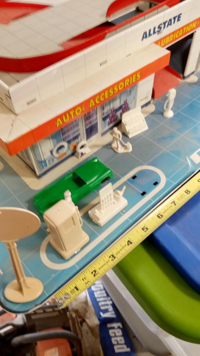 TIN LITHO IN GREAT SHAPE NO RUST A SLIGHT BEND ON BASE MISSING A GAS PUMP