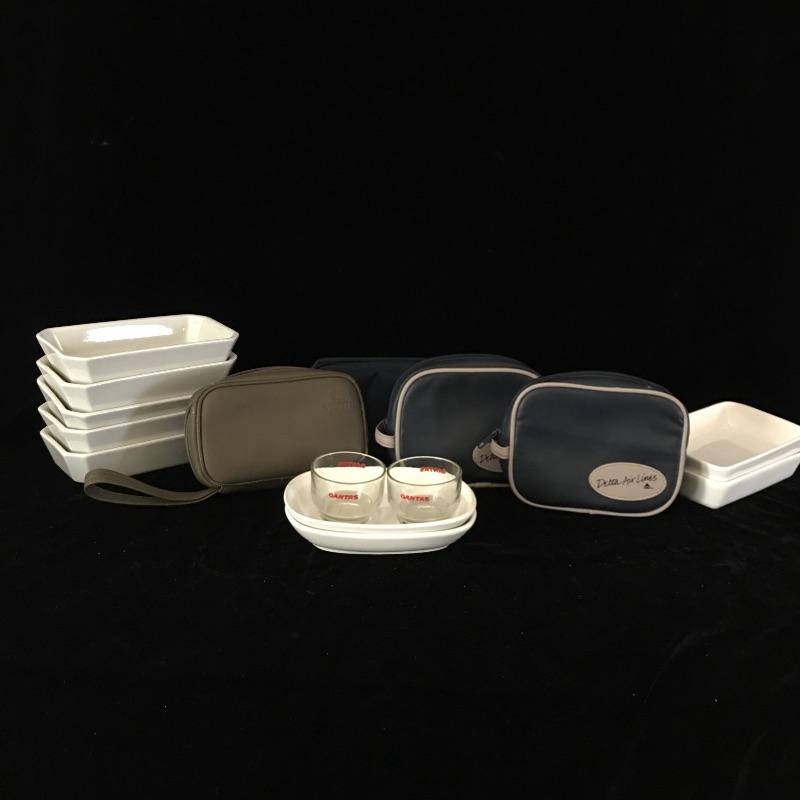 Lot includes five United dishes, two Alaskan airlines dishes, two Eastern airline dishes, two small Quantas glasses, and four bags with some toiletries inside. You don’t get swag like this when you fly now.