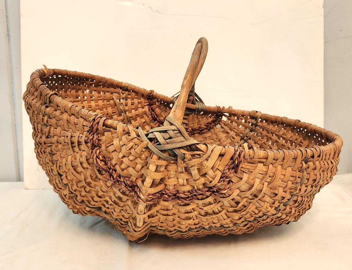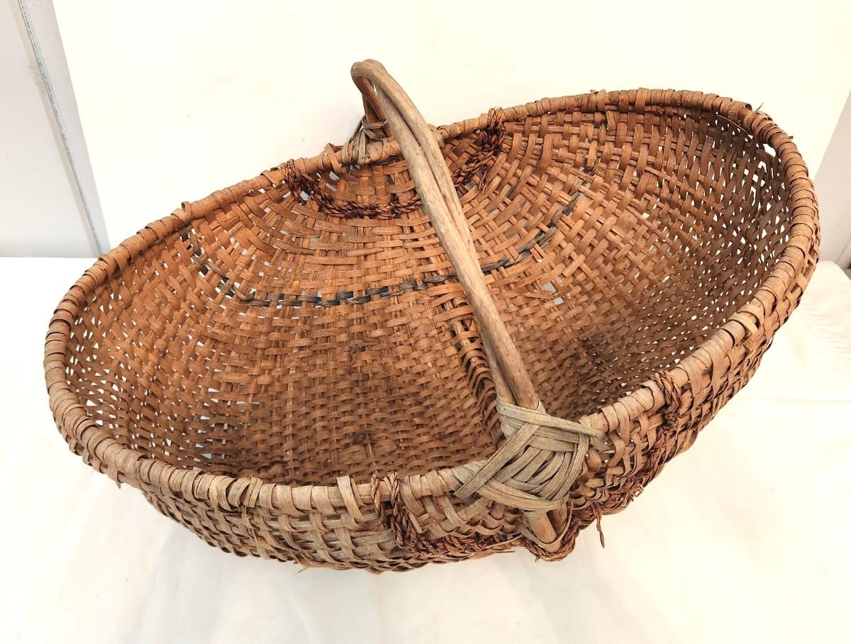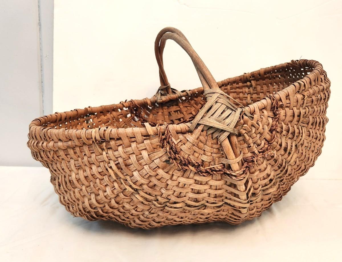 Wonderful antique "Buttocks" style basket - woven, 19th century willow most likely. Made for gathering eggs or vegetables. 21" long, 15" across. Good antique condiiton. I just love this thing.