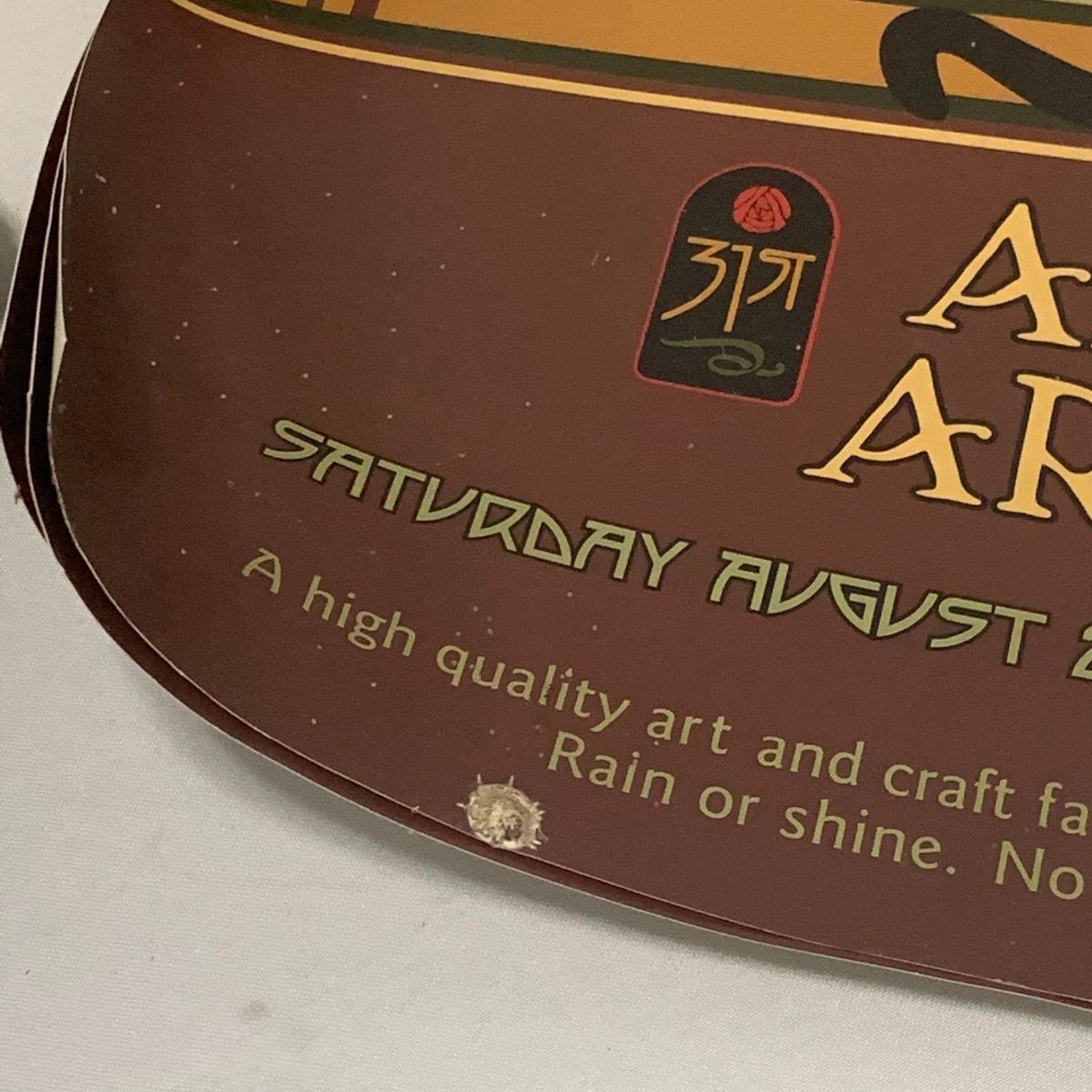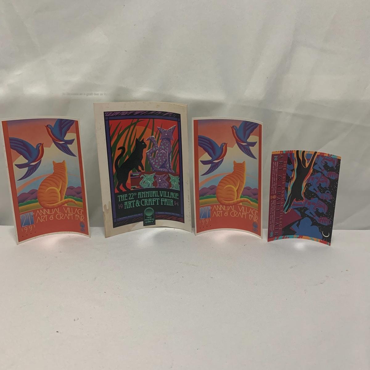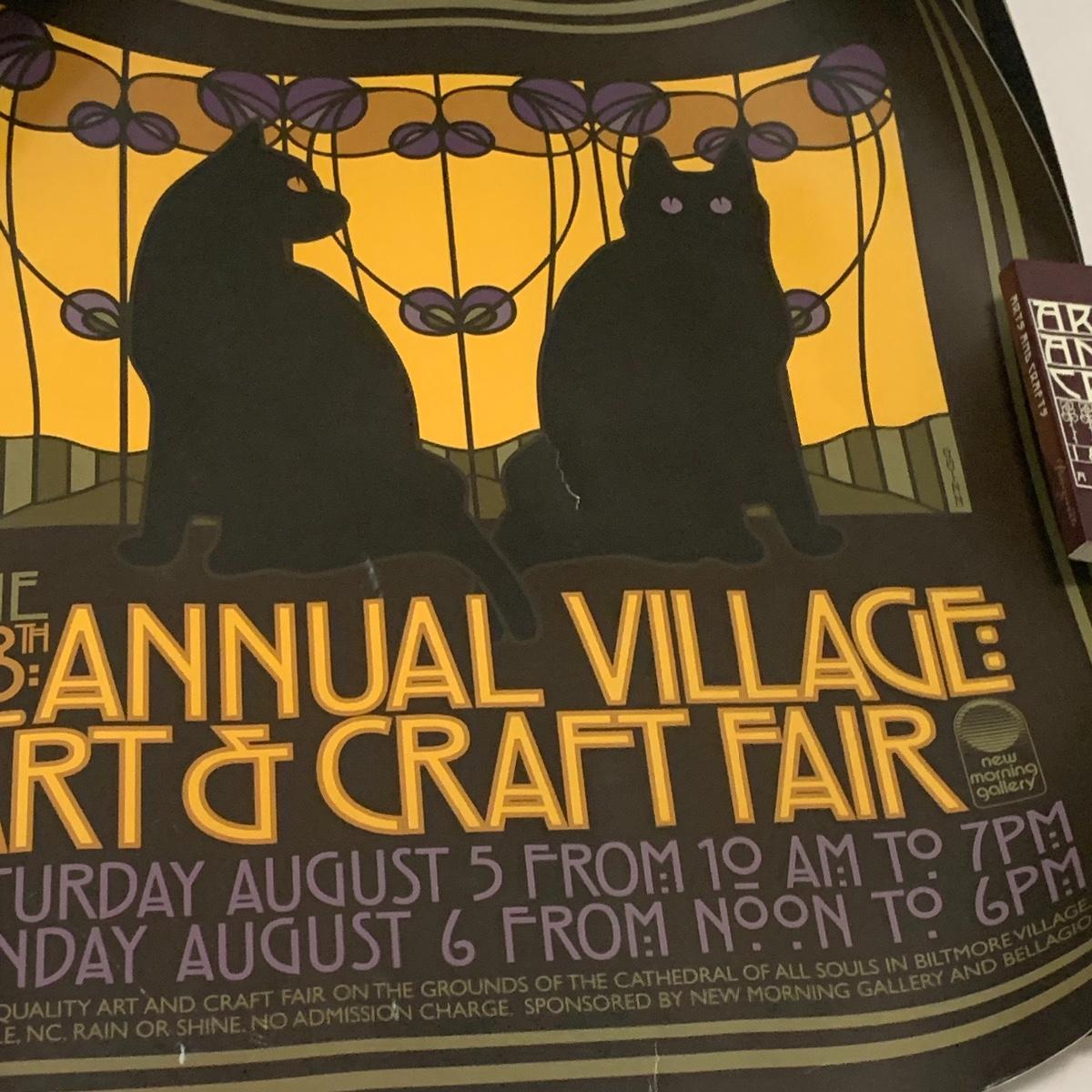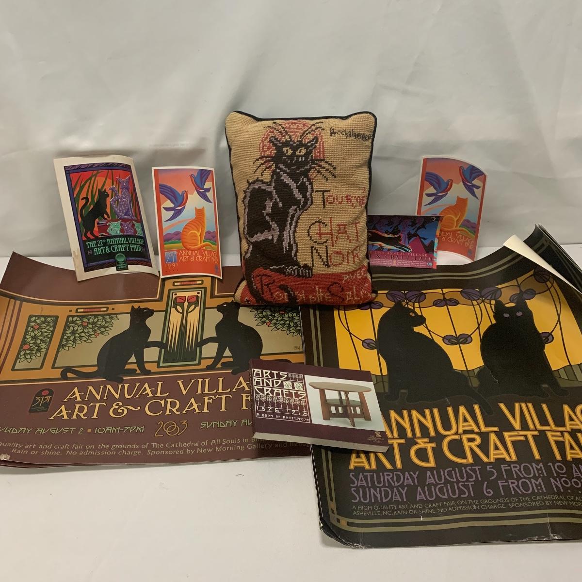 In this lot you’ll find posters from Asheville’s Annual Village Craft Show from the 1990’s. There are three of one poster (the 31st annual fair) and four of the other (the 28th annual fair). They both have artistic designs of cats with stained glass. The 28th annual posters measure about 19” x 19”. The 31st annual posters measure about 24” x 15”. They all have been rolled up together so will take a little effort to straighten out, but once they are they will be lovely in frames! There are also some artistic postcards from Asheville’s Annual Village Craft show, as well as a book of postcards showing arts and crafts from 1875 - 1915, as well as a pillow depicting the Chat Noir Black Cat design by Steinlen. The pillow measures about 9” x 13”. Shipping available.