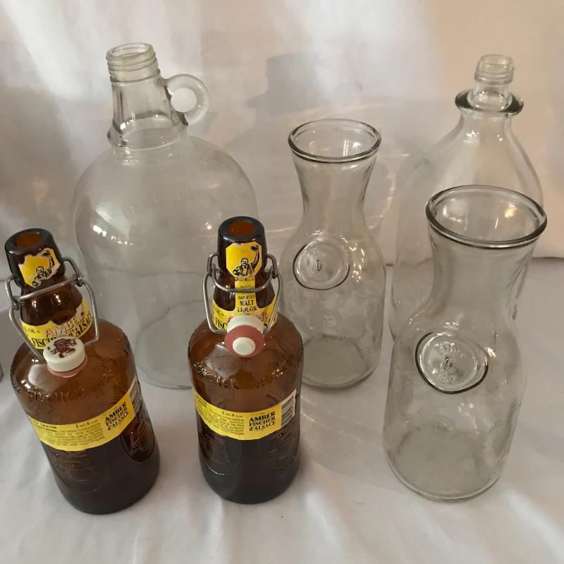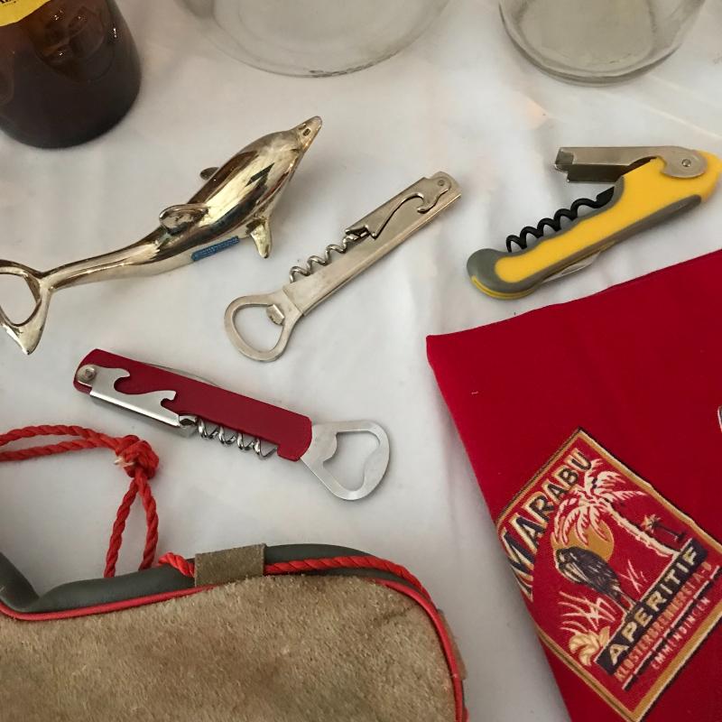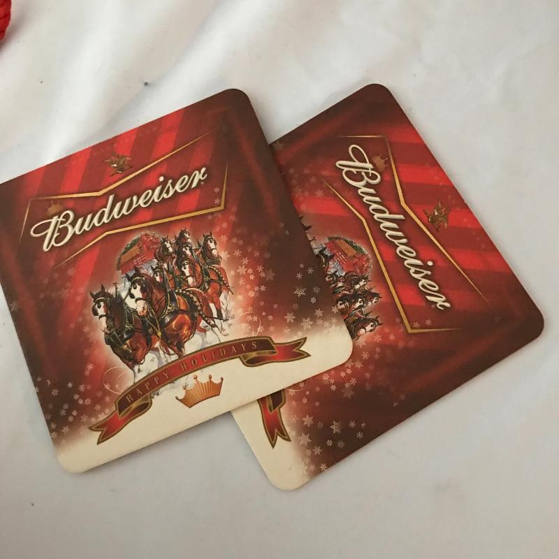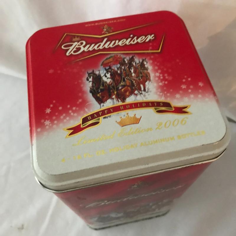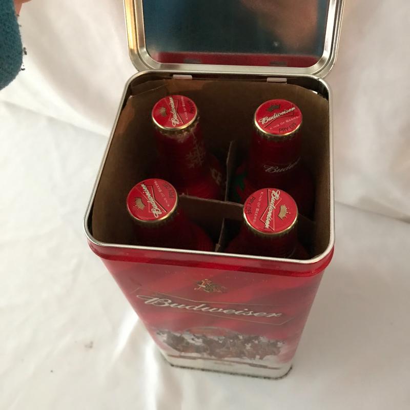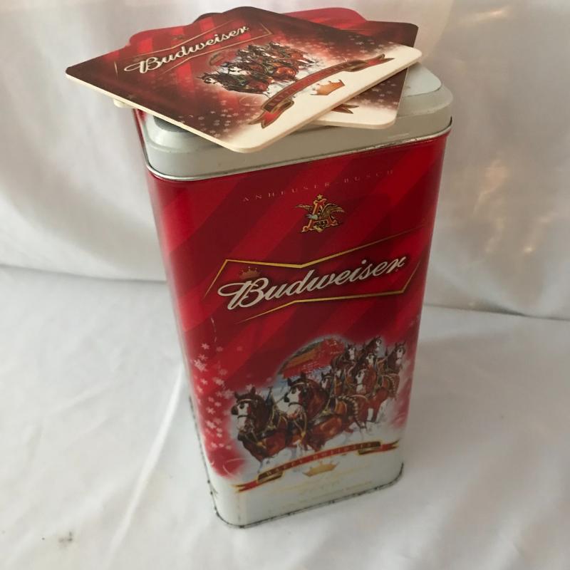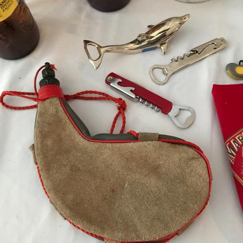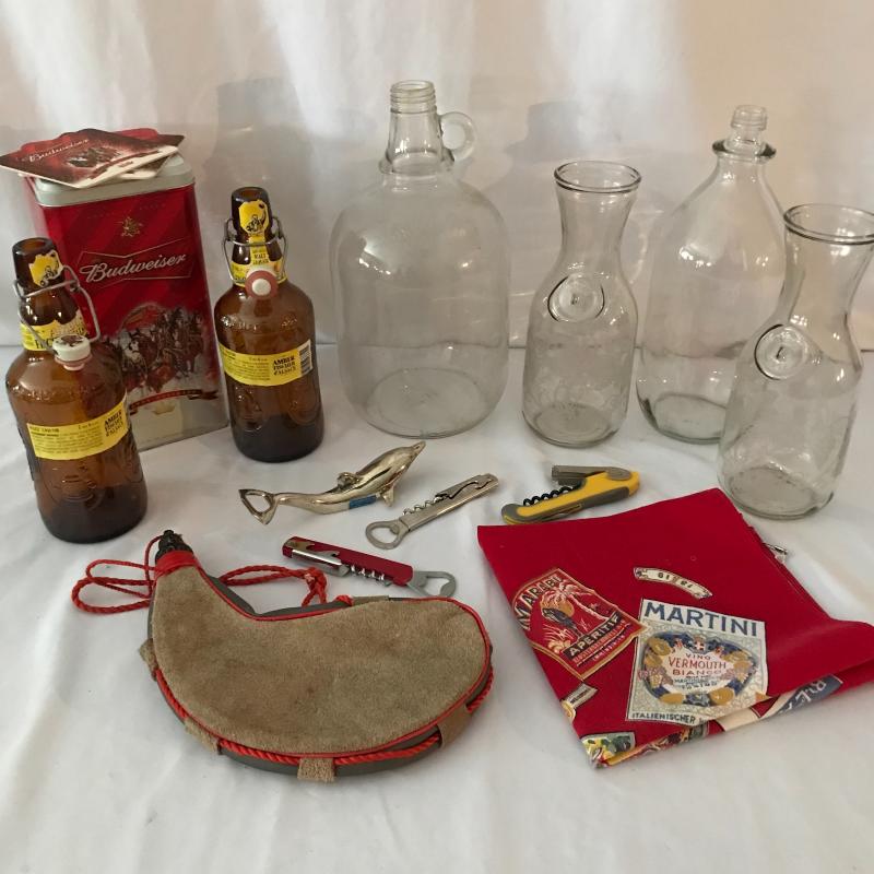 Lot includes a variety of bar items including vintage hand towel, four bottle openers, canteen, collectible bottles, and collectible Budweiser tin with bottles and coasters. No shipping available. Local pickup only in Maggie Valley, NC.