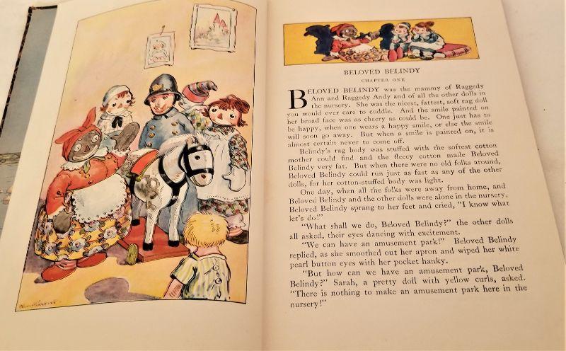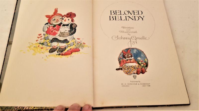This is a sweet book that is almost impossible to find - from the Raggedy Ann and Andy series - Beloved Belindy, 1st edition, 1926 by Johnny Gurelle, published by P.F. Volland Col, minor wear to cover and spine - inside in great condition. Belindy is the kindest and smartest denizen of the Raggedy Ann universe and the caretaker of all the other toys in the nursery. These stories are CHARMING. I sat and read this and loved it - you will, too. Measures 9" x 6".