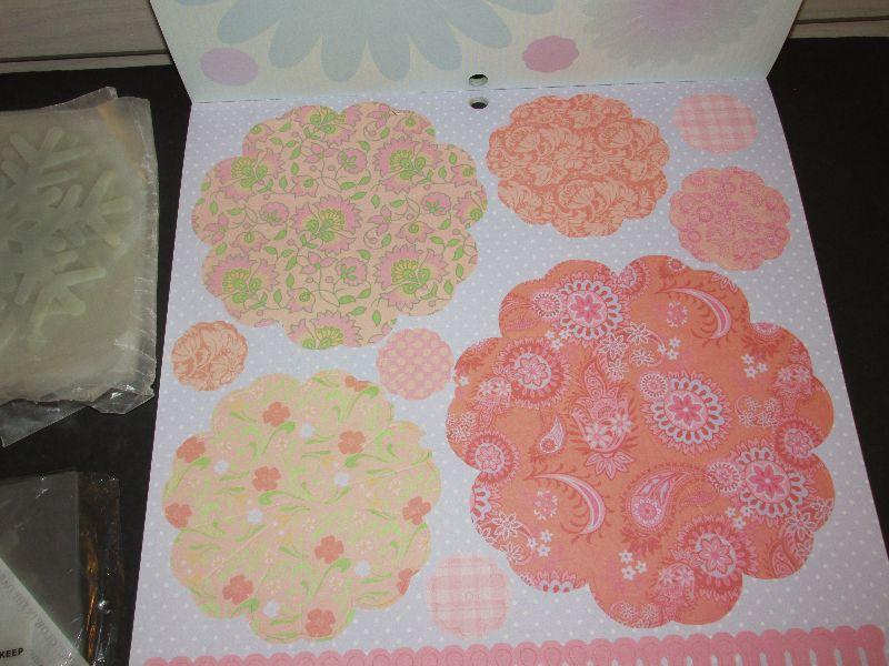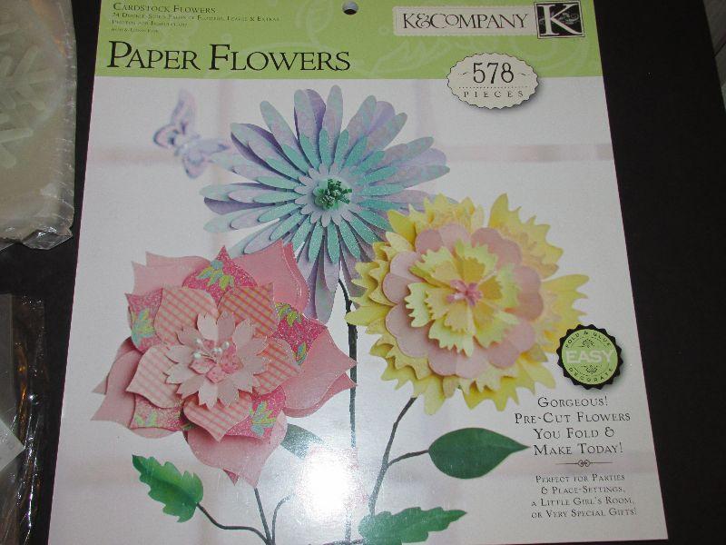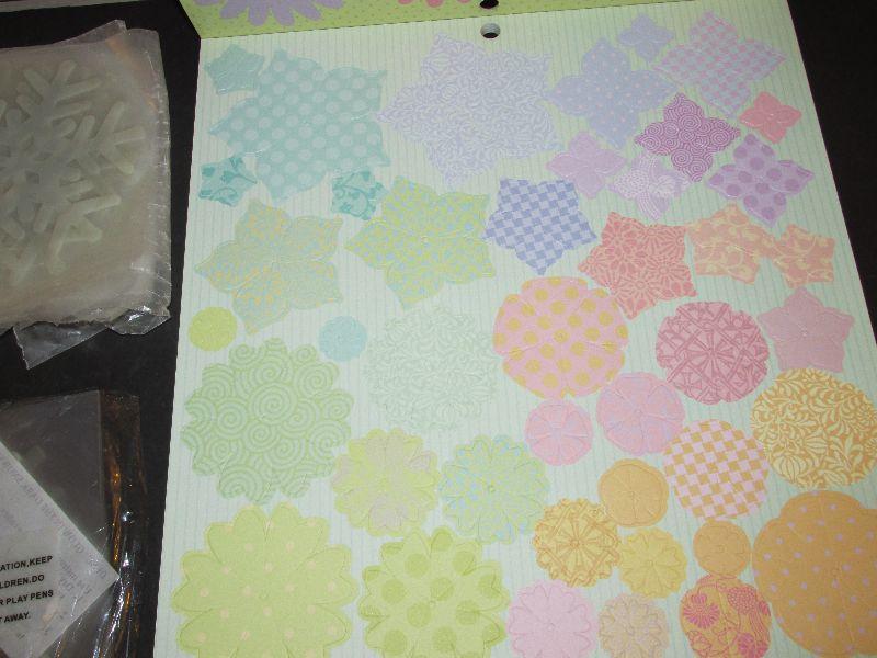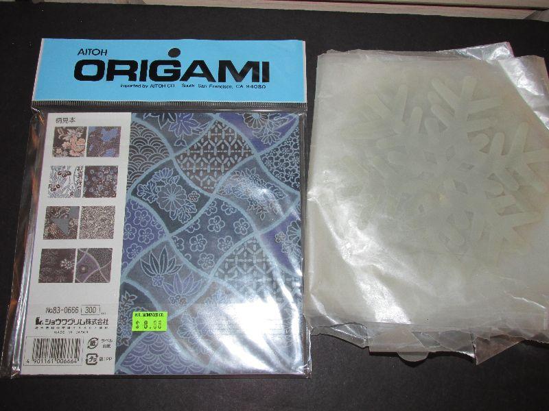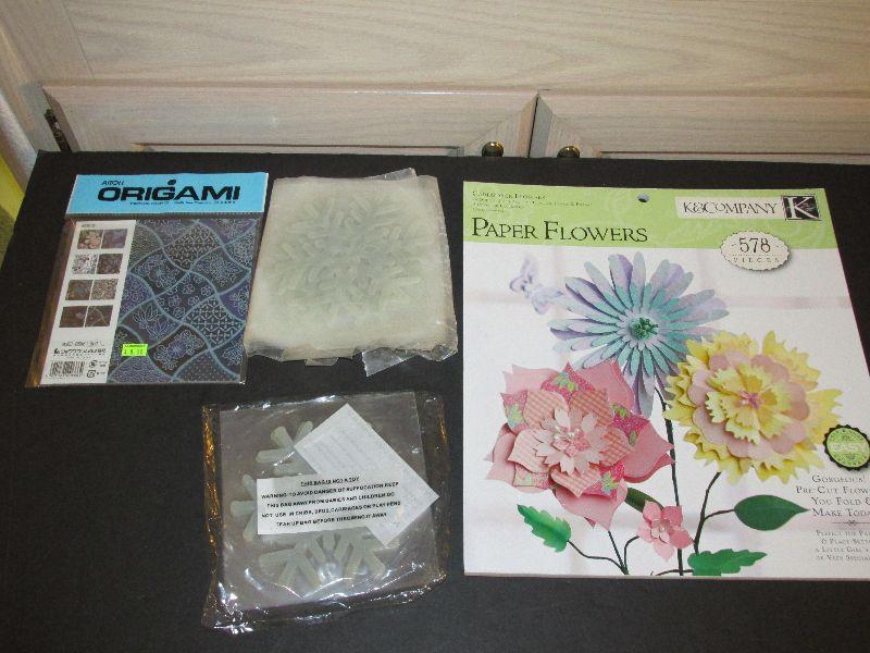 Collection of different items used for crafting. Includes: K & Company paper flowers, glow in the dark snowflakes, and Aitoh Origami patterns.