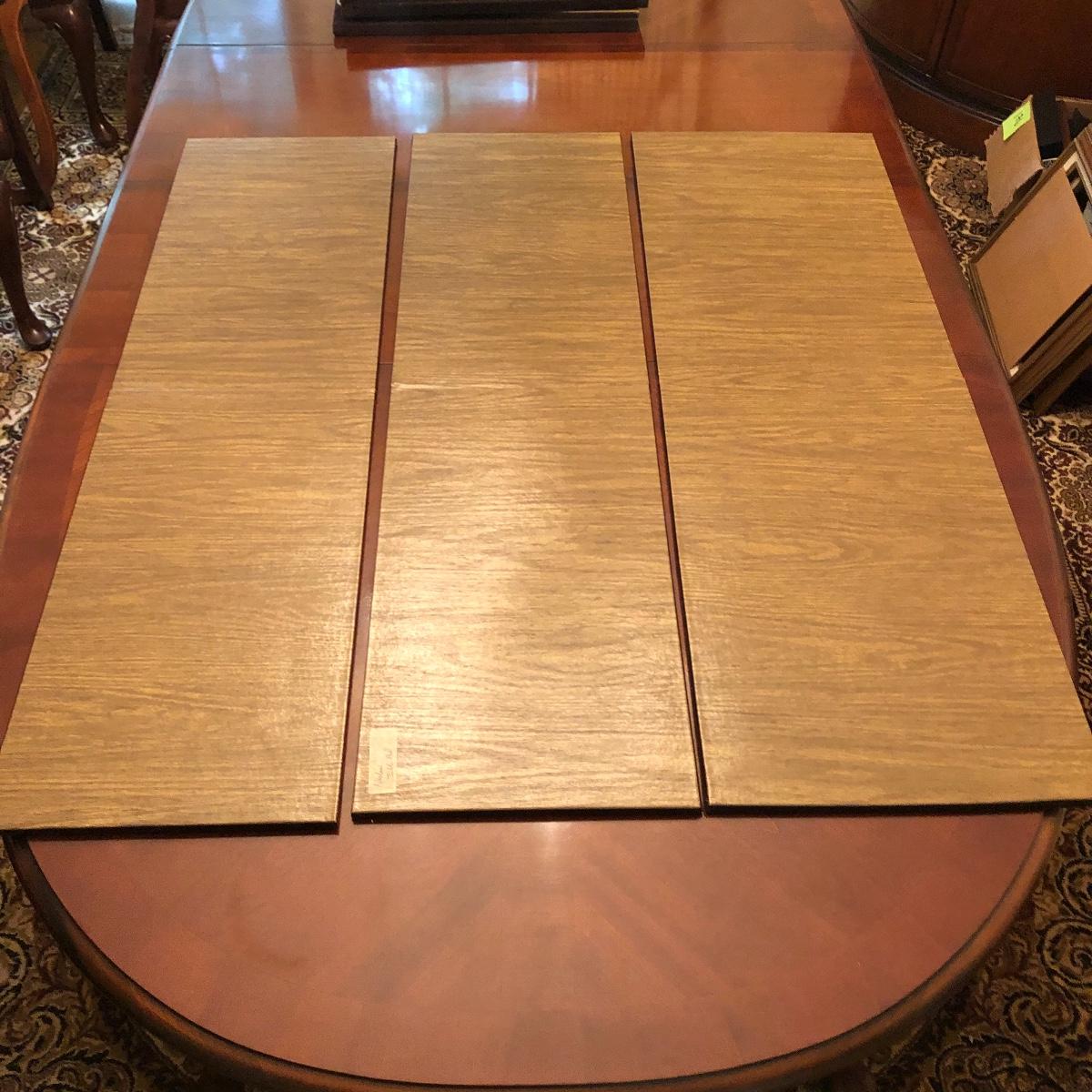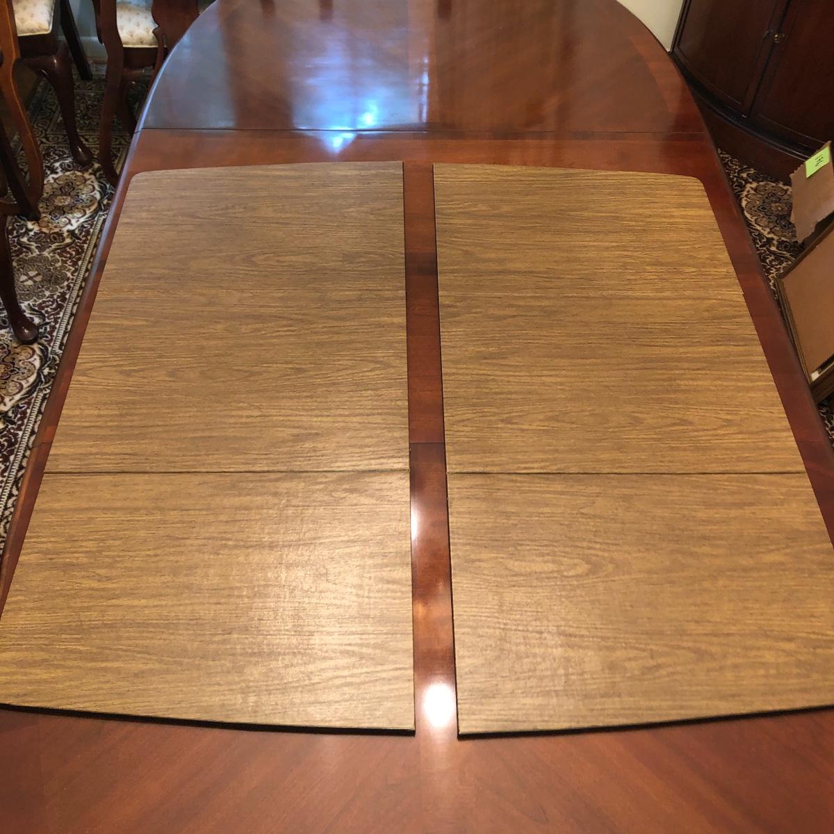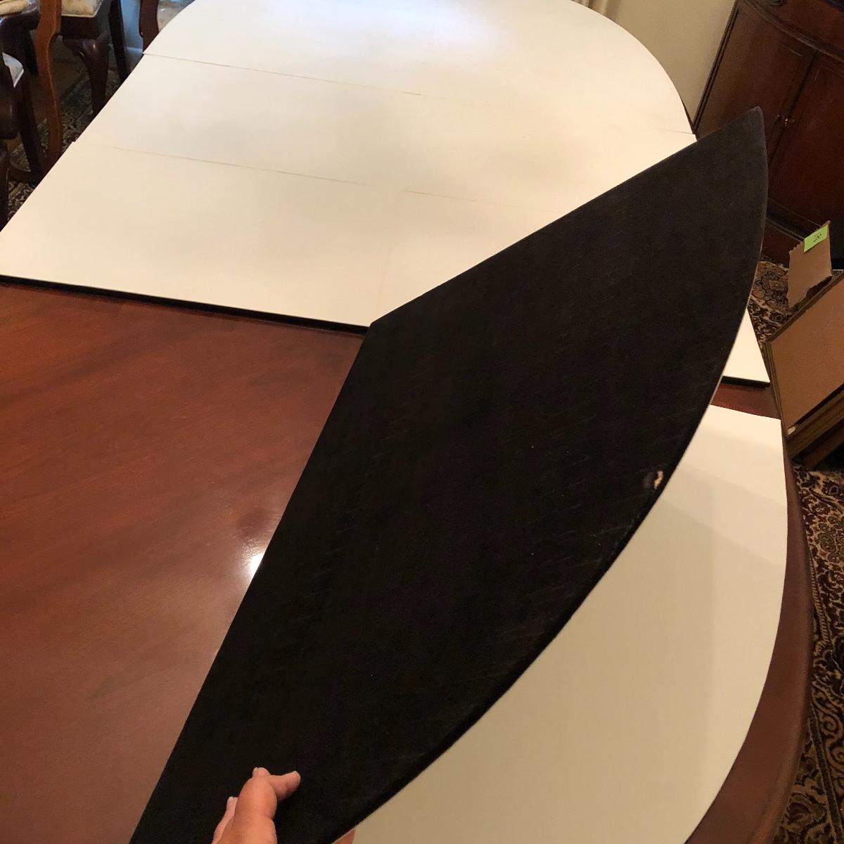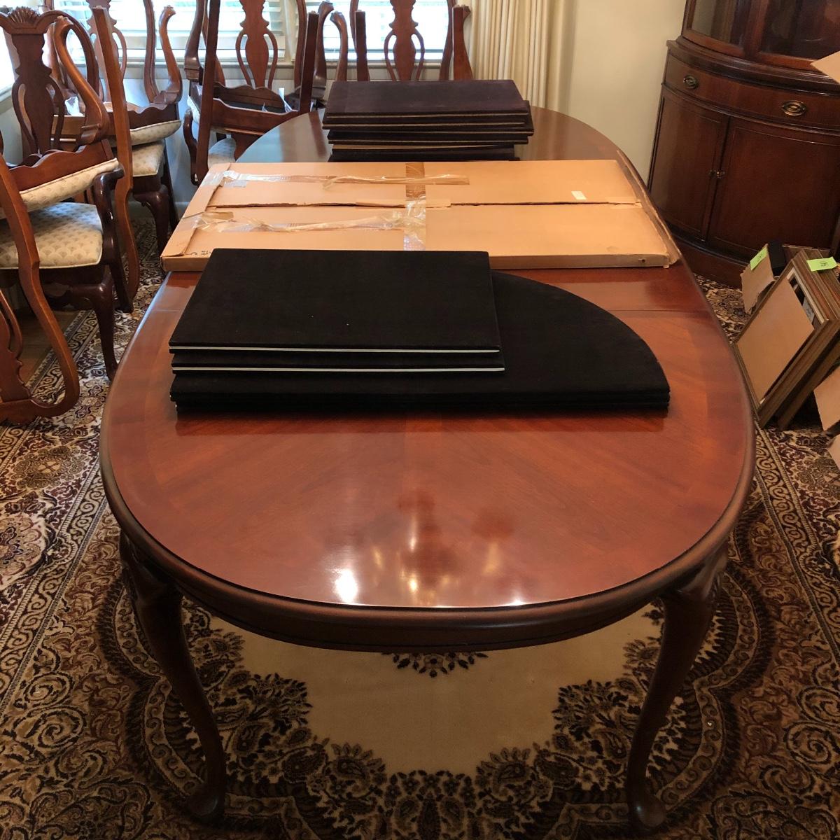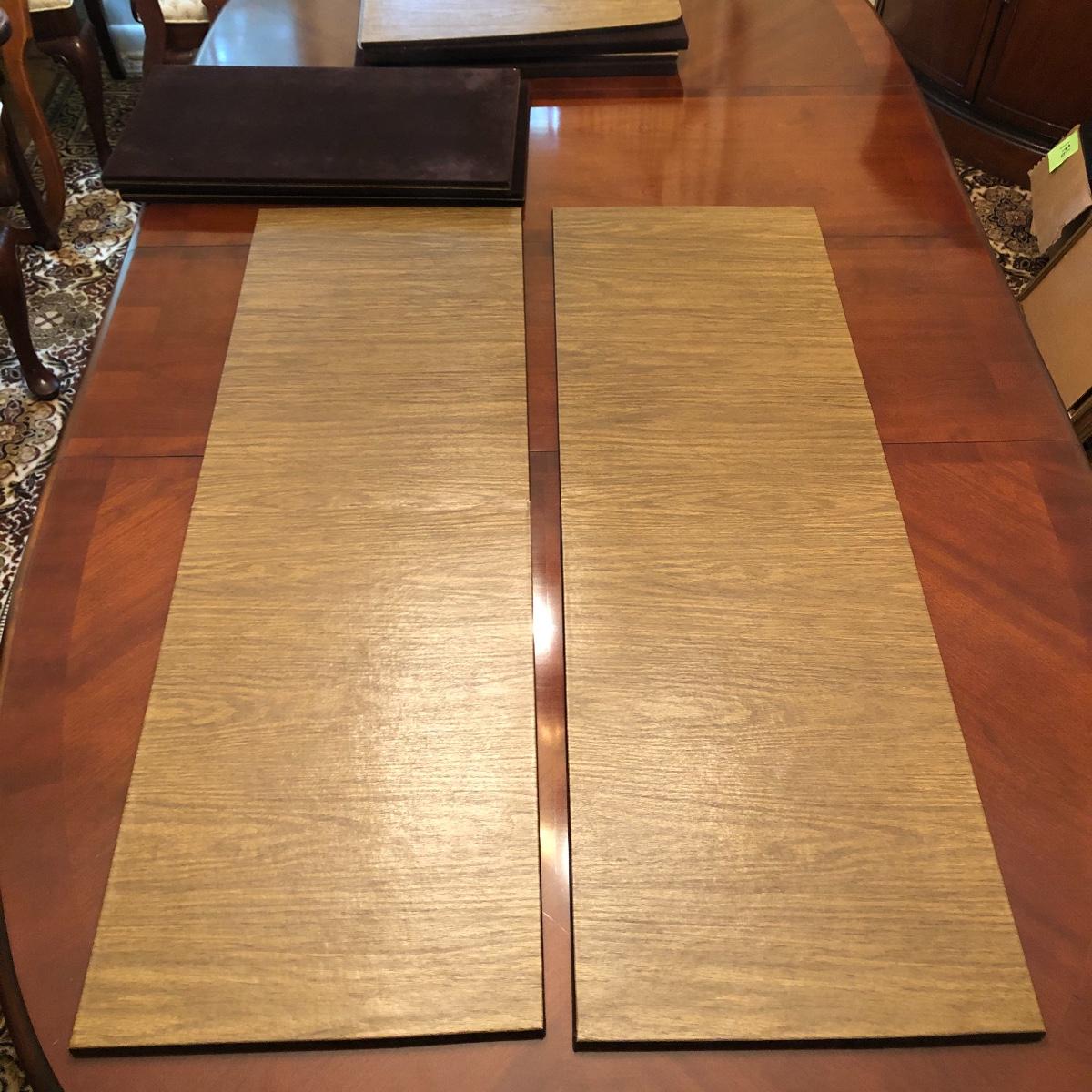 Ornate wood grain with stunning craftsmanship this dining table is great for at least six people dining. Currently measuring 93” x 43” x 29.5”. Removal of leaves decreases length by 15” each. We have 8 dining chairs that are perfect to go with this piece in Lot 185. The white table pads that were originally on this table, four total, are included alongside a spare set of six table pads. The second set of table pads have a wood grain texture and seem to be for a rectangular table. If you love games nights or gatherings, this table and protective pads are great for easy clean up and extra space!
